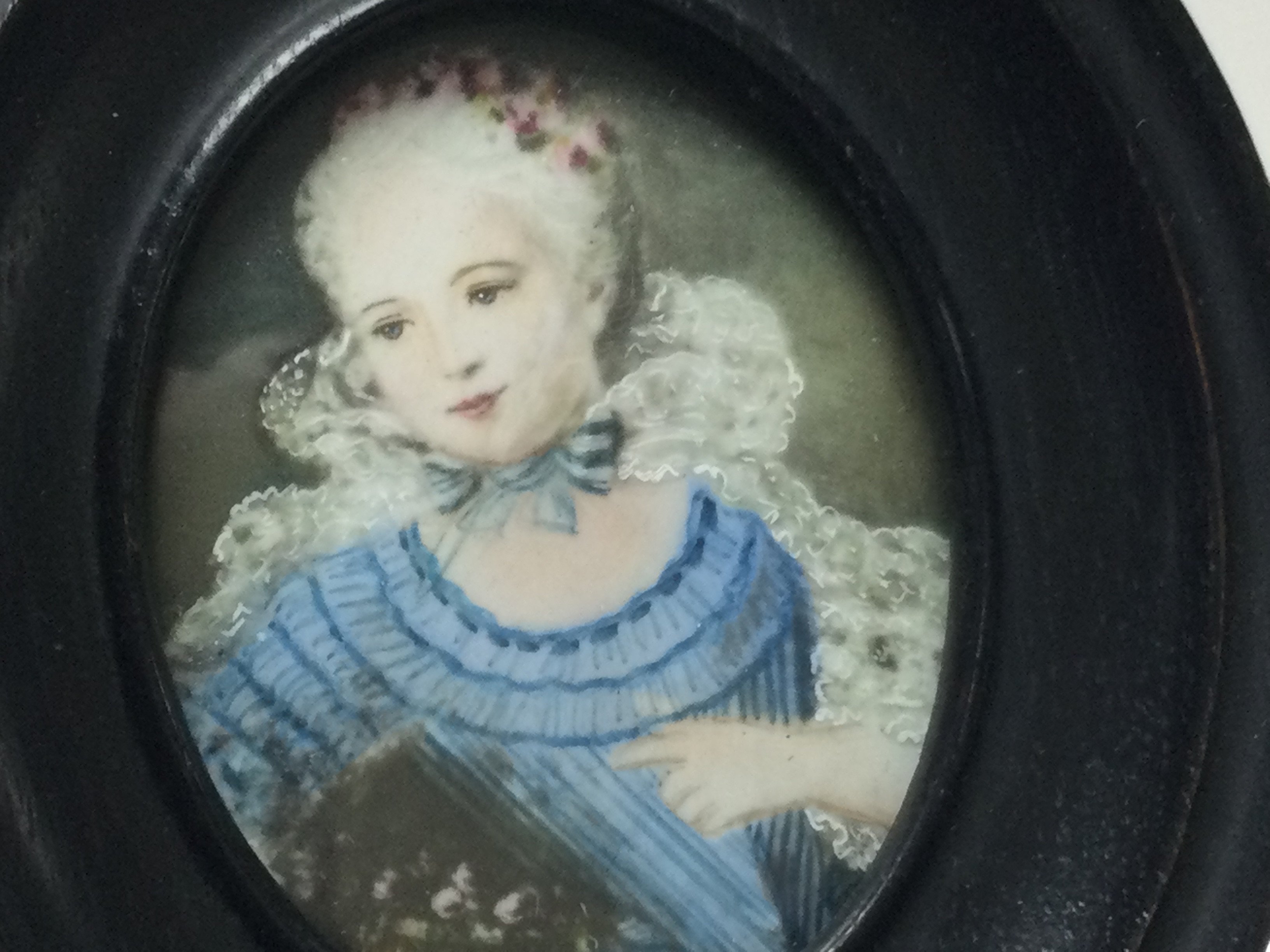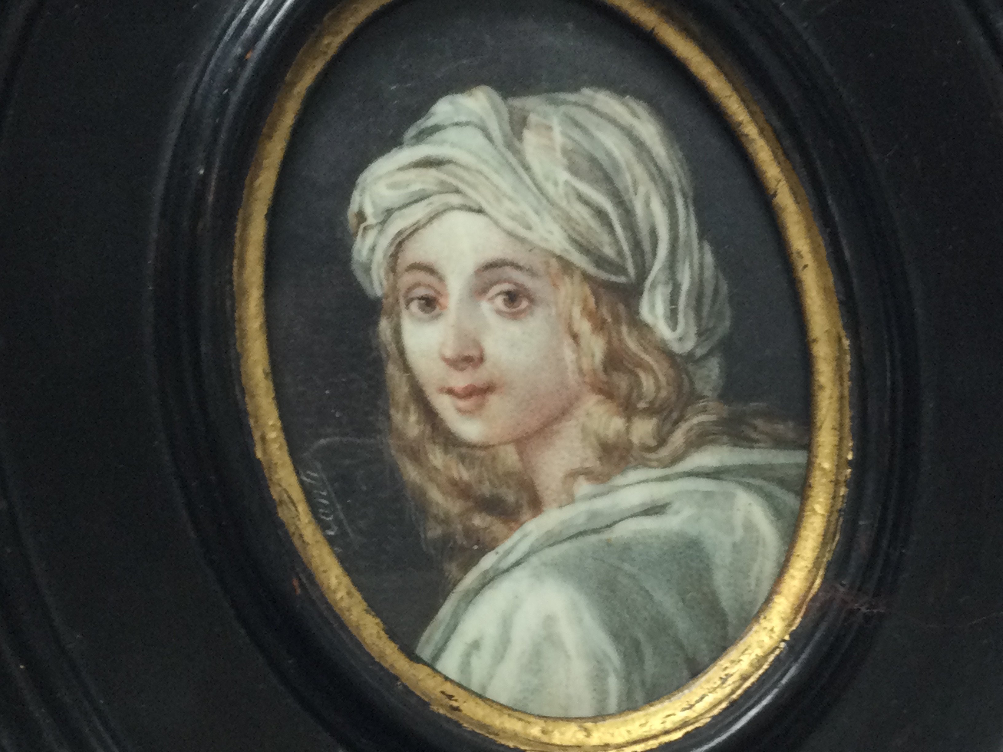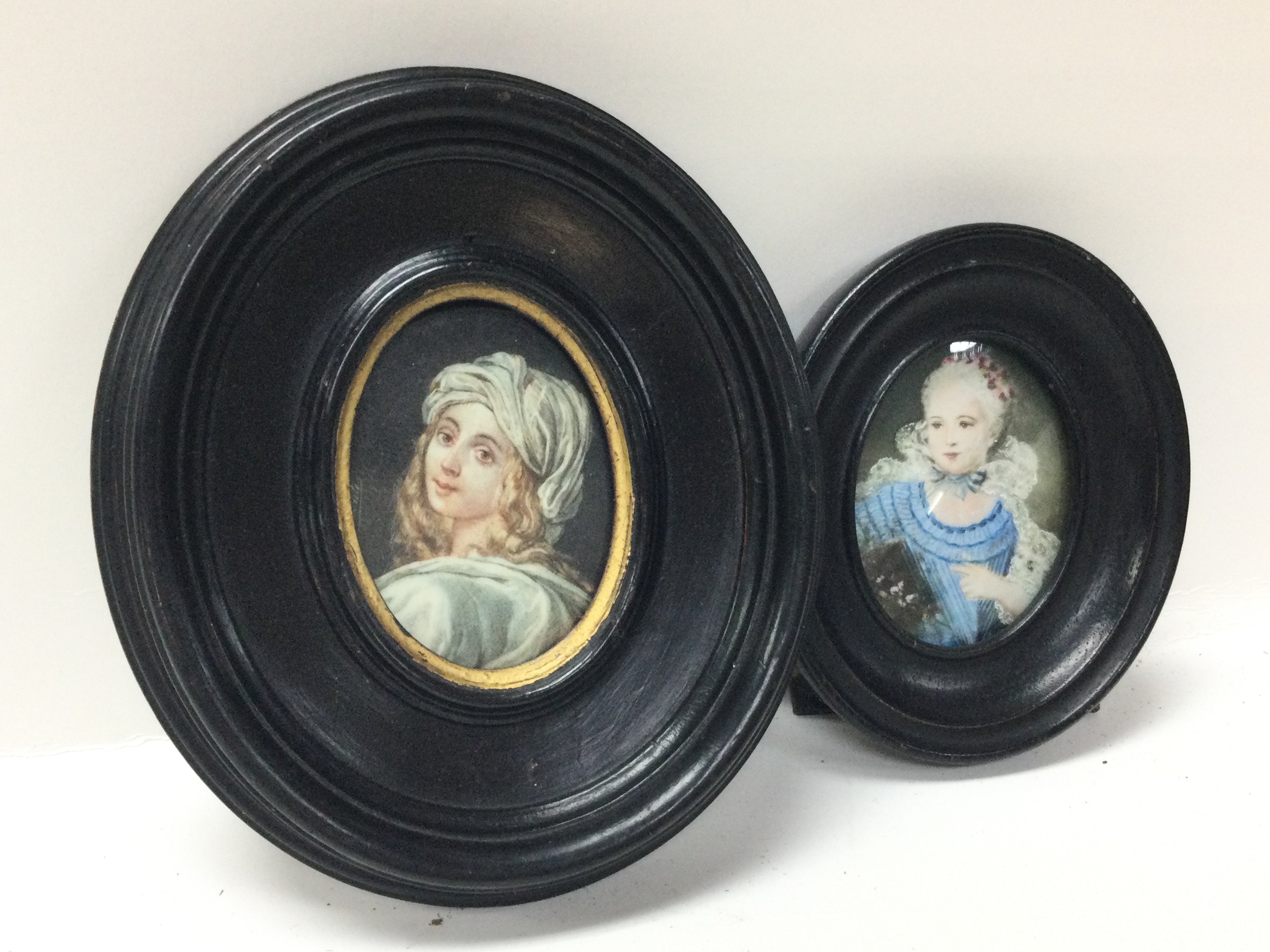 Small miniature painting of a young lady together with a smaller child in a period dress. 10 and 14cm tall. This lot cannot be posted