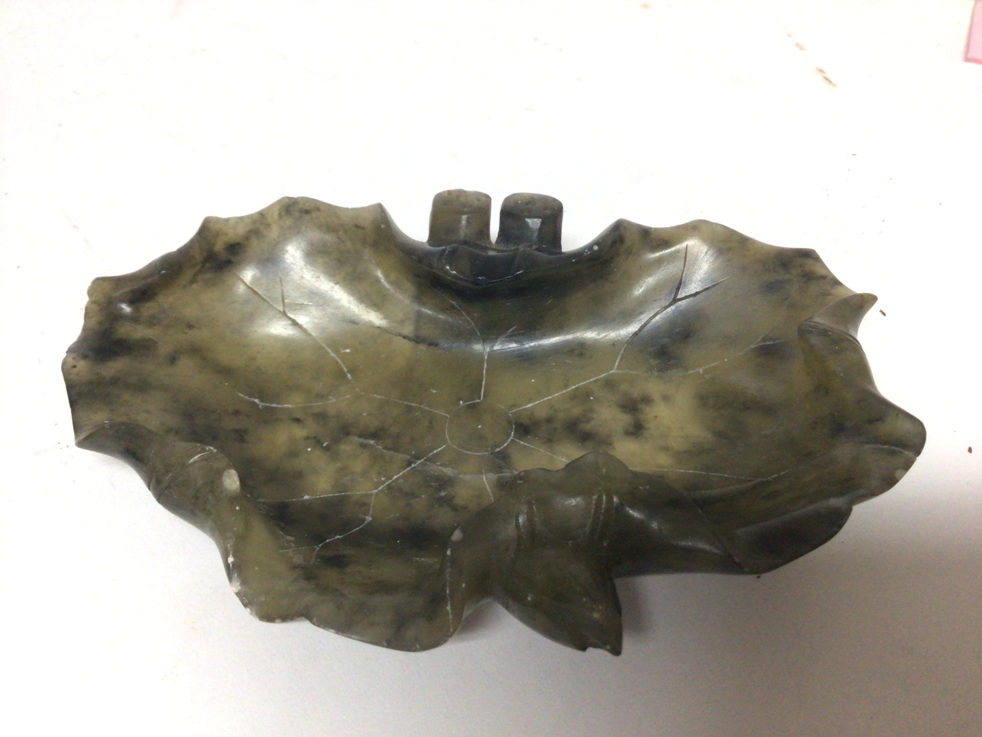 A Chinese spinach jade dish of naturalist form a shaped lotus leaf possible early 20th century. 13x9cm NO RESERVE
