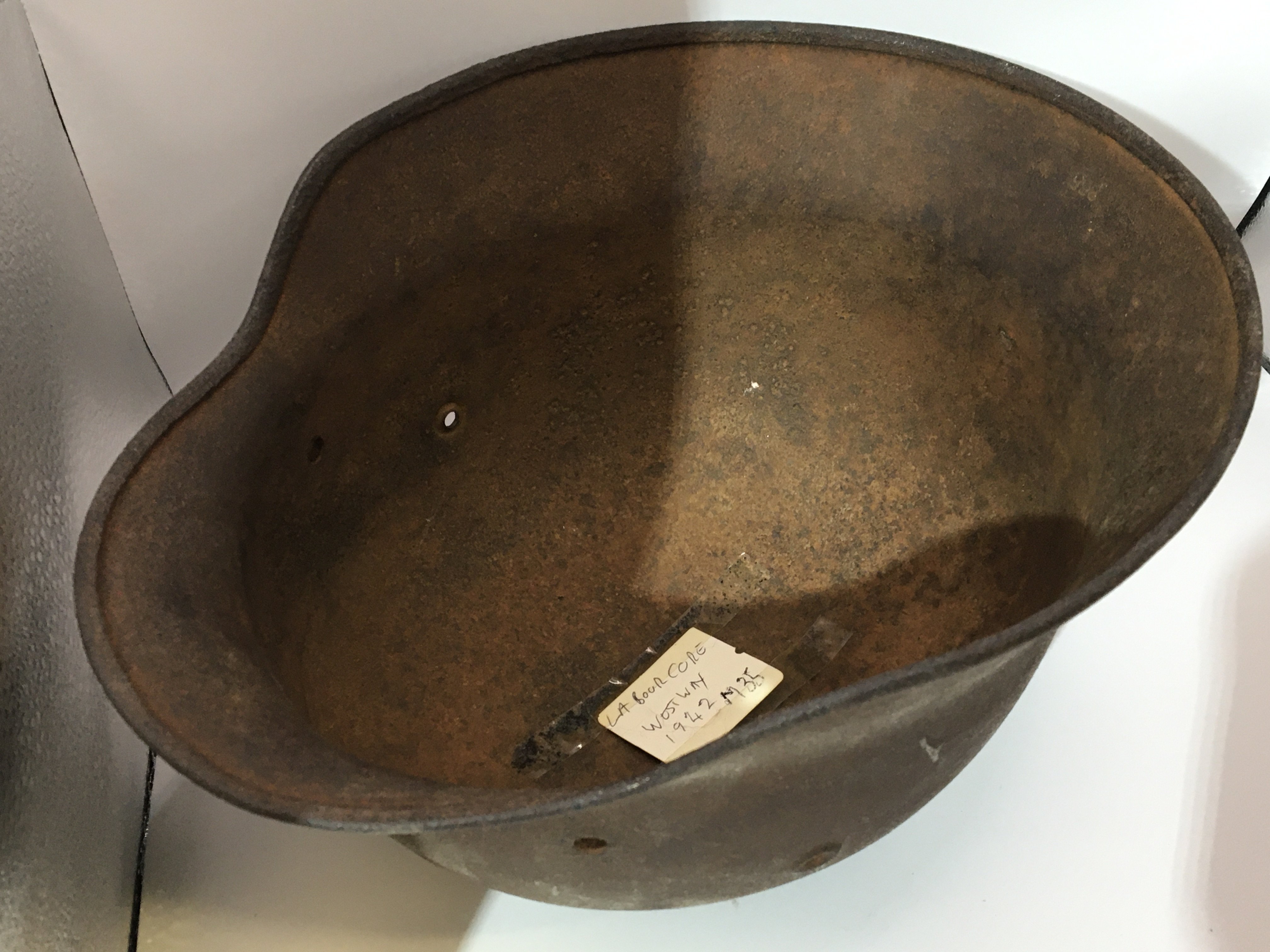 A German Third Reich Steel helmet with faded side decal possible M35 pattern no inner lining. Circa 1942