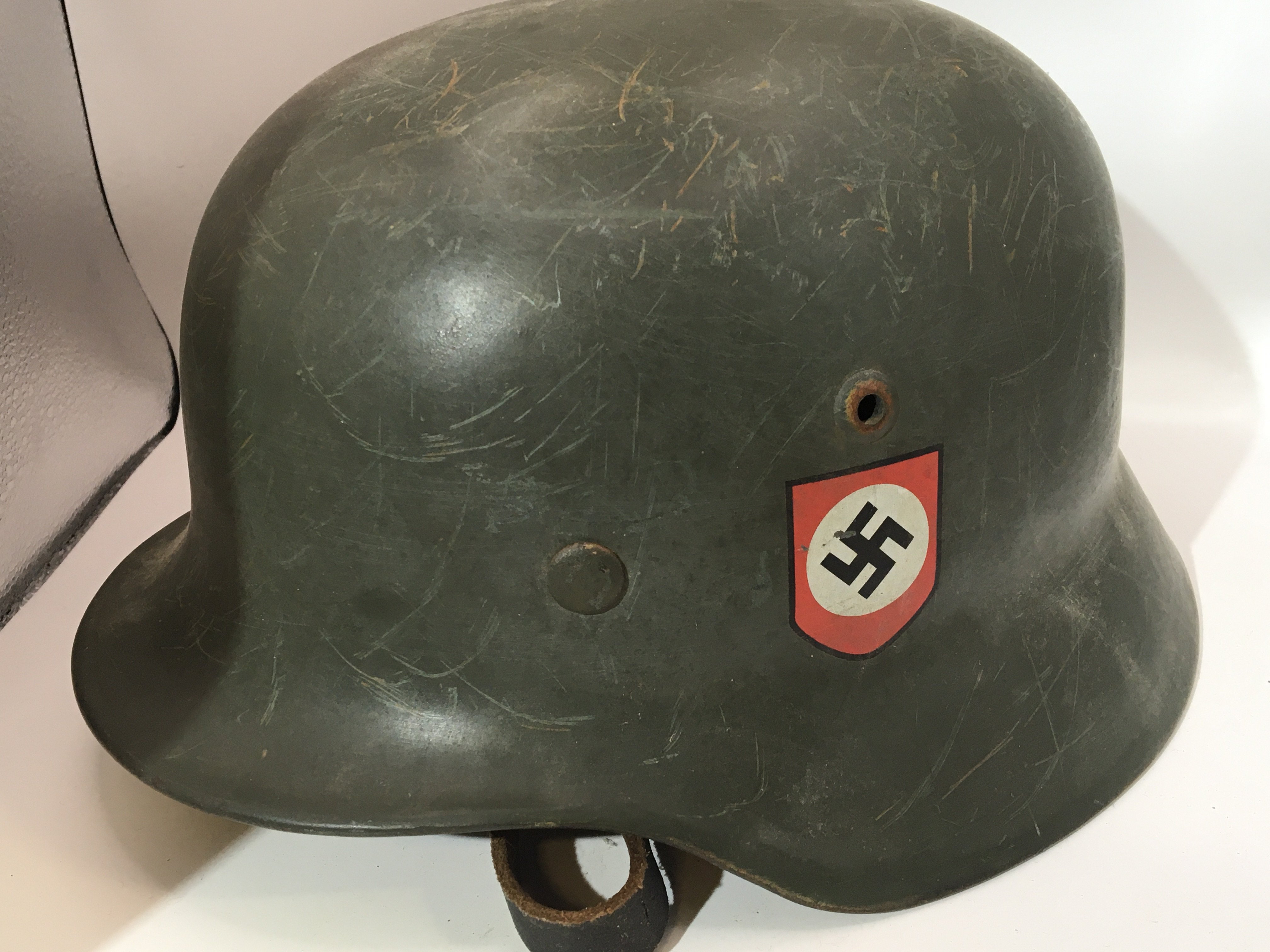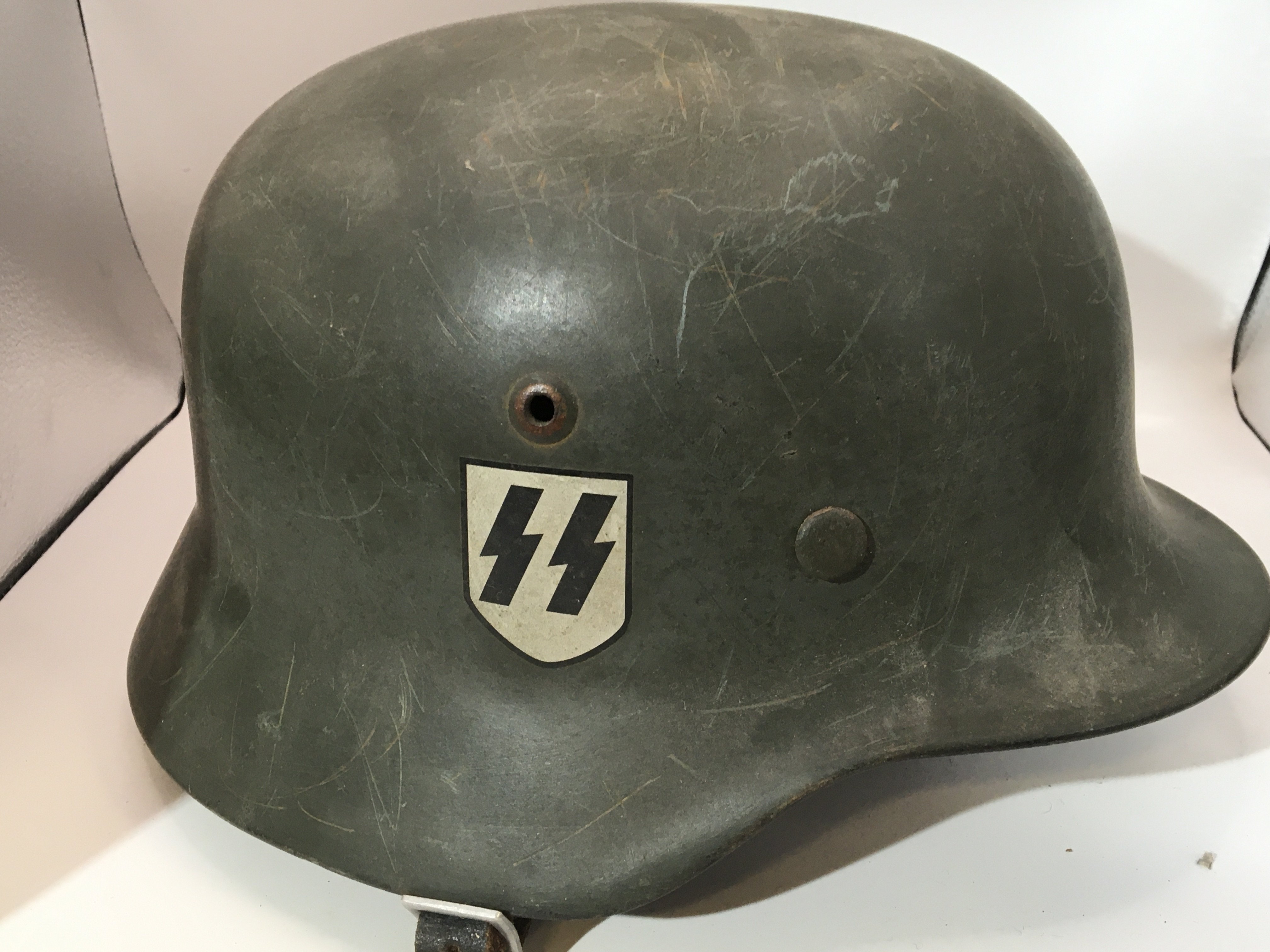 A German Third Reich steel helmet M35 pattern with double sided decal SS and swastika green finish The inner stamps Q66 and 192 with leather liner stamped 58 very good condition.