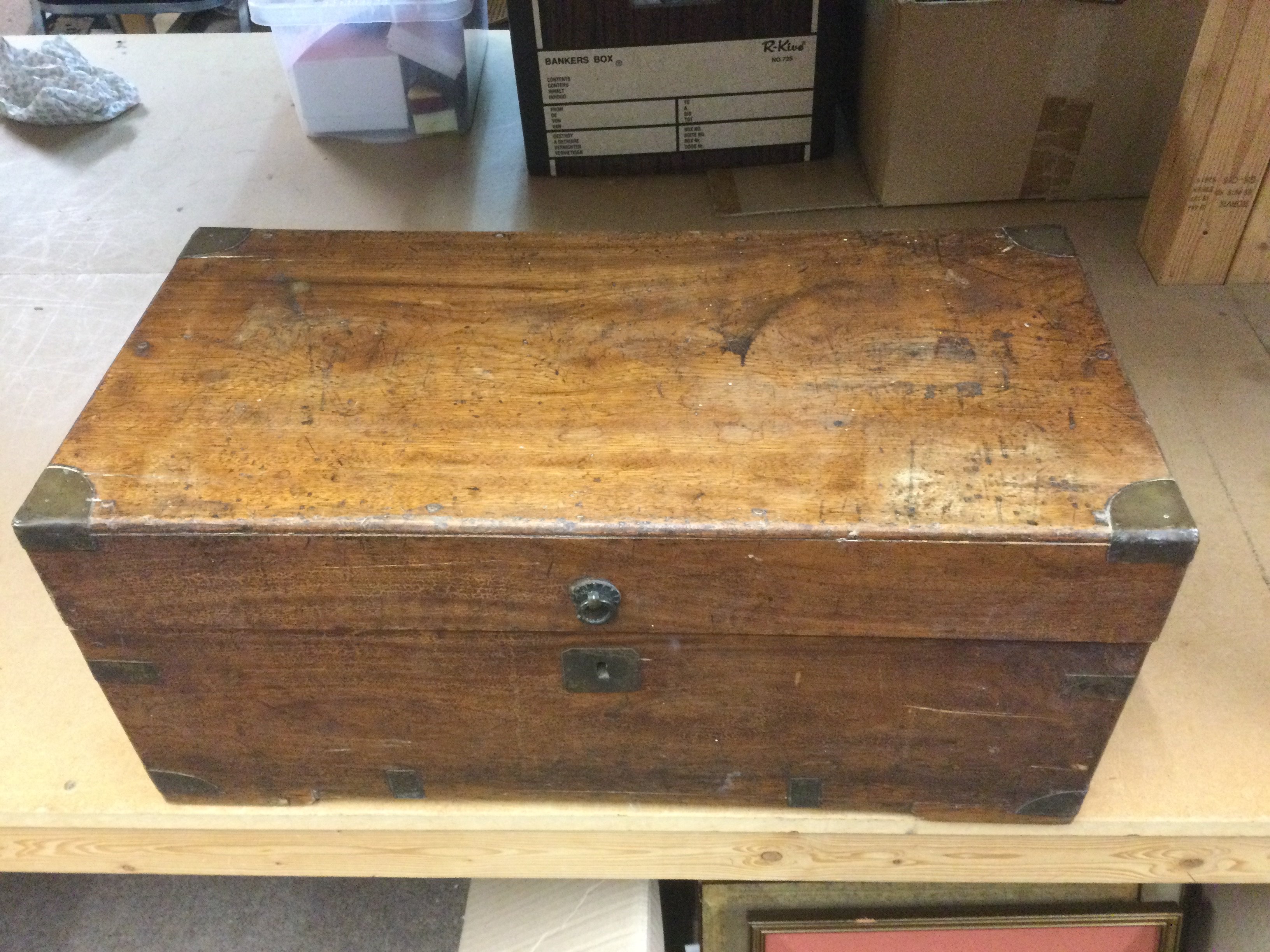 A camphor lined box with brass corners, approx 55cm x 27cm x 25cm. Shipping category D.