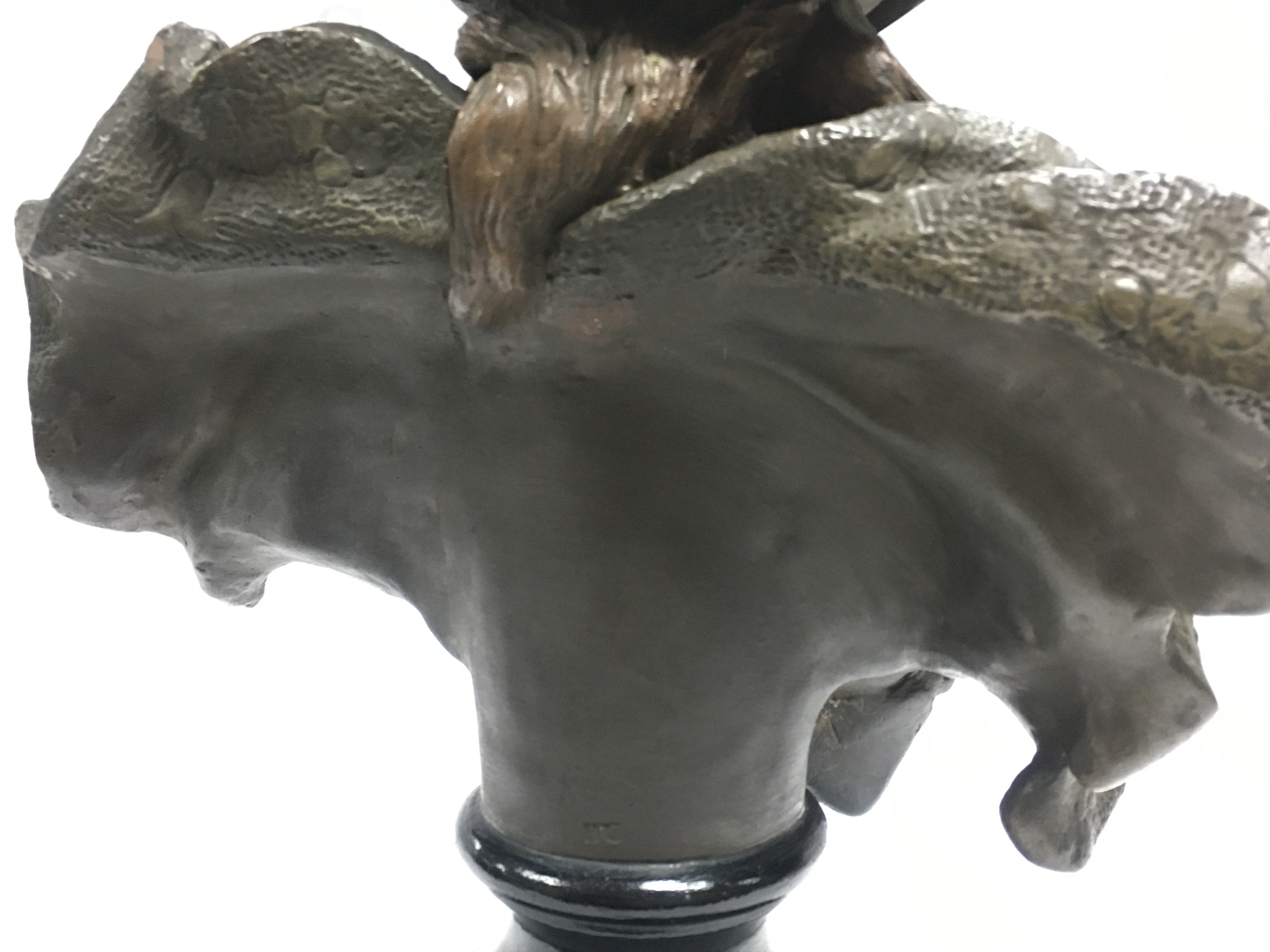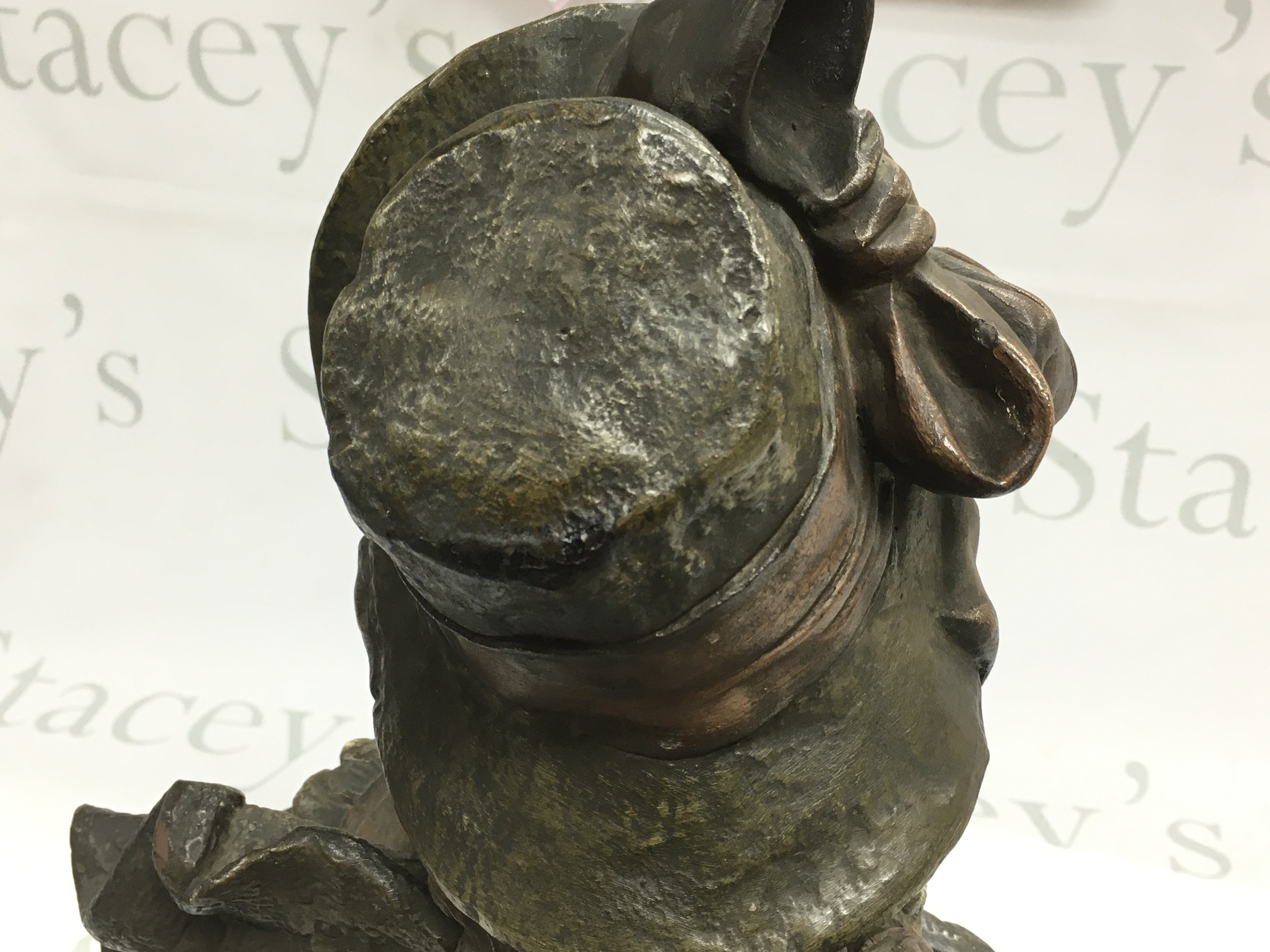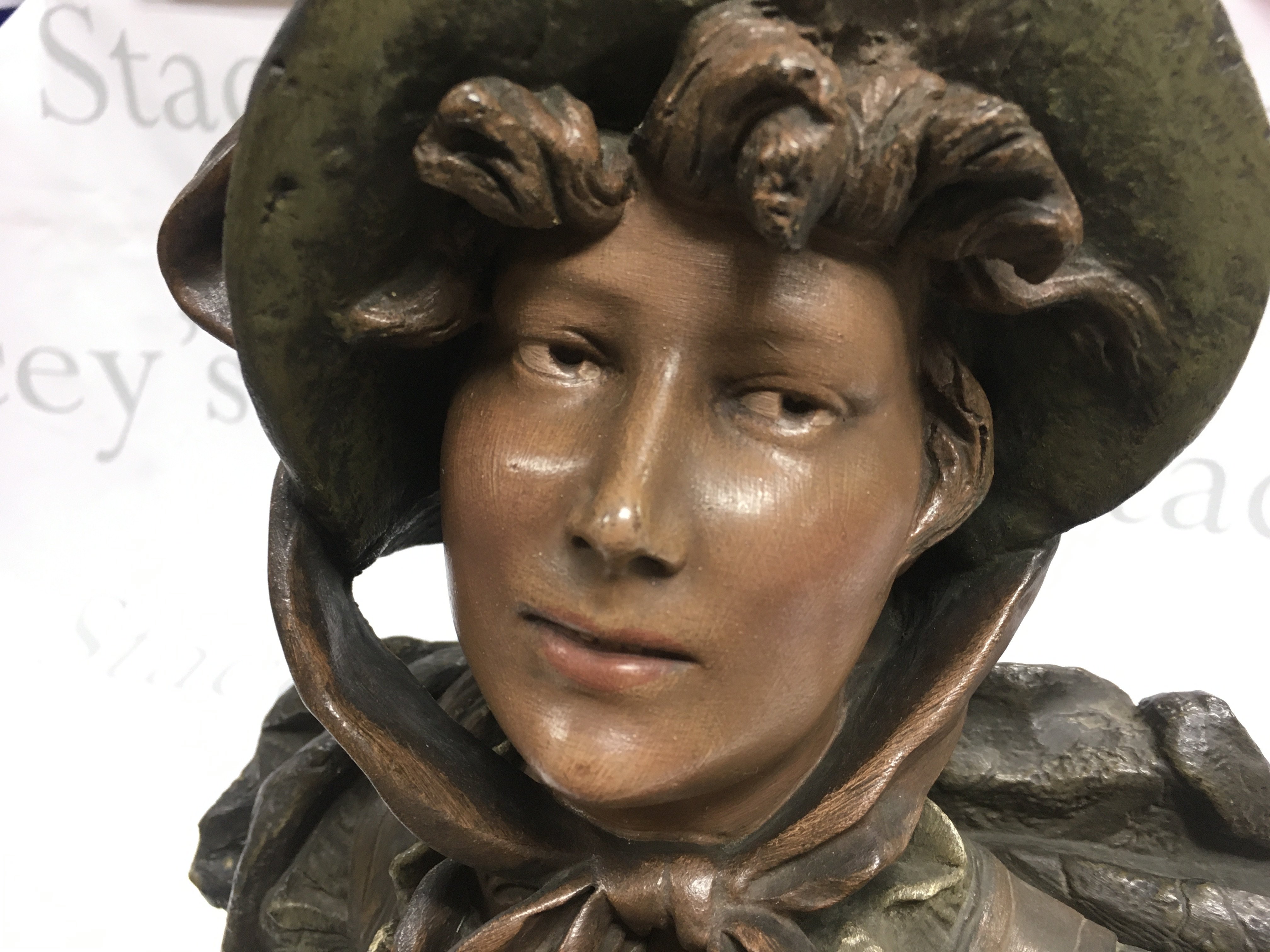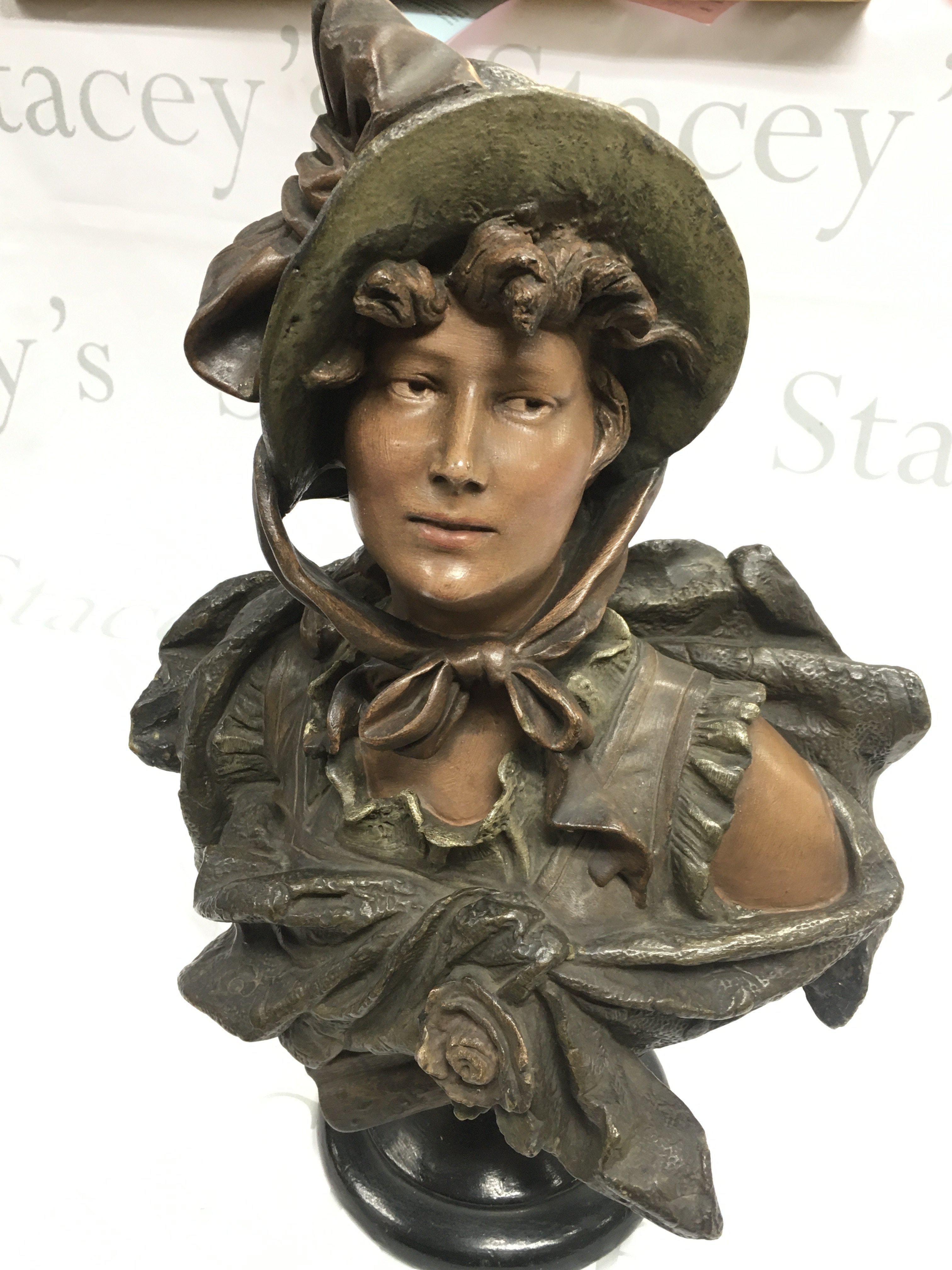 A Victorian terracotta bust of a woman with bonnet , initials to back . 41cm tall. This lot cannot be posted