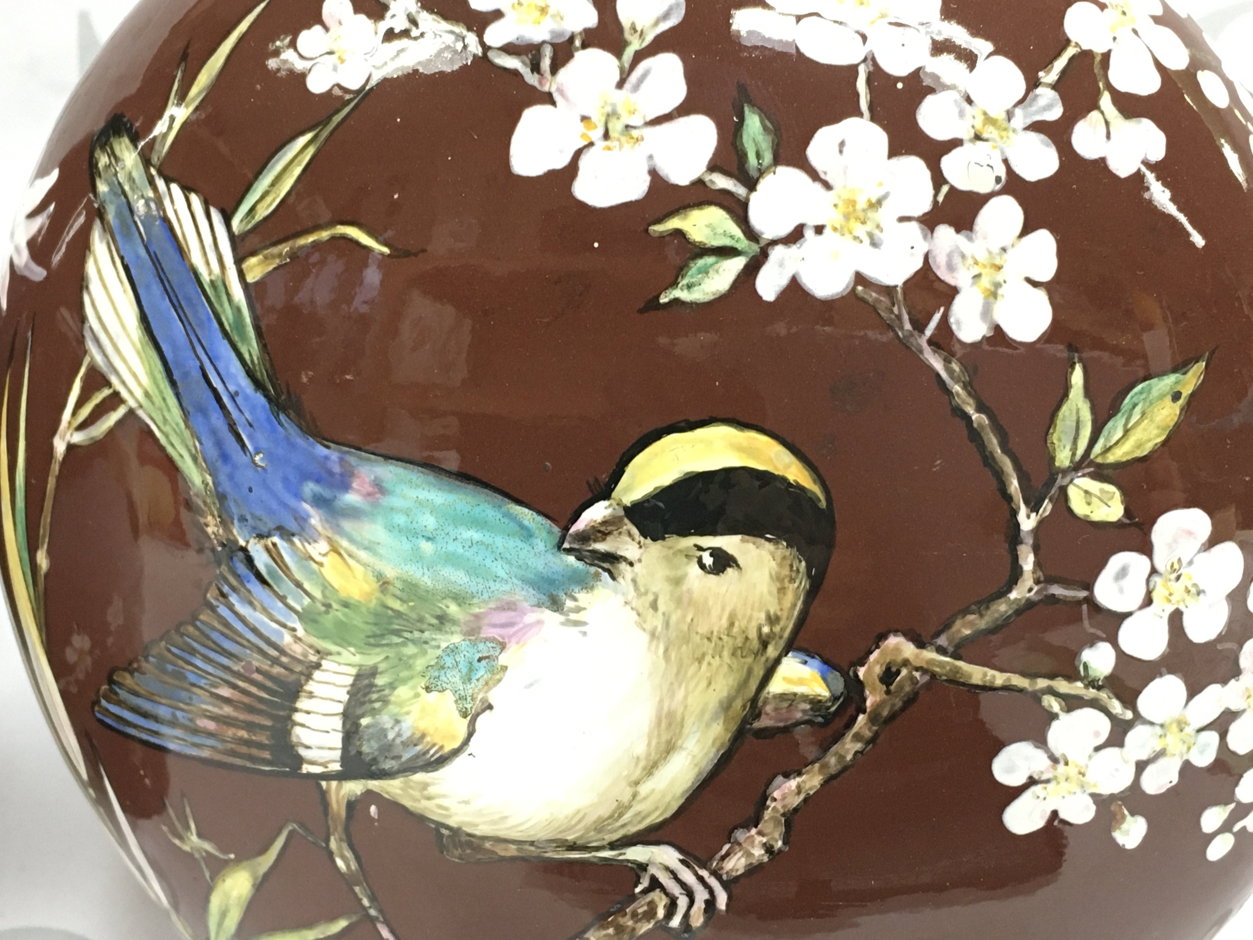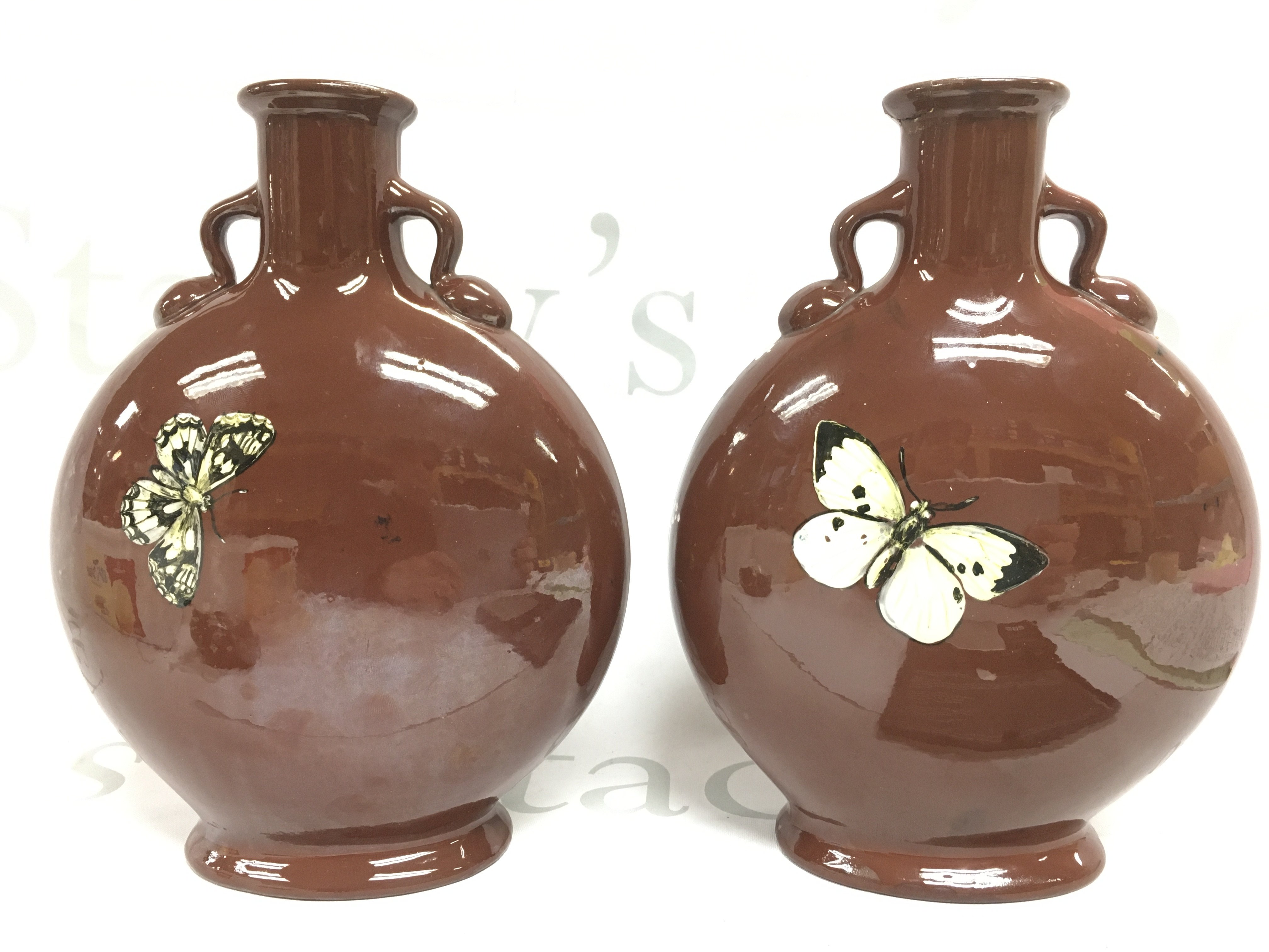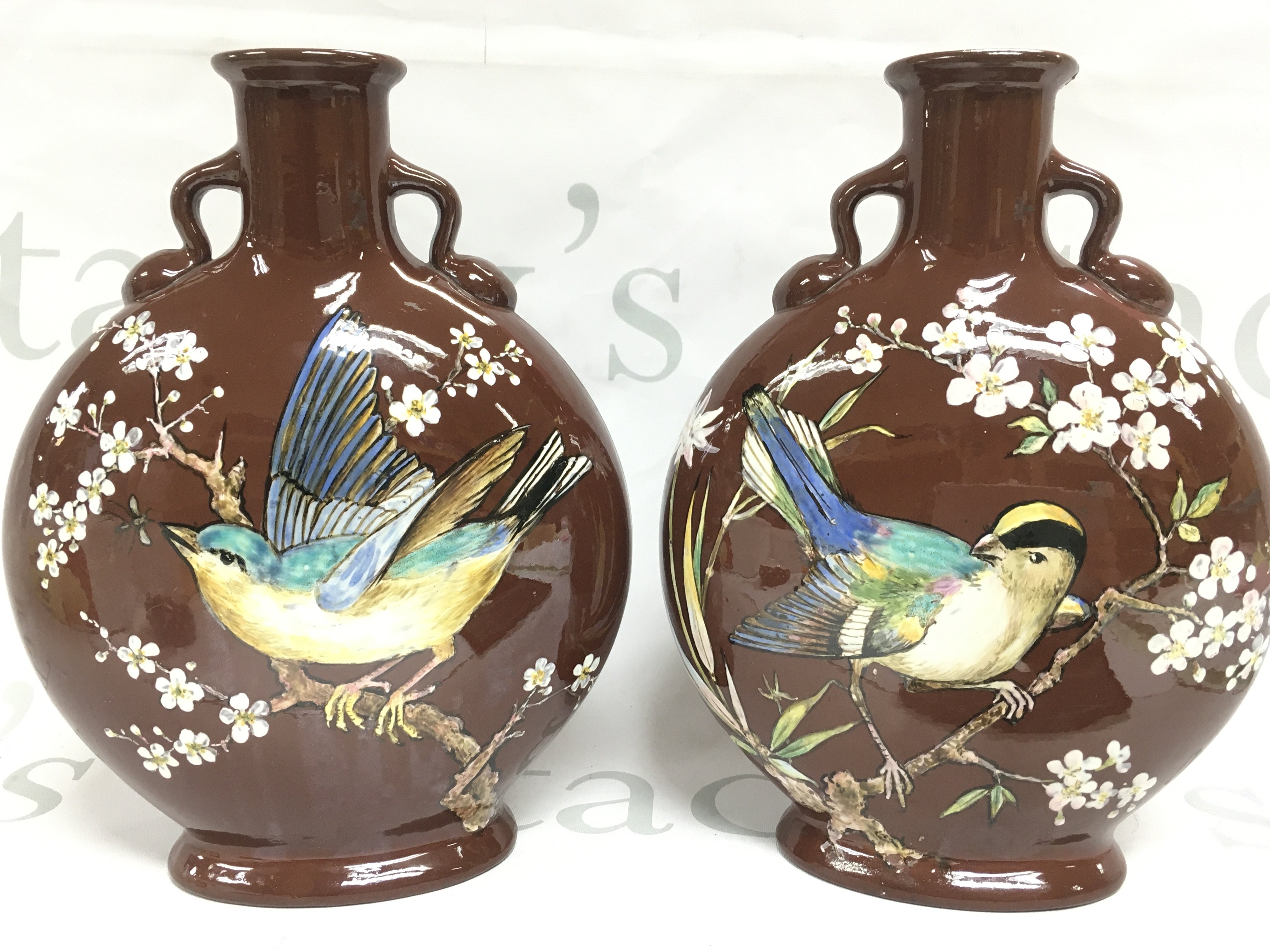 19th century Minton Kensington Art Pottery moon flasks, painted in the London Art Pottery Studio, South Kensington, with a Japanesque style birds on flowering plants and butterflies on opposite sides 20.5cm tall. (restoration seen on the neck of the vase on the right) This lot cannot be posted