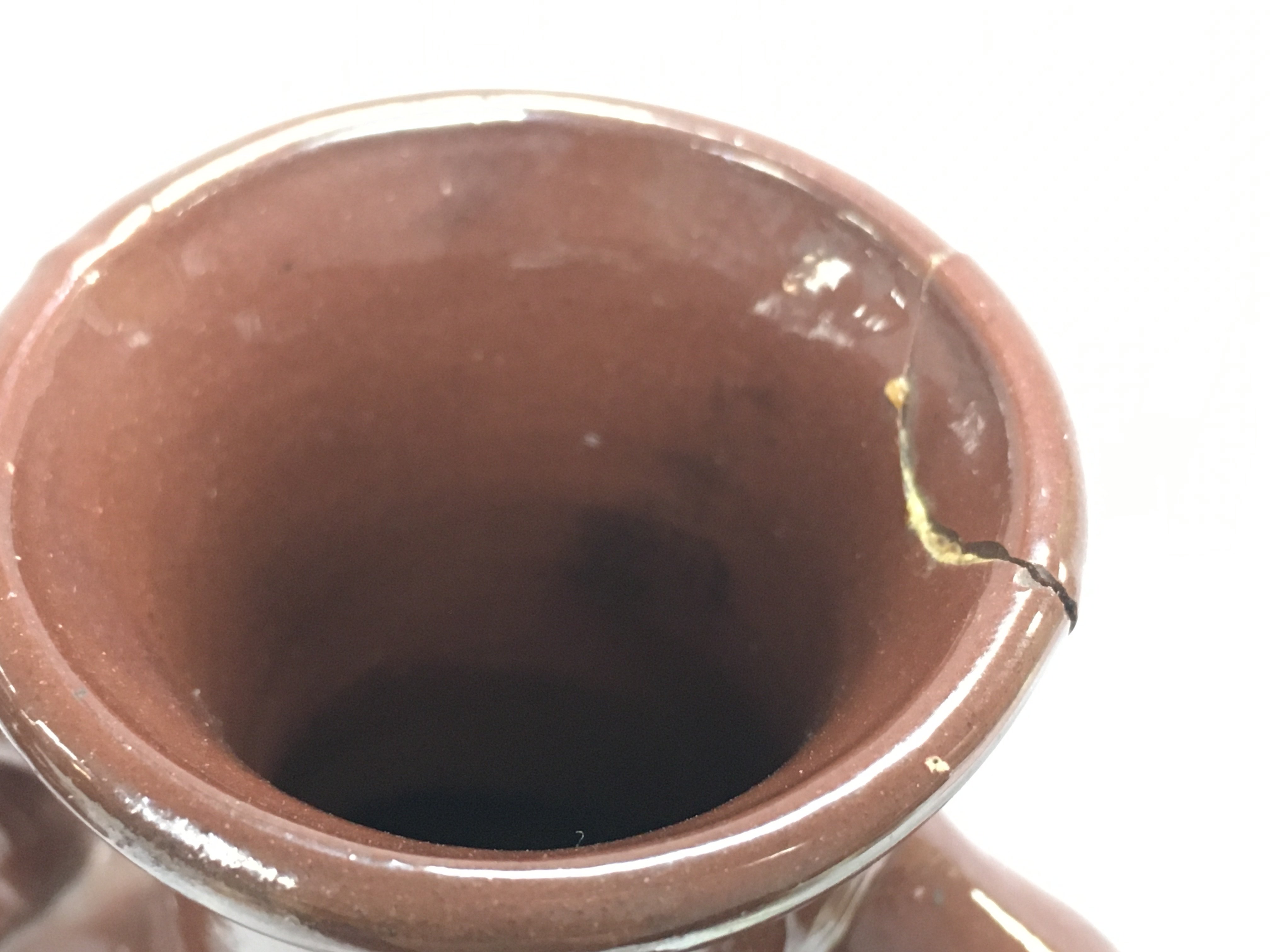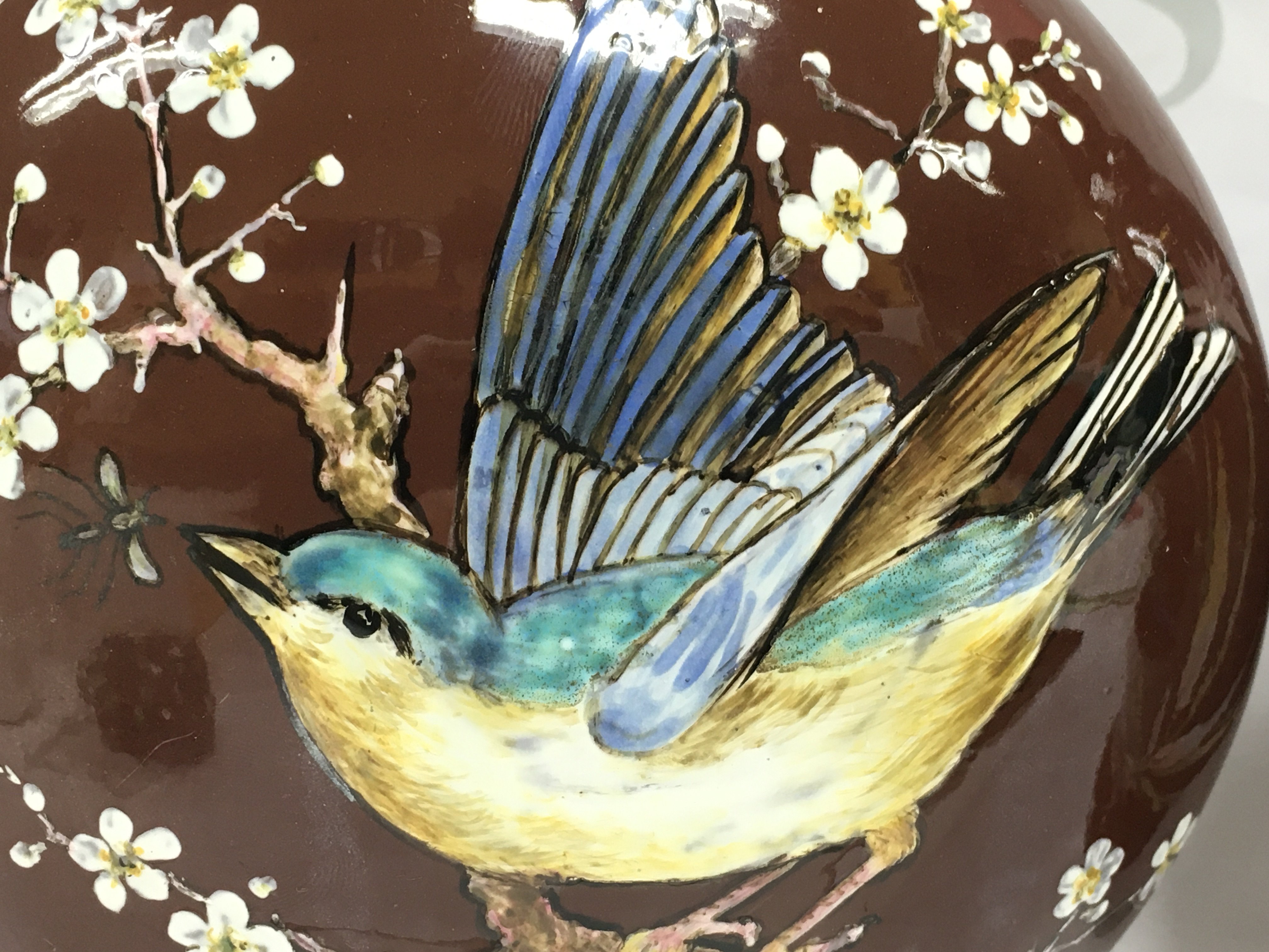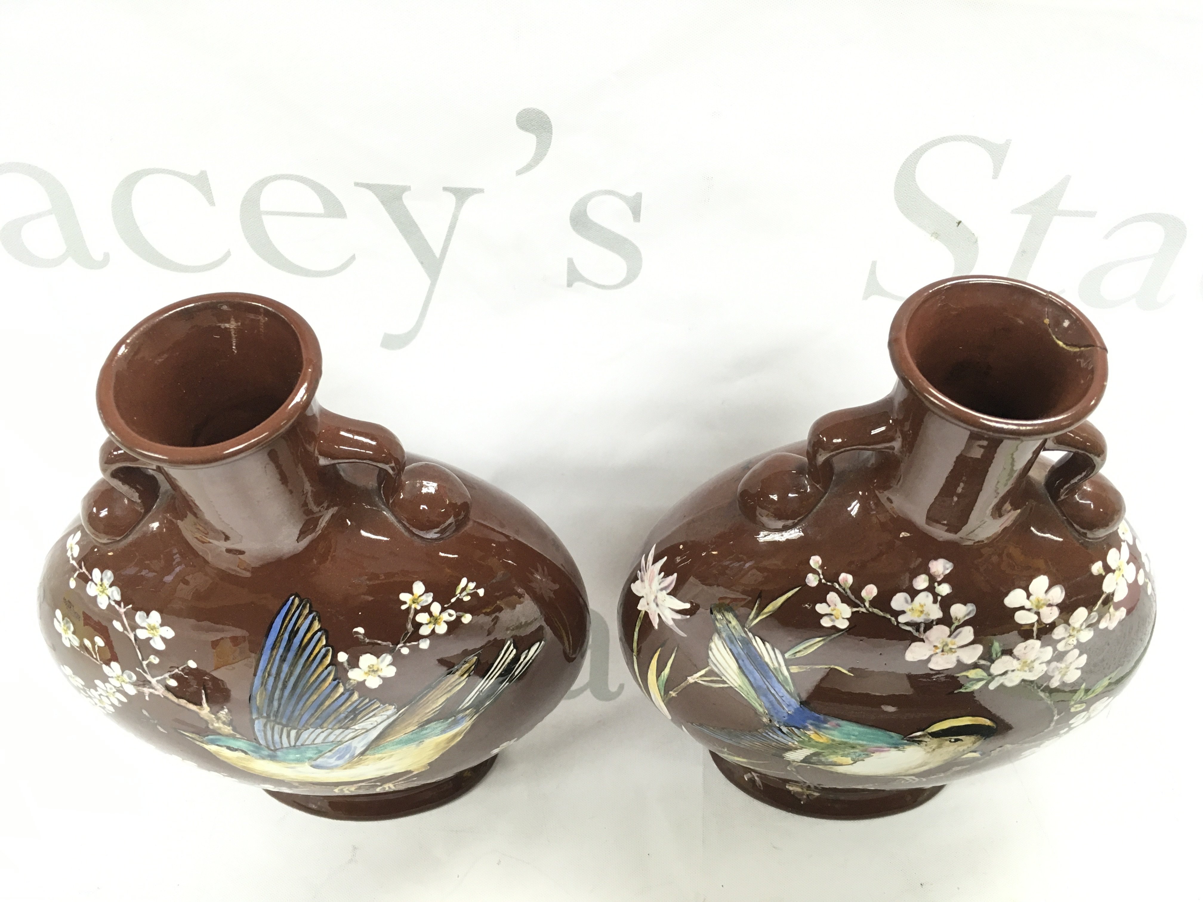 19th century Minton Kensington Art Pottery moon flasks, painted in the London Art Pottery Studio, South Kensington, with a Japanesque style birds on flowering plants and butterflies on opposite sides 20.5cm tall. (restoration seen on the neck of the vase on the right) This lot cannot be posted