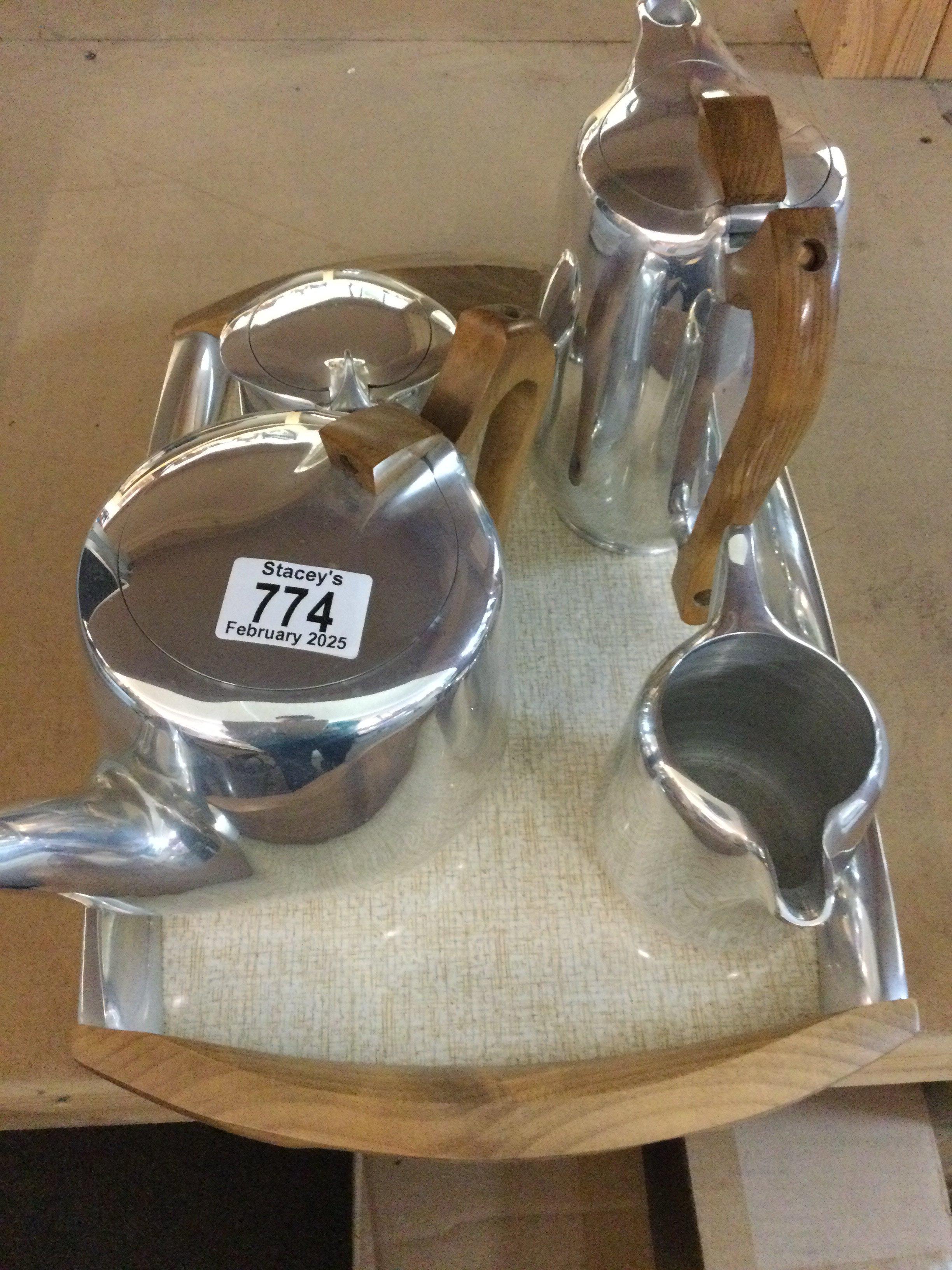 A picquot tea pot coffee pot milk jug and sugar bowl with tray .