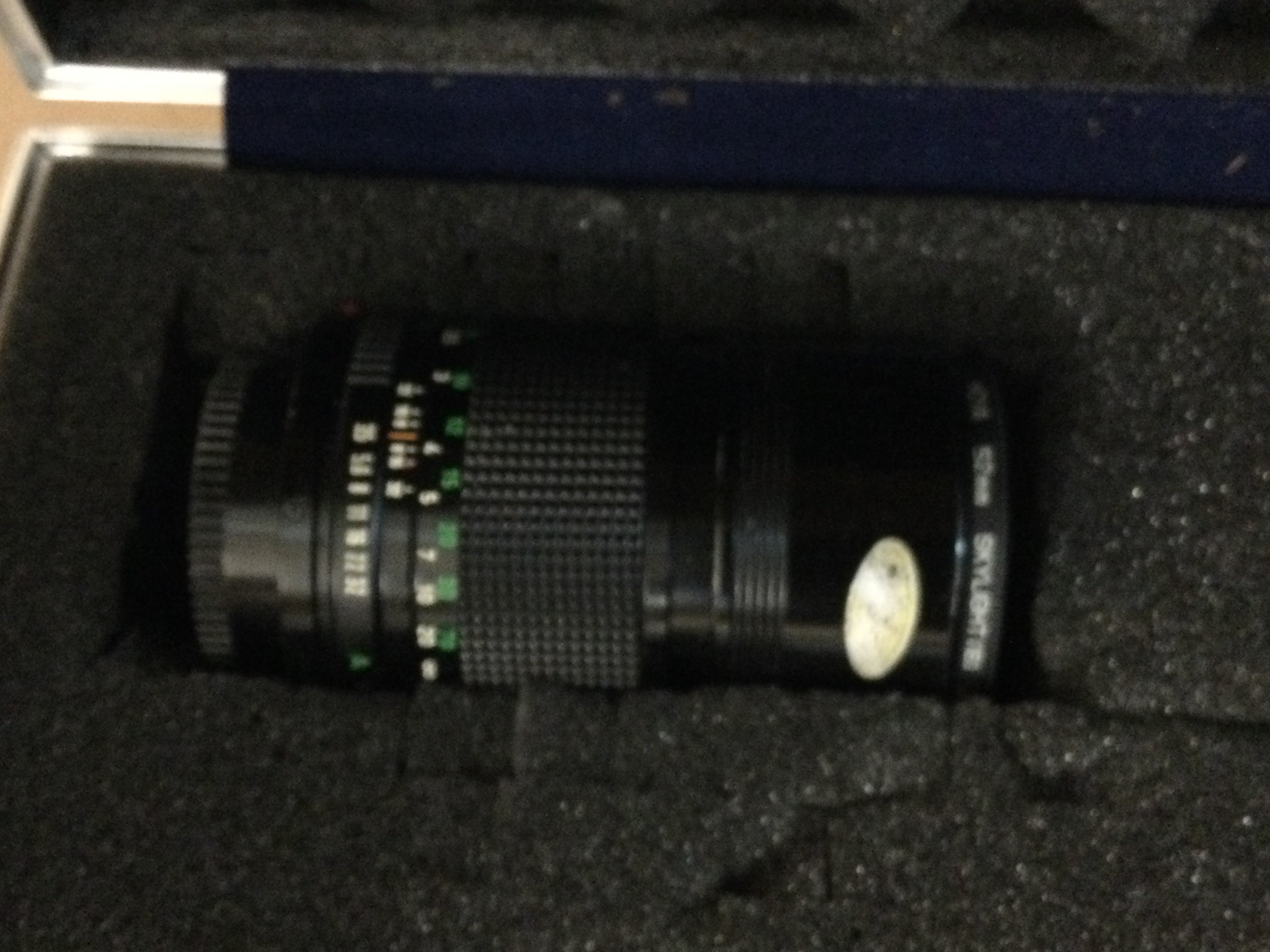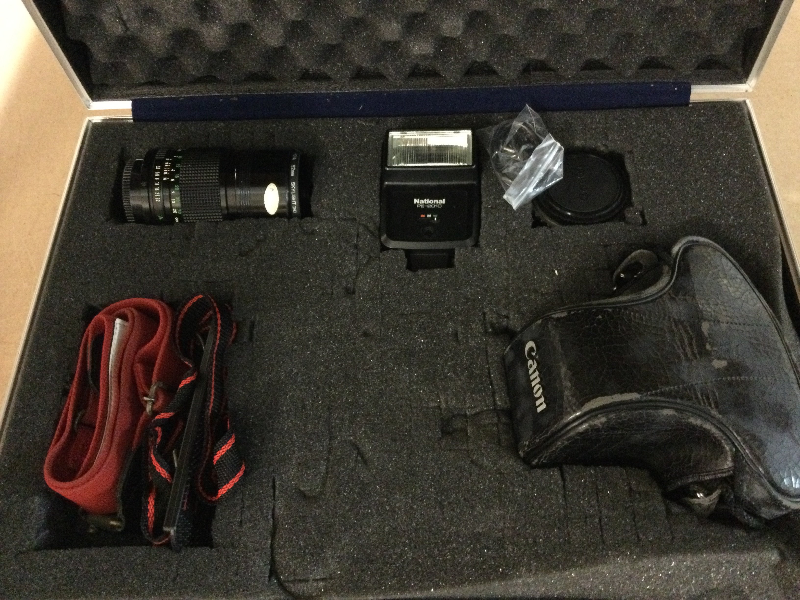 A cased cannon camera with flash and lens.