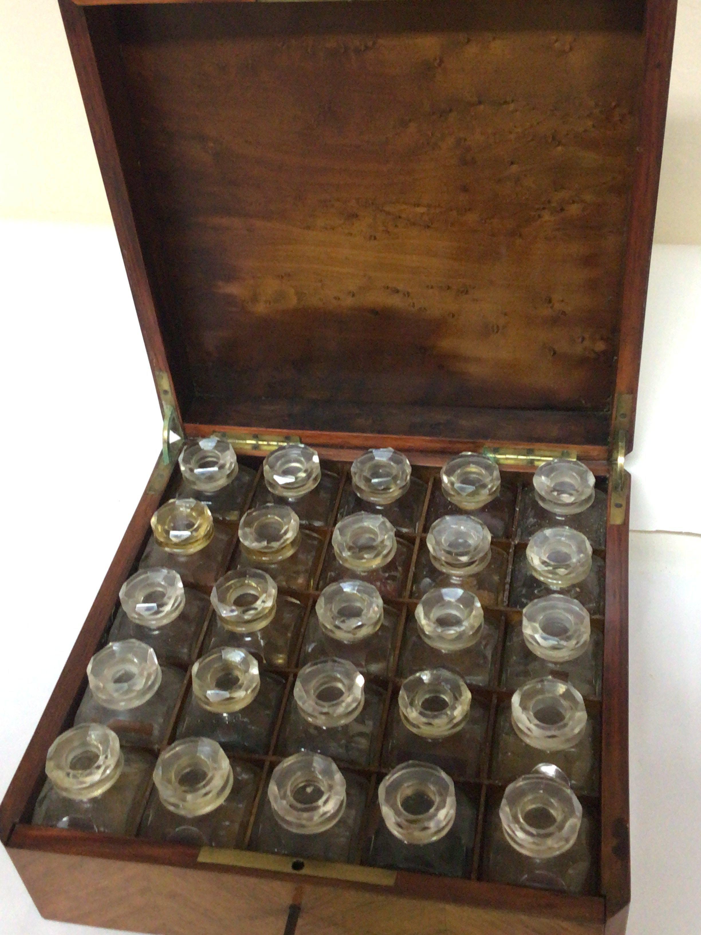 An early 20th century perfume and scent sample box with a well fitted interior with twenty cut glass scent/perfume bottles.