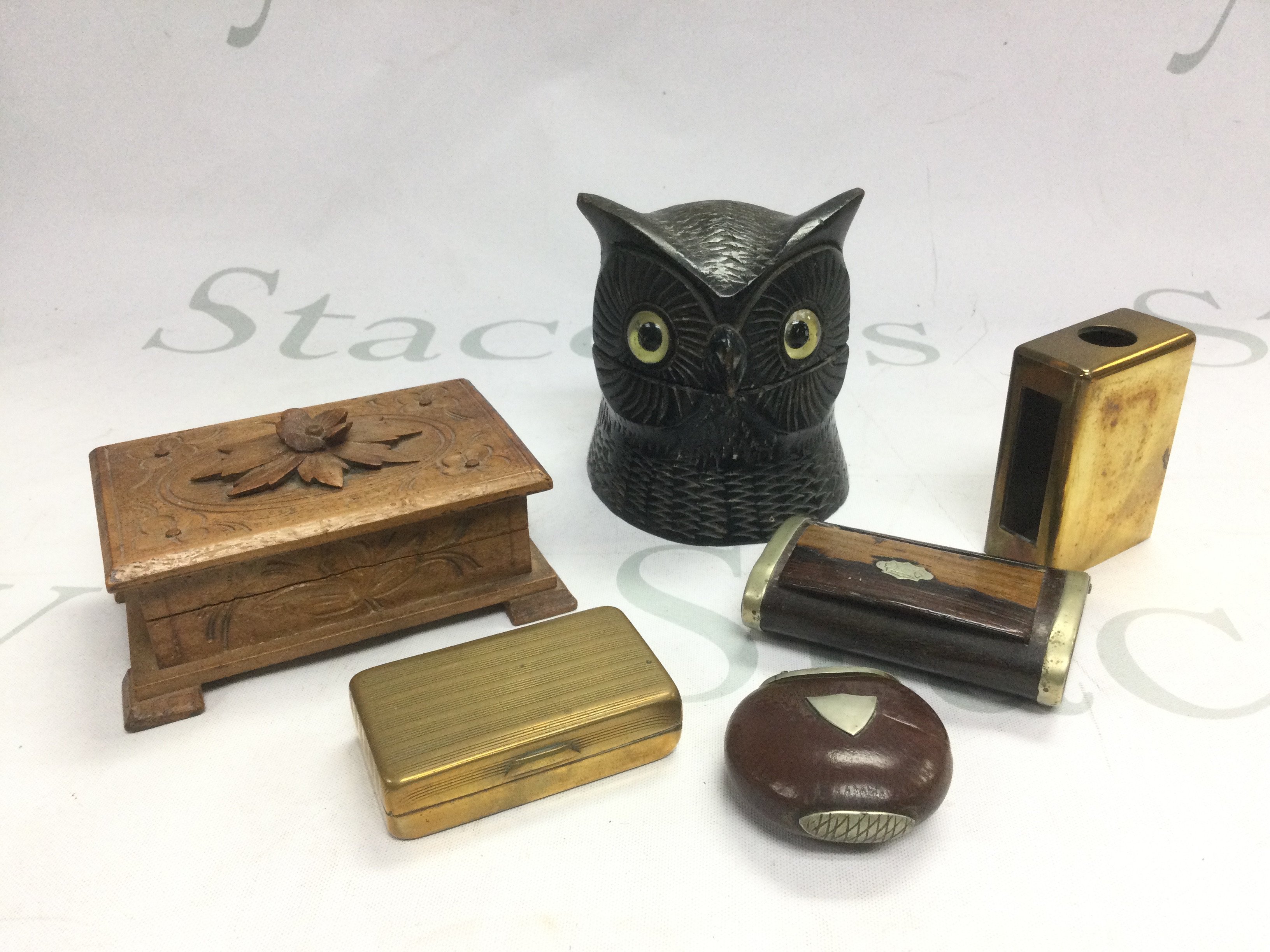 A Black Forest carved inkwell in the form of an owl, a vesta case in the form of a nut etc. Shipping category B.