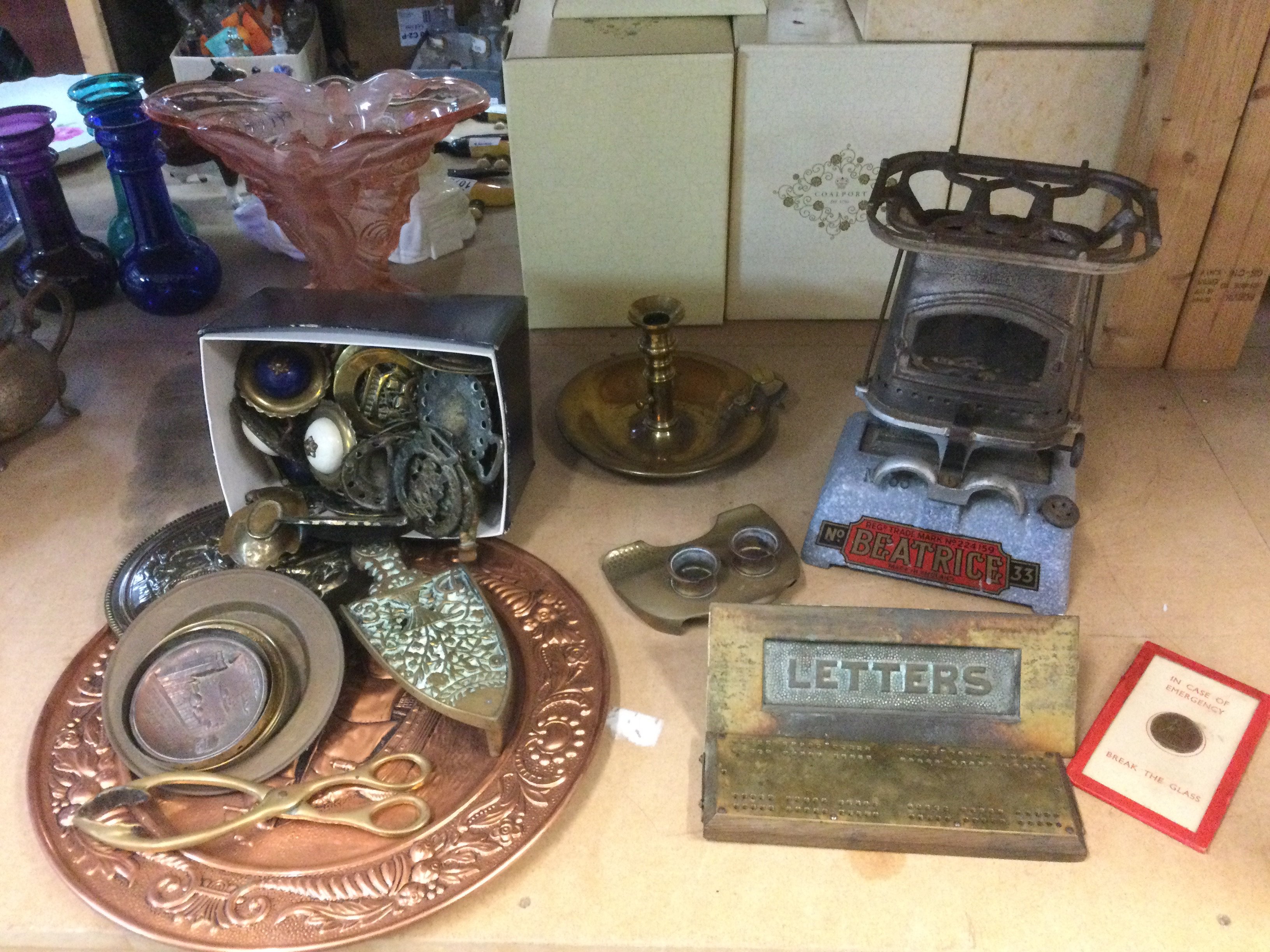 A Beatrice No3 oil lamp, collection of horse brasses and other metalware items. Shipping category D.