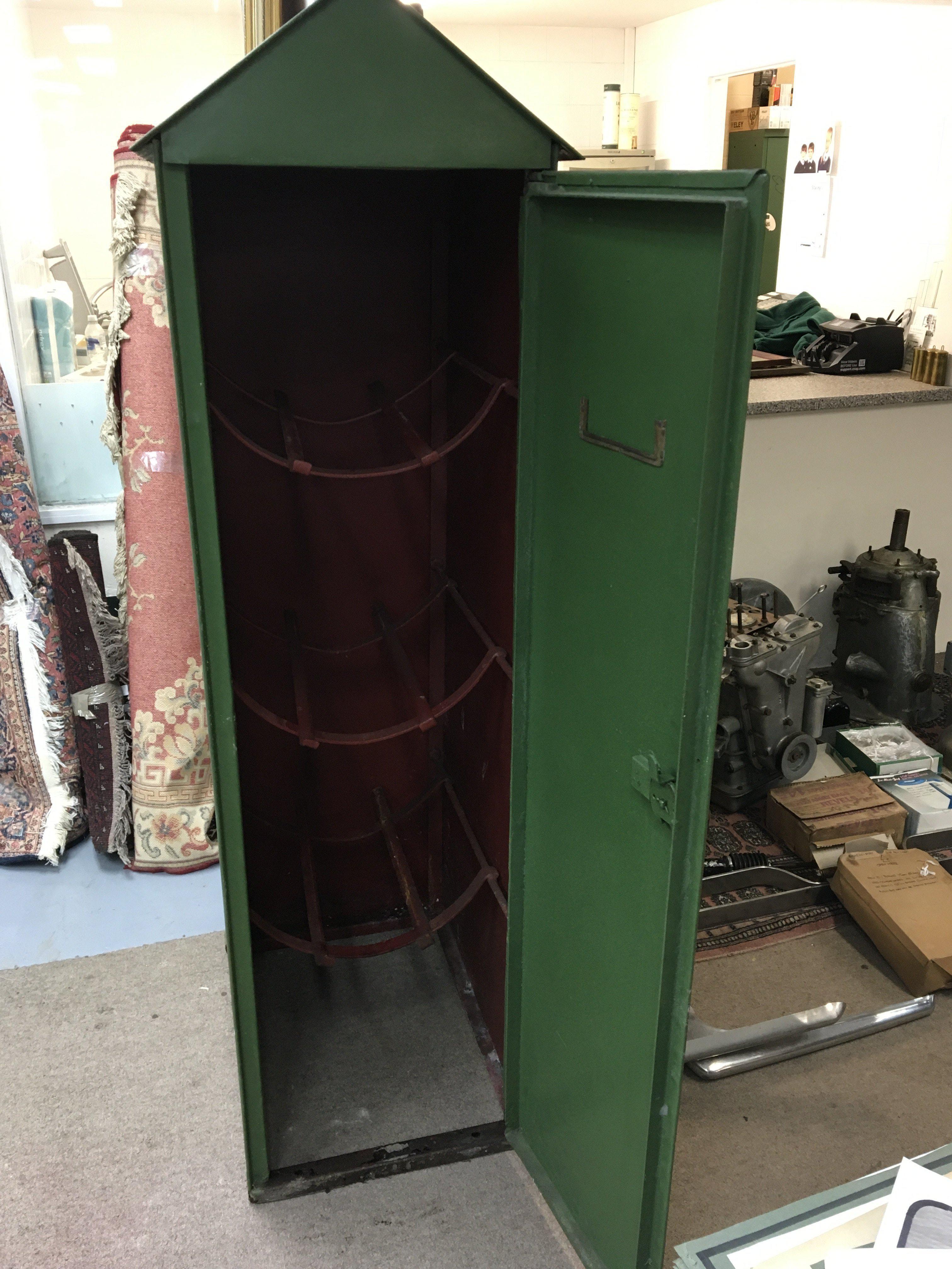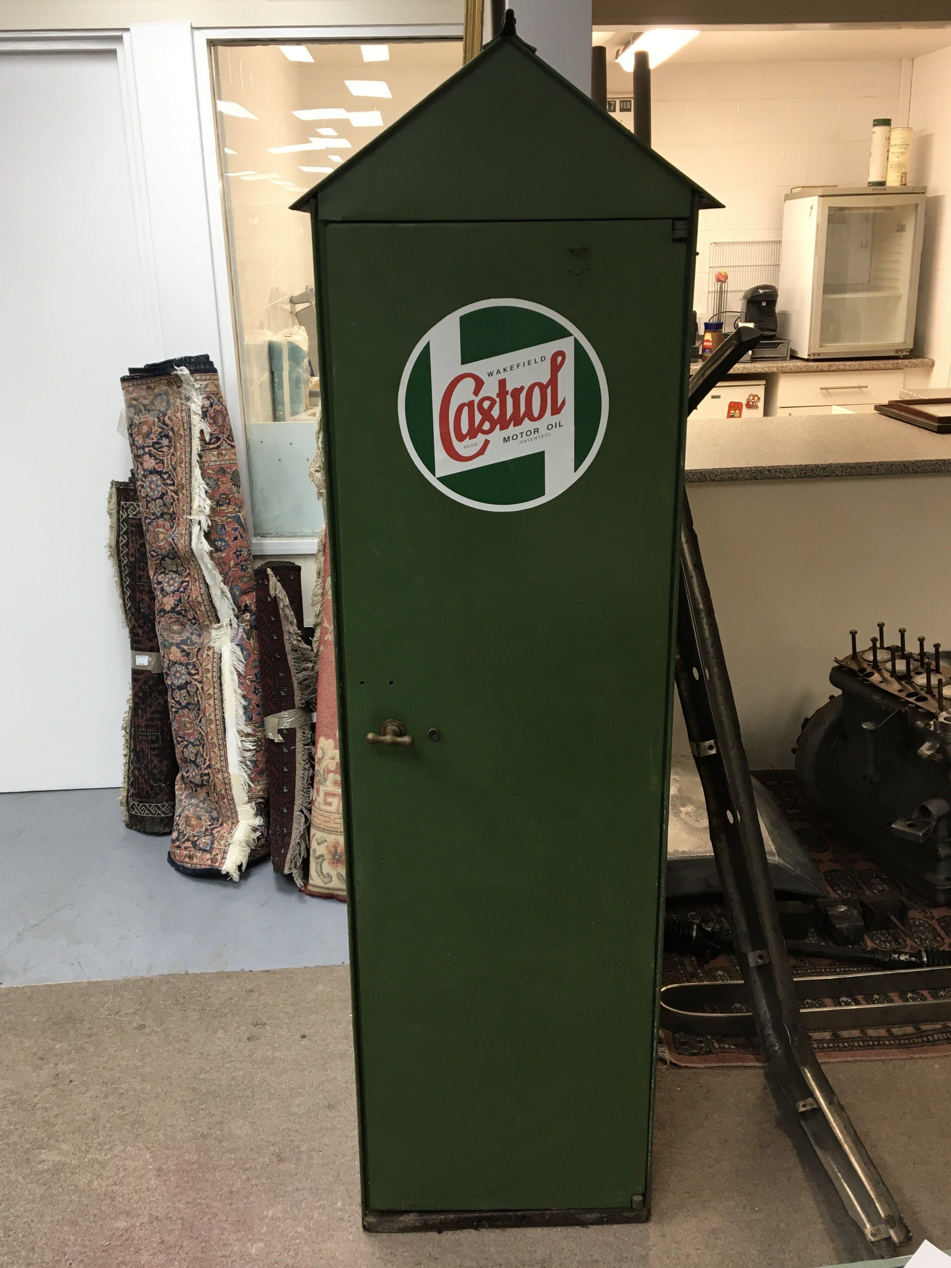 A rare Vintage Castrol work shop oil storage cupboard with a peaked top the single door with brass fittings enclosing a racked interior for three large oil cans the exterior finished in green with a red interior Hight 175cm width 52cm
