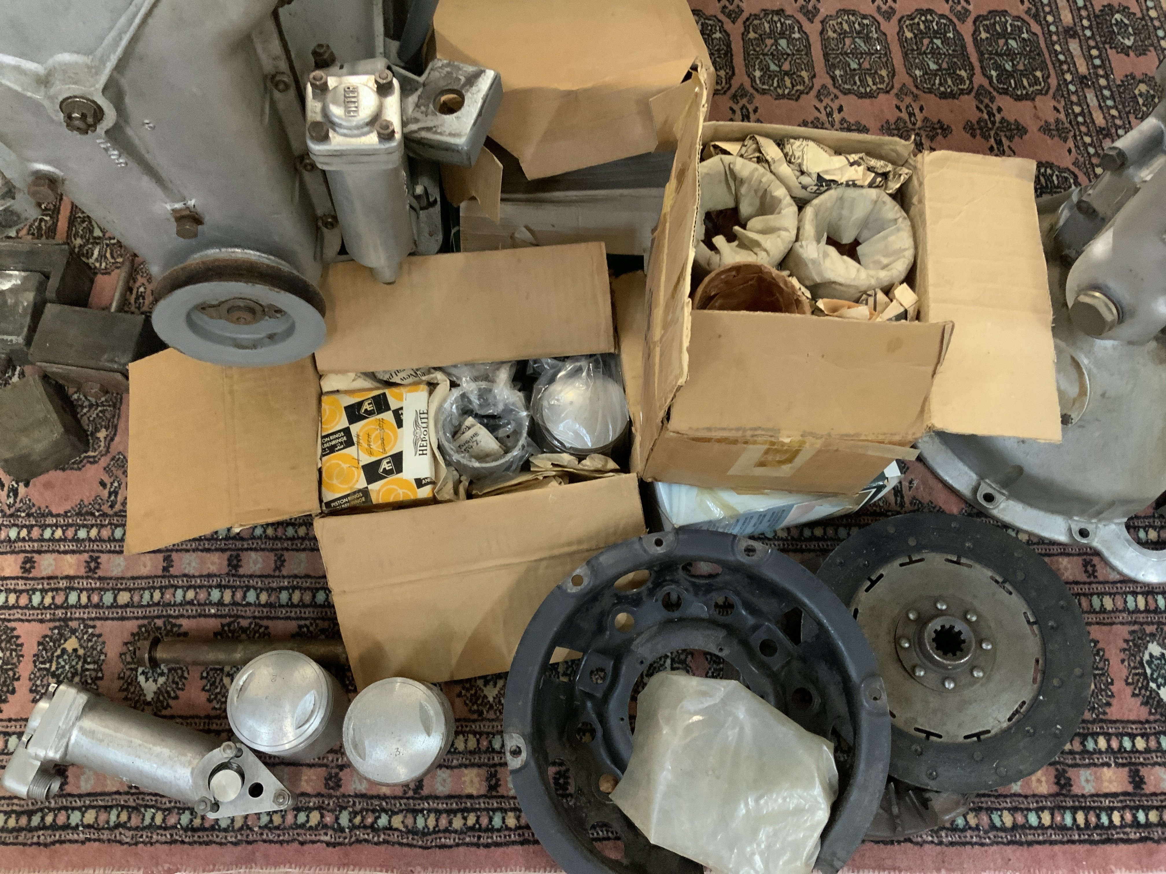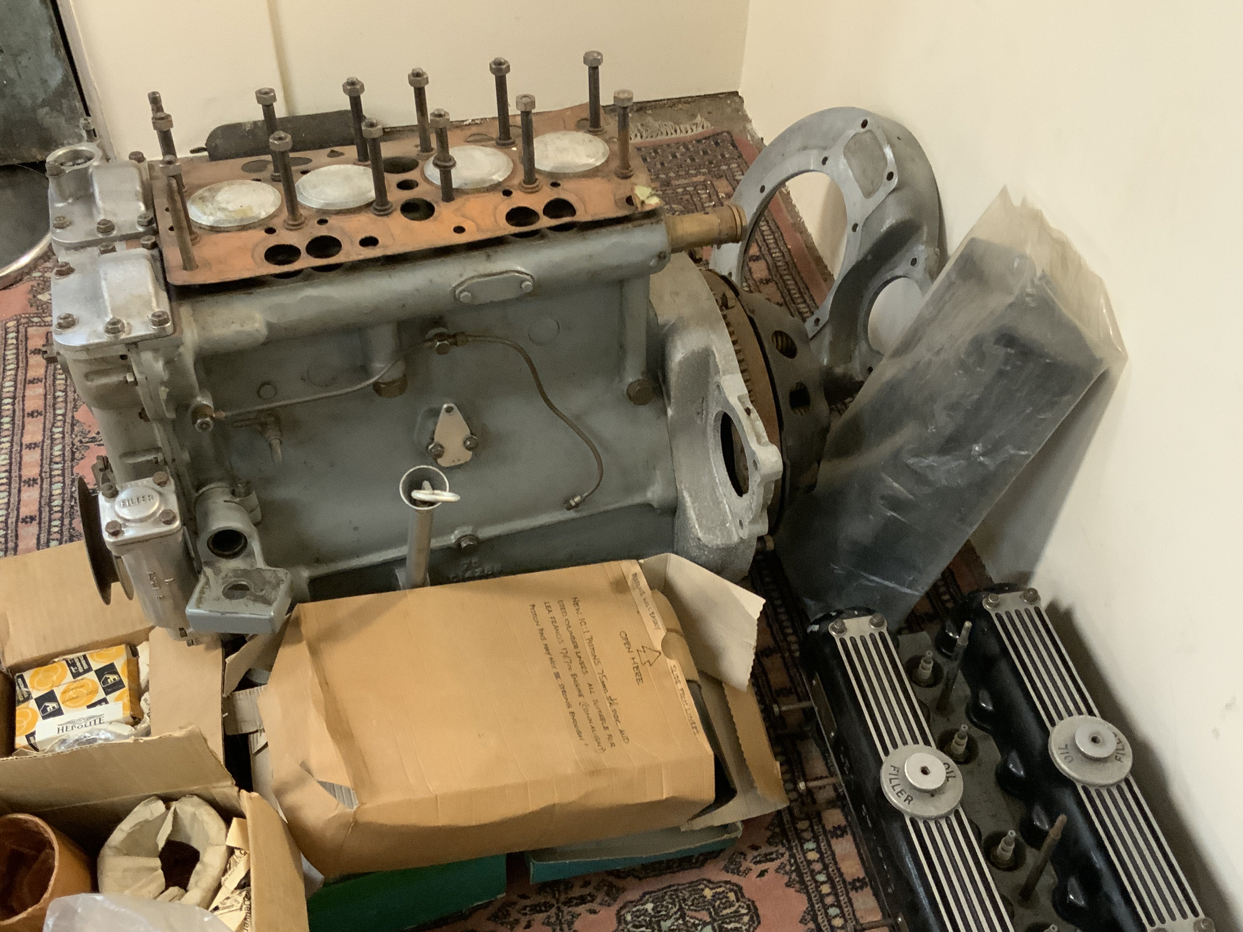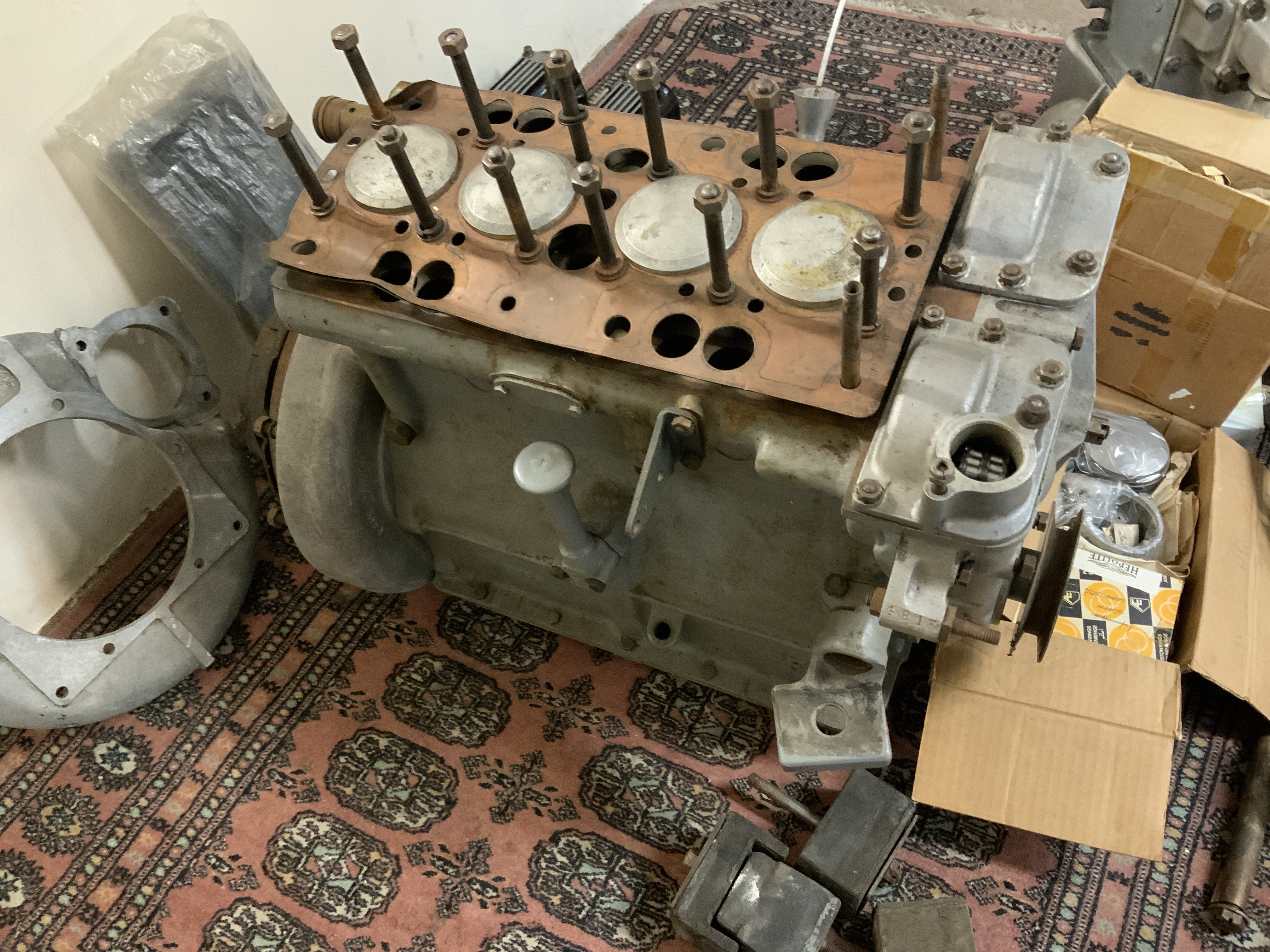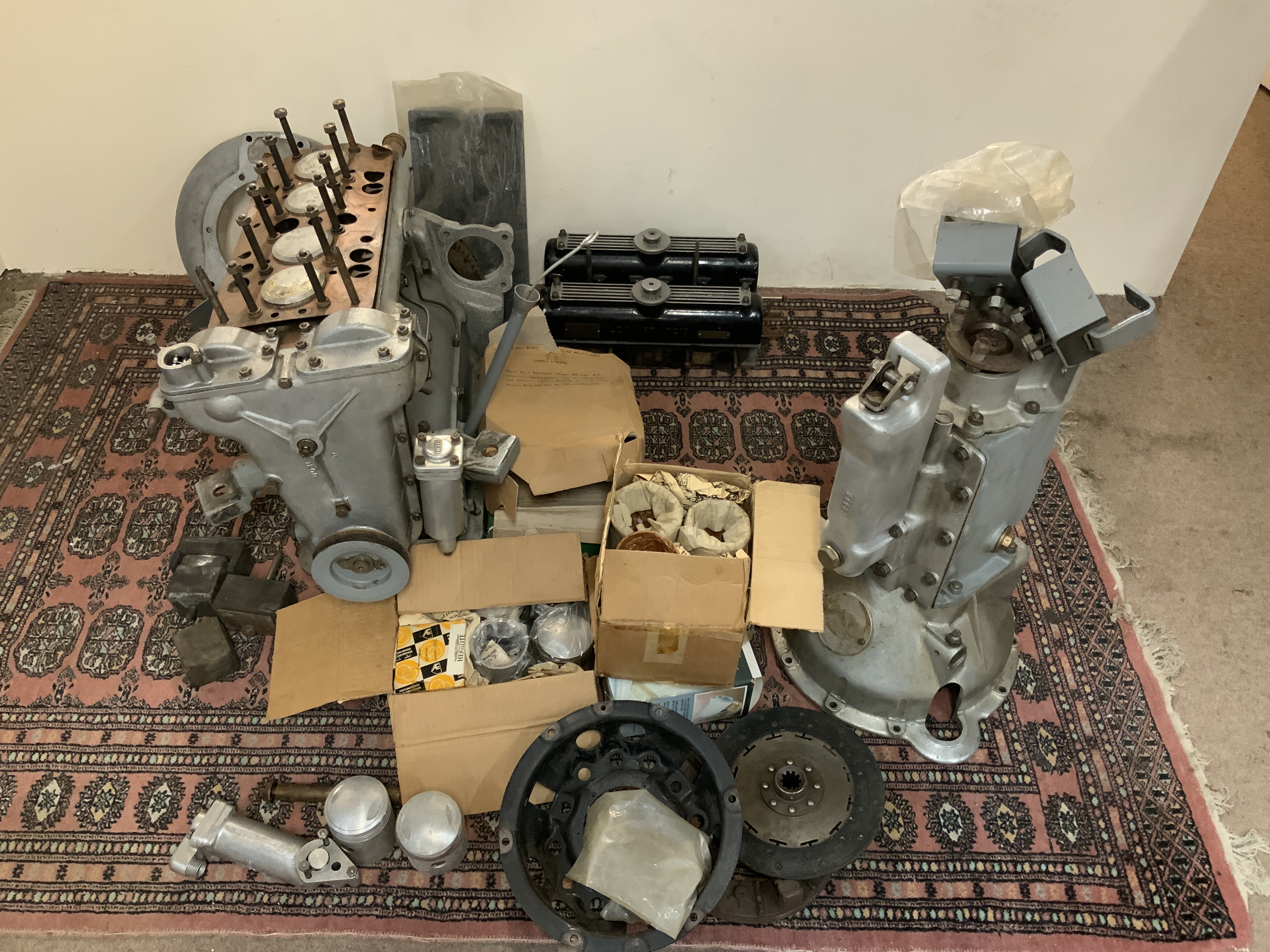 A Classic Car Engine and other accessories including Gearbox an unused sets of pistons and other accessories The Lea Francis four cylinder engine with applied plates and cast engine block number 75 MC14288 12 2. The Diatto gear box has been withdrawn from this lot and will be sold with the Diatto.