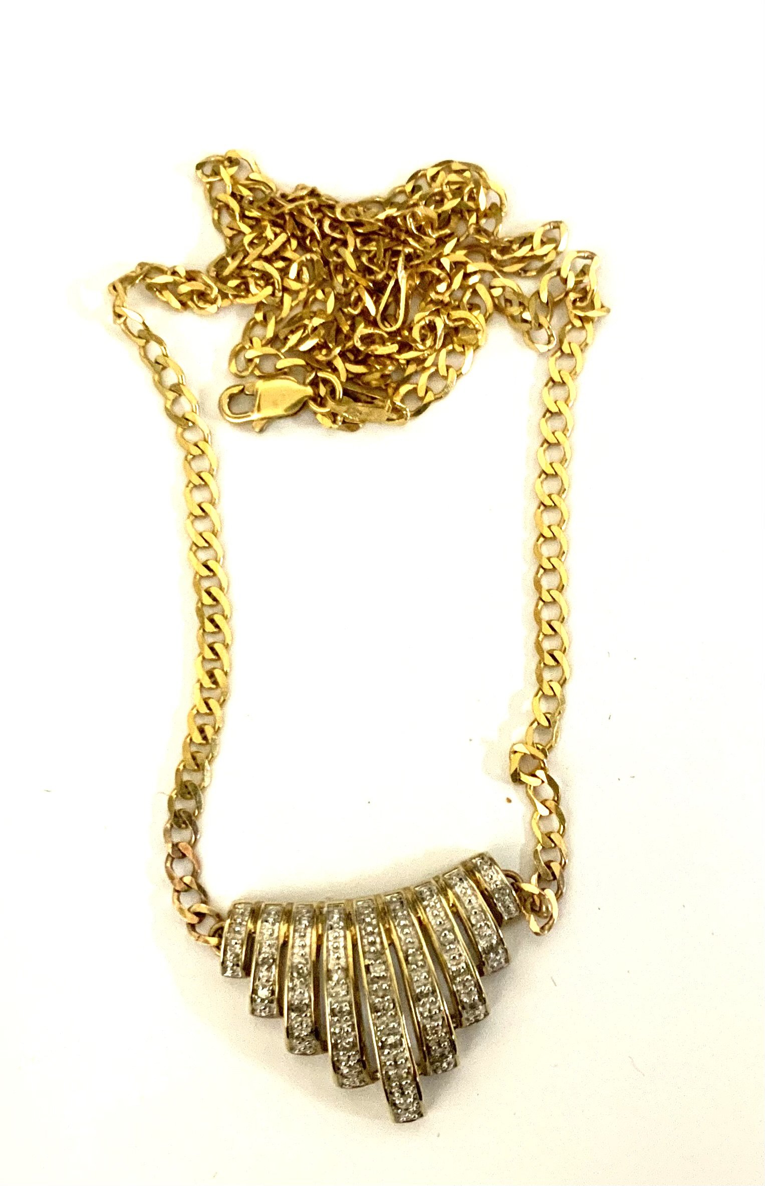 A 1930s style 9ct gold and diamond necklace with integral pendant. 8.1g. (A)