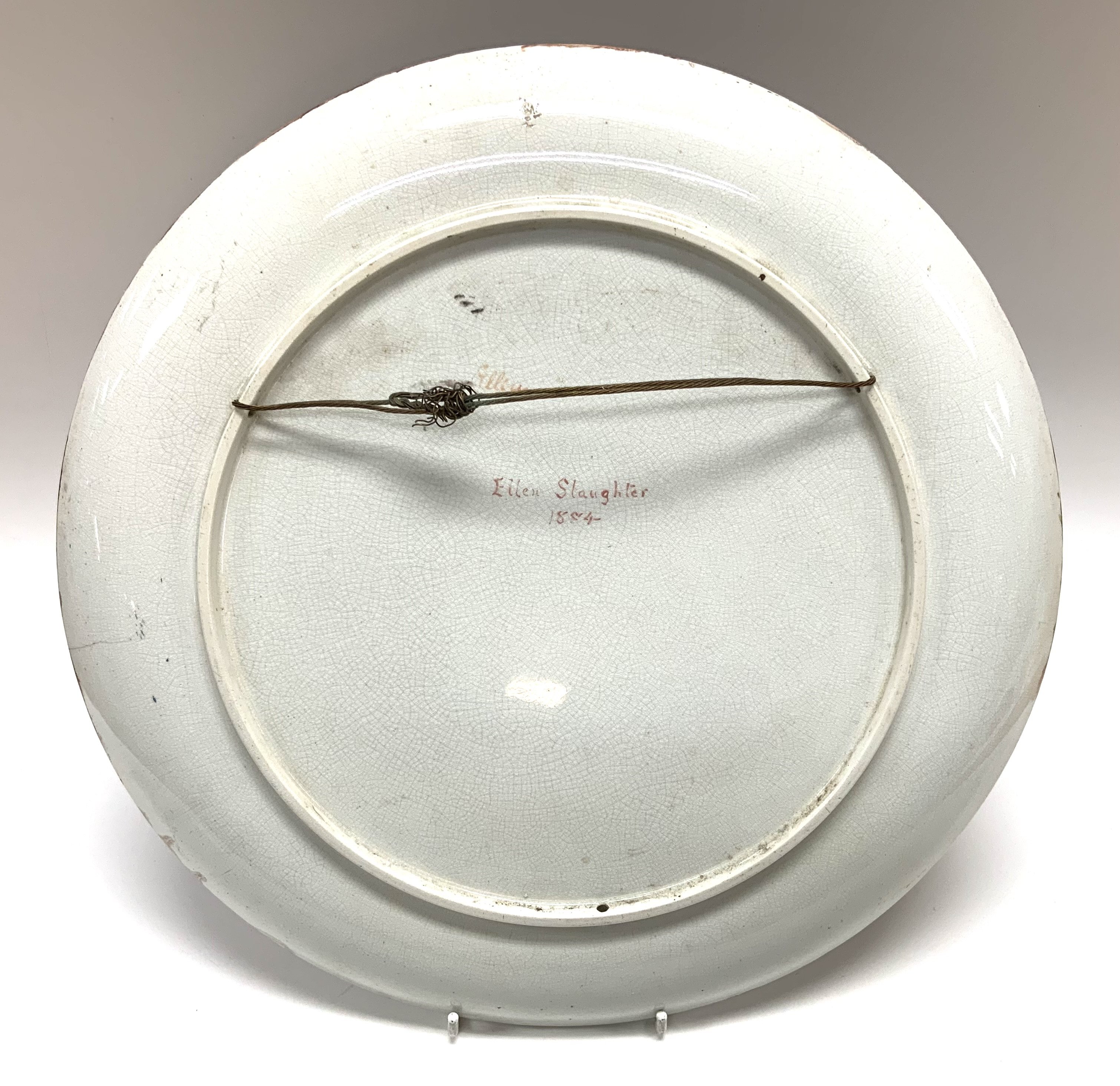 A large earthenware pottery charger with hand painted view of a lady using peacock feathers. Named and dated to reverse 1884 Ellen Slaughter. 36.5cm (D)