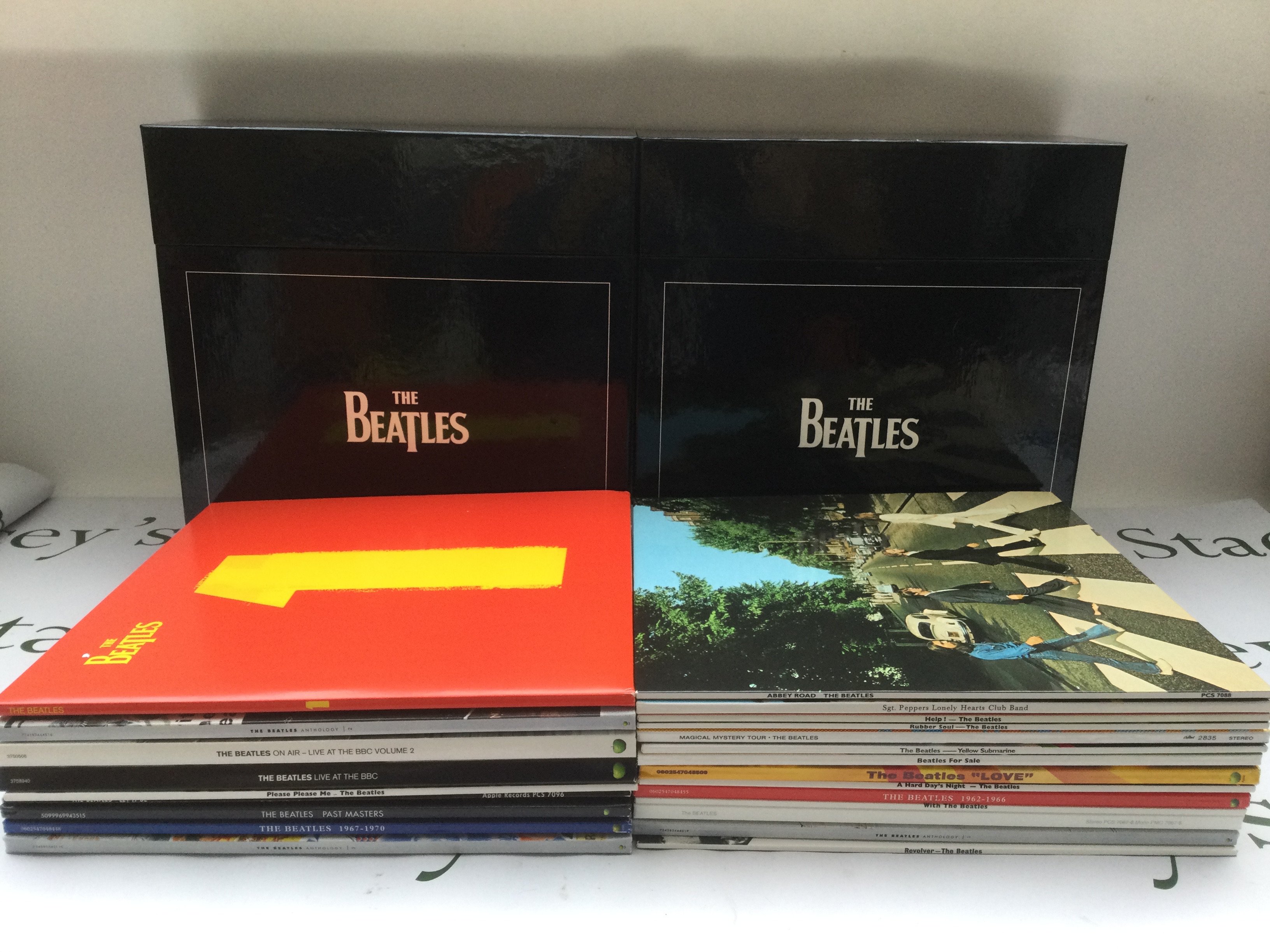 A complete Beatles DeAgostini 180g LP collection with inserts, a USB power bank and a boxed Beatles zippo lighter.