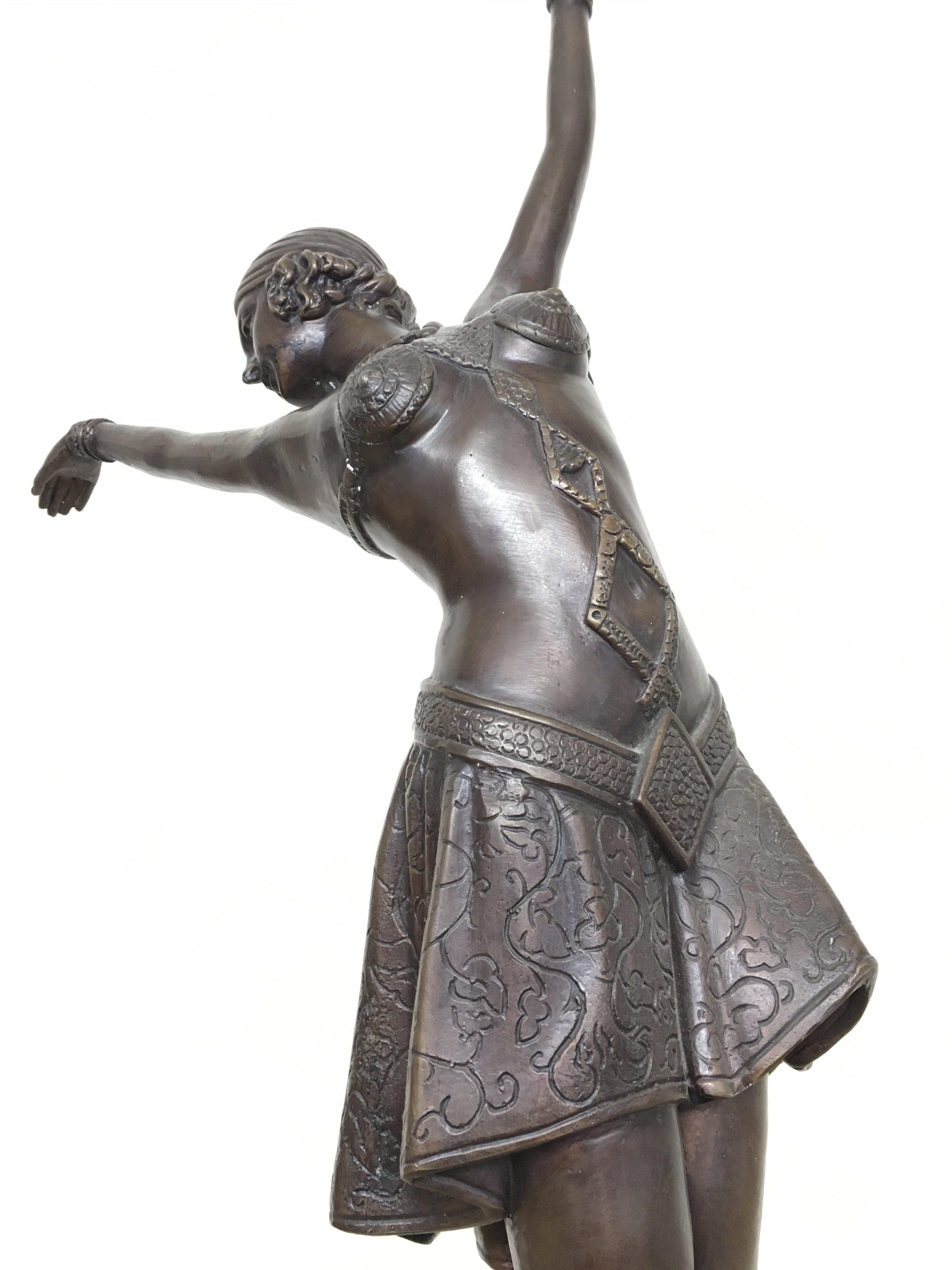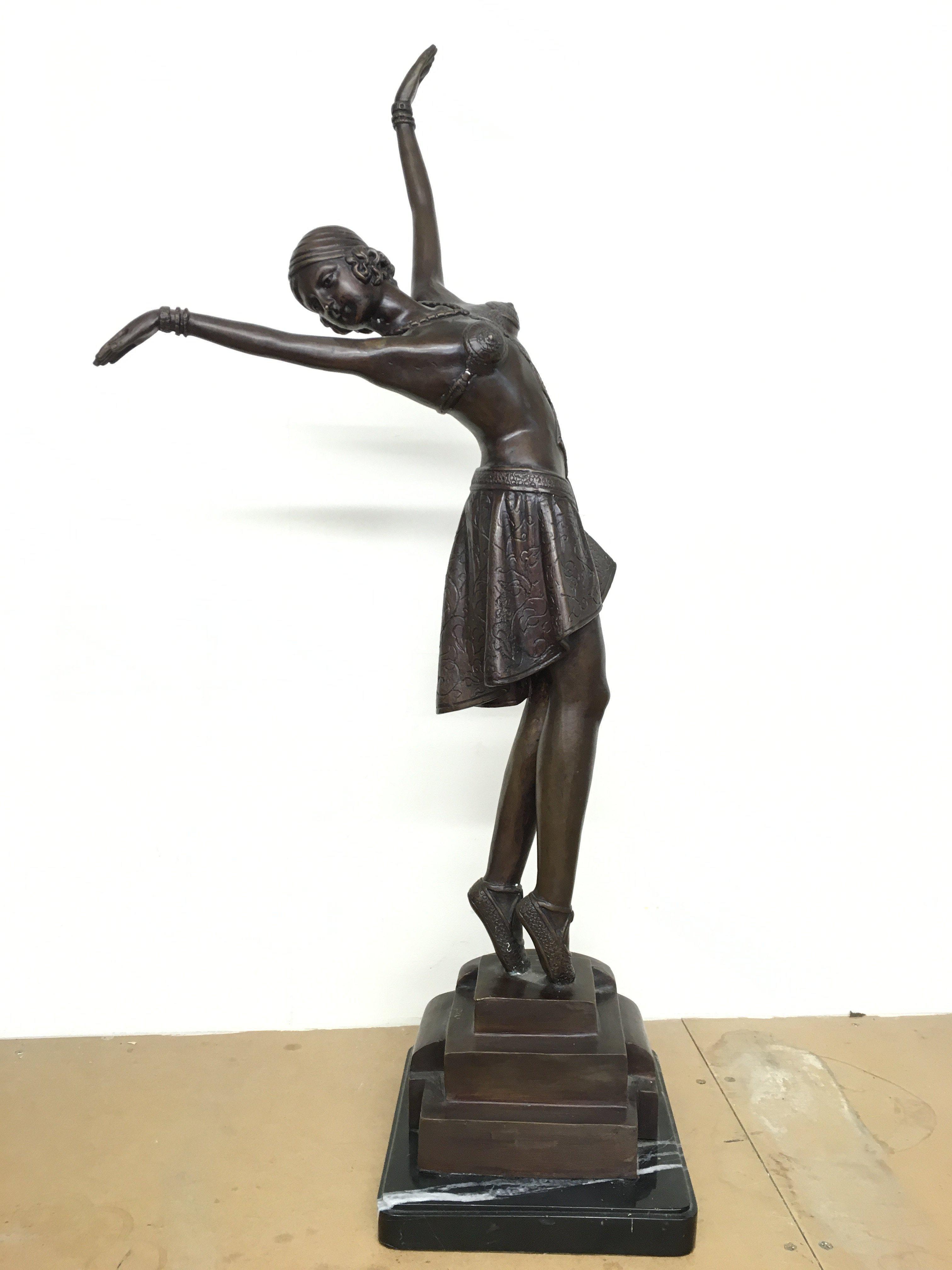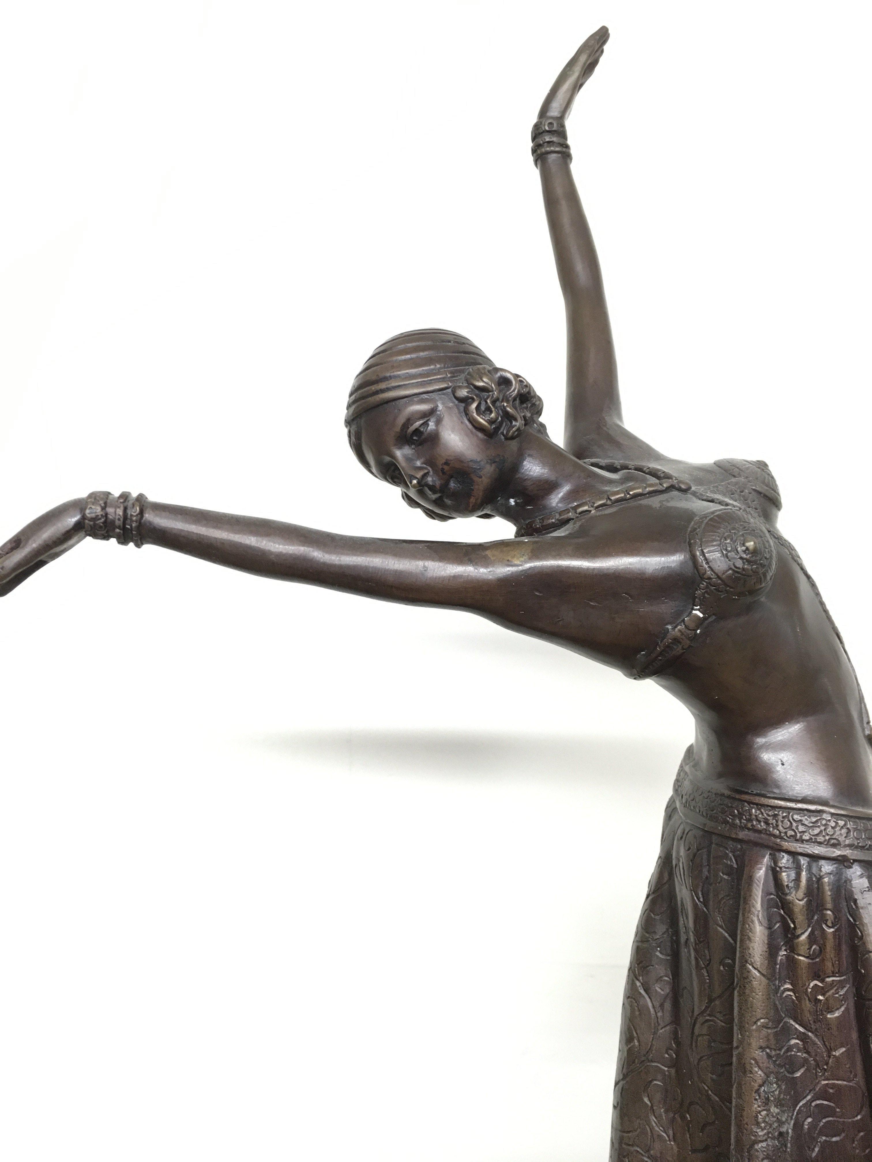 A bronze Art Deco style dancer figure, by Romanian sculptor Demetre Chiparus. 74cm tall approximately. This lot cannot be posted