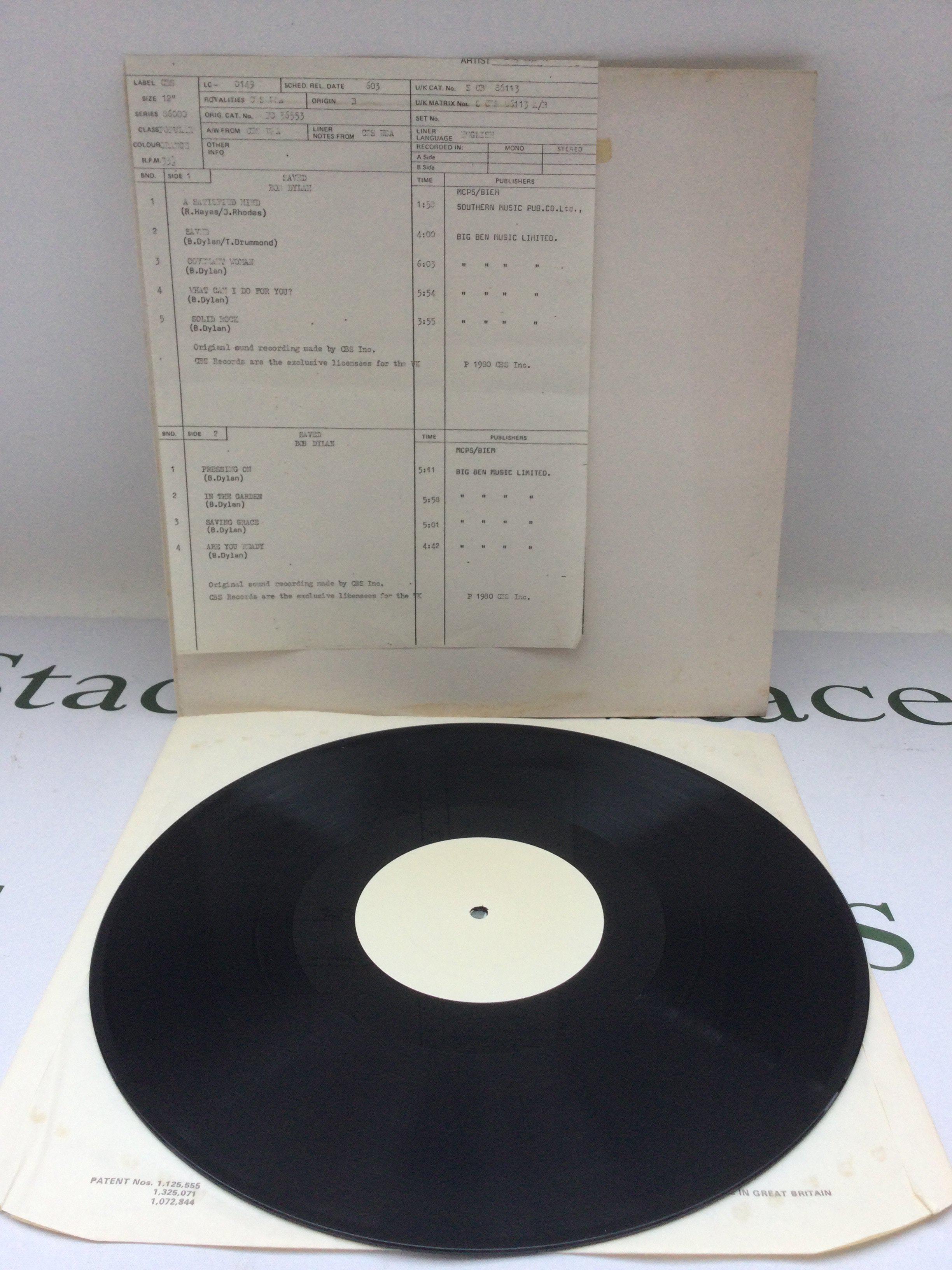A test pressing for the Bob Dylan 'Saved' LP, CBS S 86113 with attached CBS headed note paper with typed detailed information.