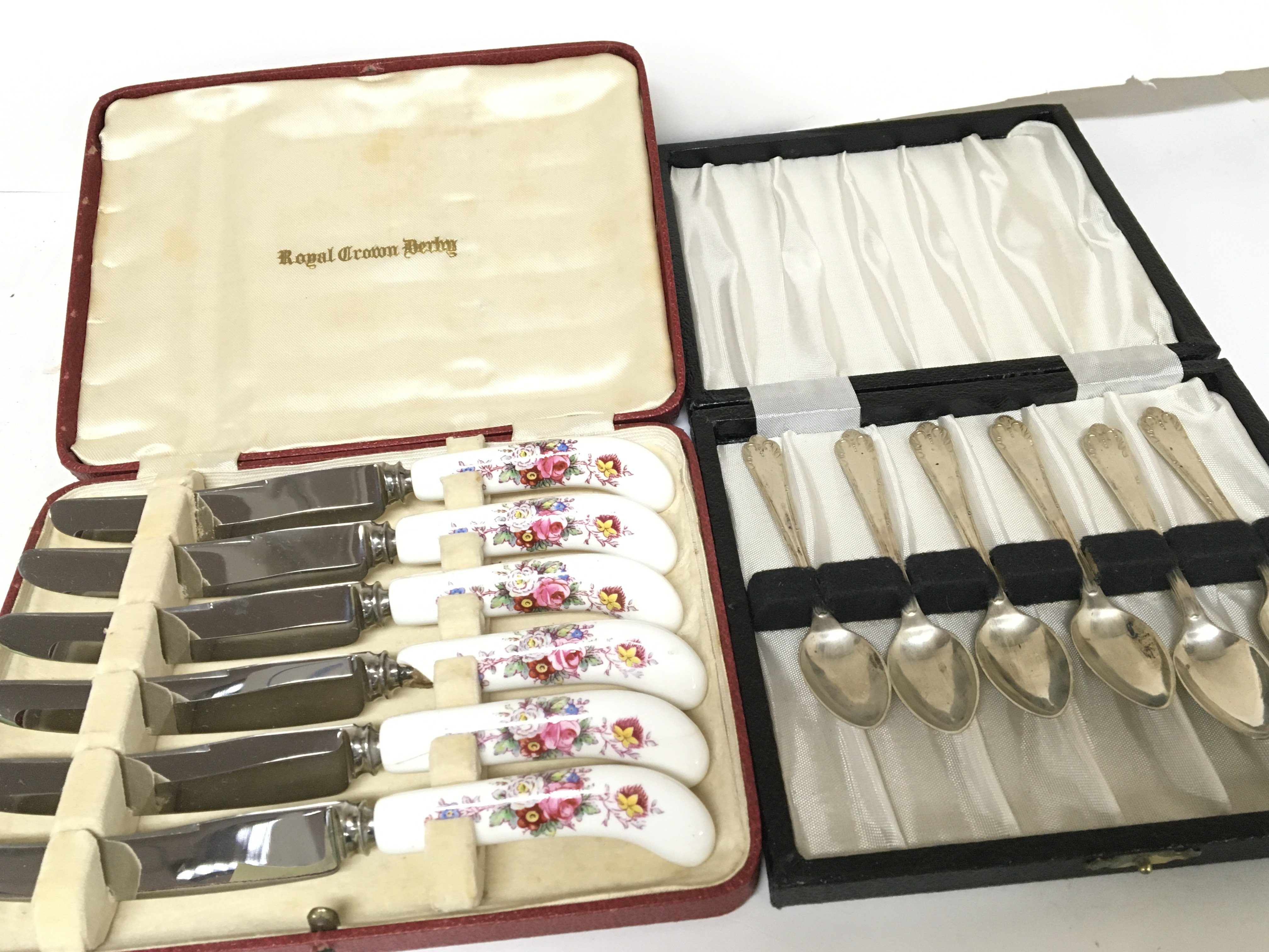 A cased set of silver spoons and a cased set of Royal crown Derby porcelain handled butter knifes. NO RESERVE