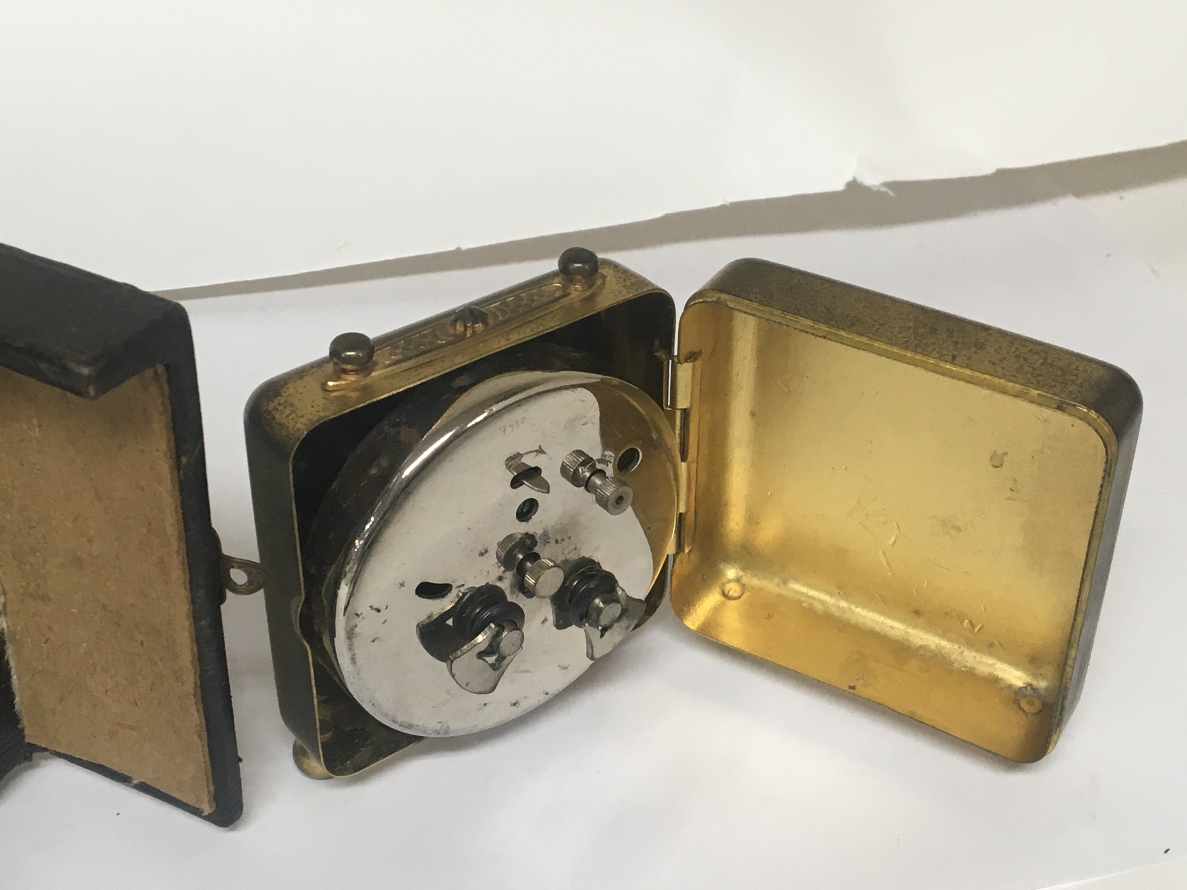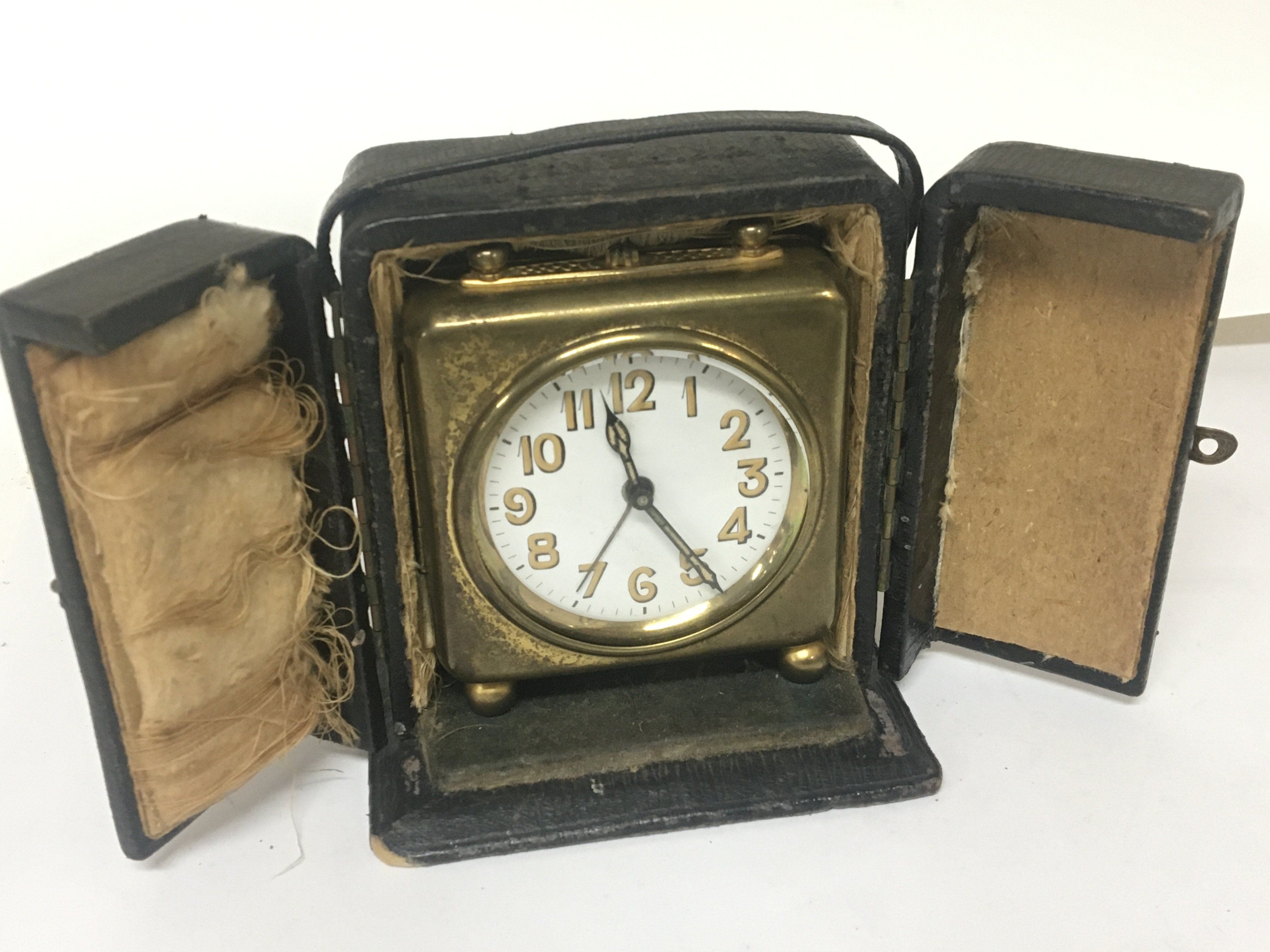 A Vintage traveling clockwork alarm clock in a fitted case. NO RESERVE