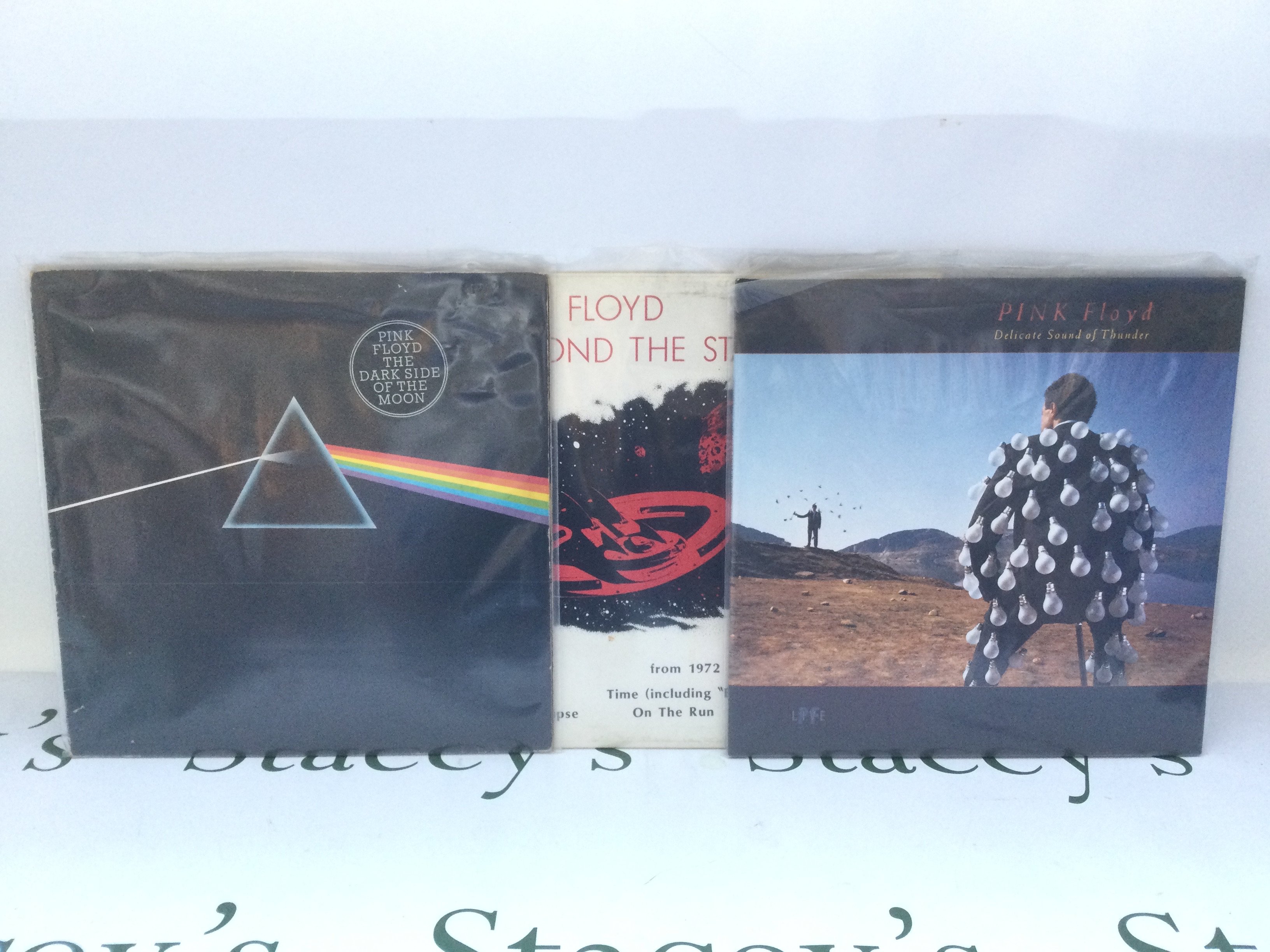 Three Pink Floyd LPs comprising 'Dark Side Of The Moon', 'Delicate Sound Of Thunder' and one other.