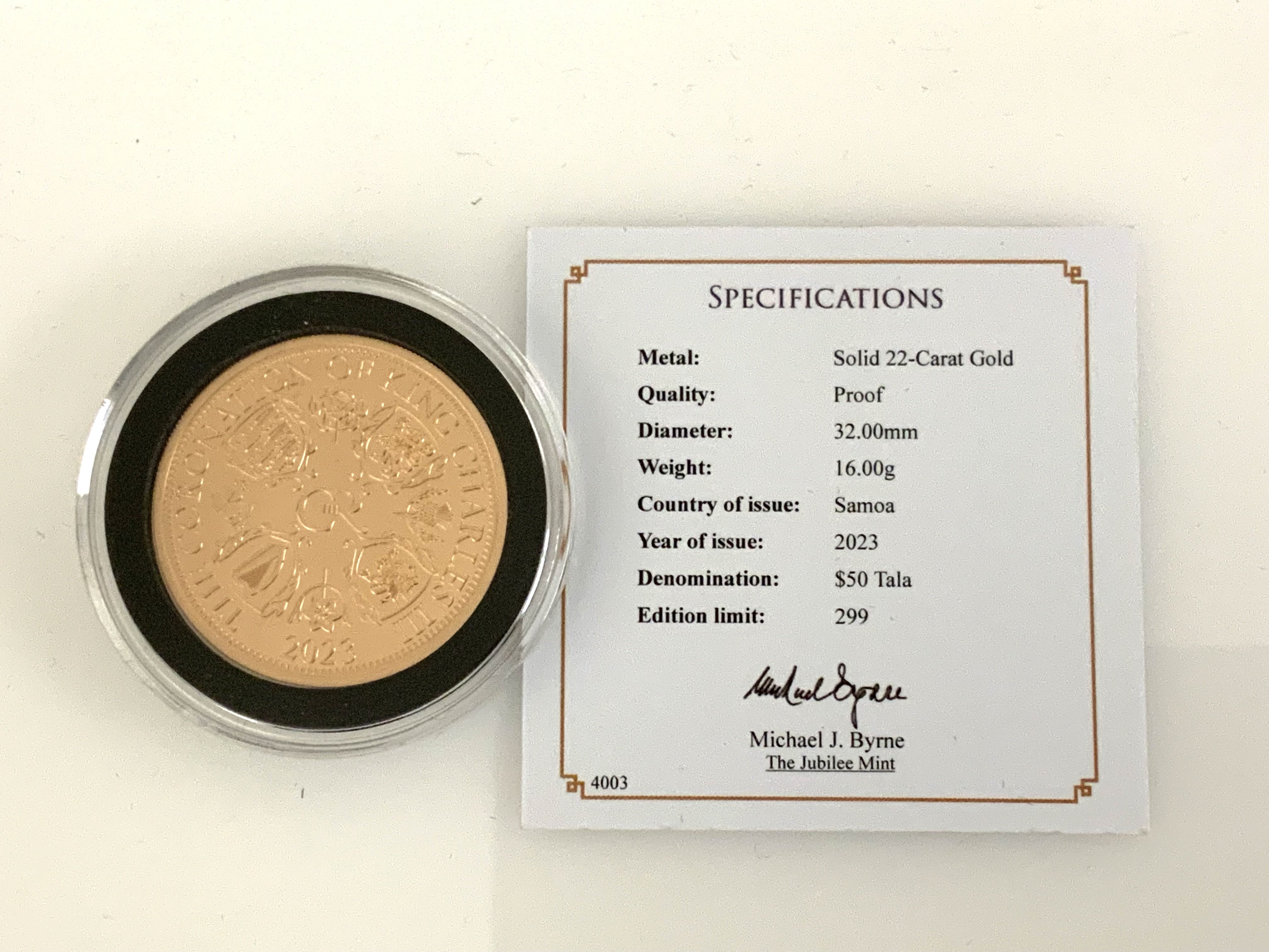 Jubilee Mint, 50 Dollar Tala, Coronation of King Charles III solid 22ct gold proof coin16g, Samoa issue. (A)