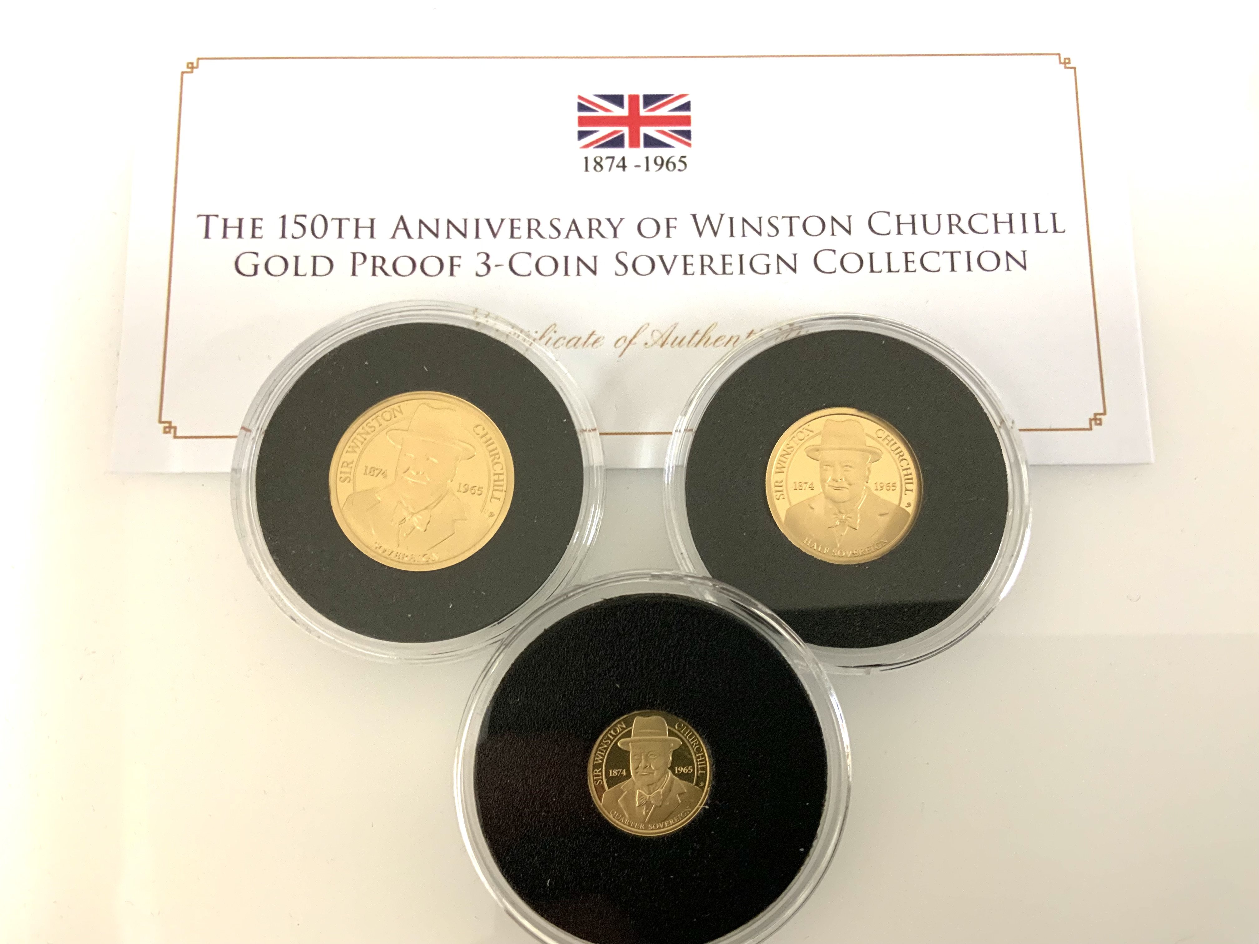 150th Anniversary of Winston Churchill gold proof 3 coin sovereign set. (A)
