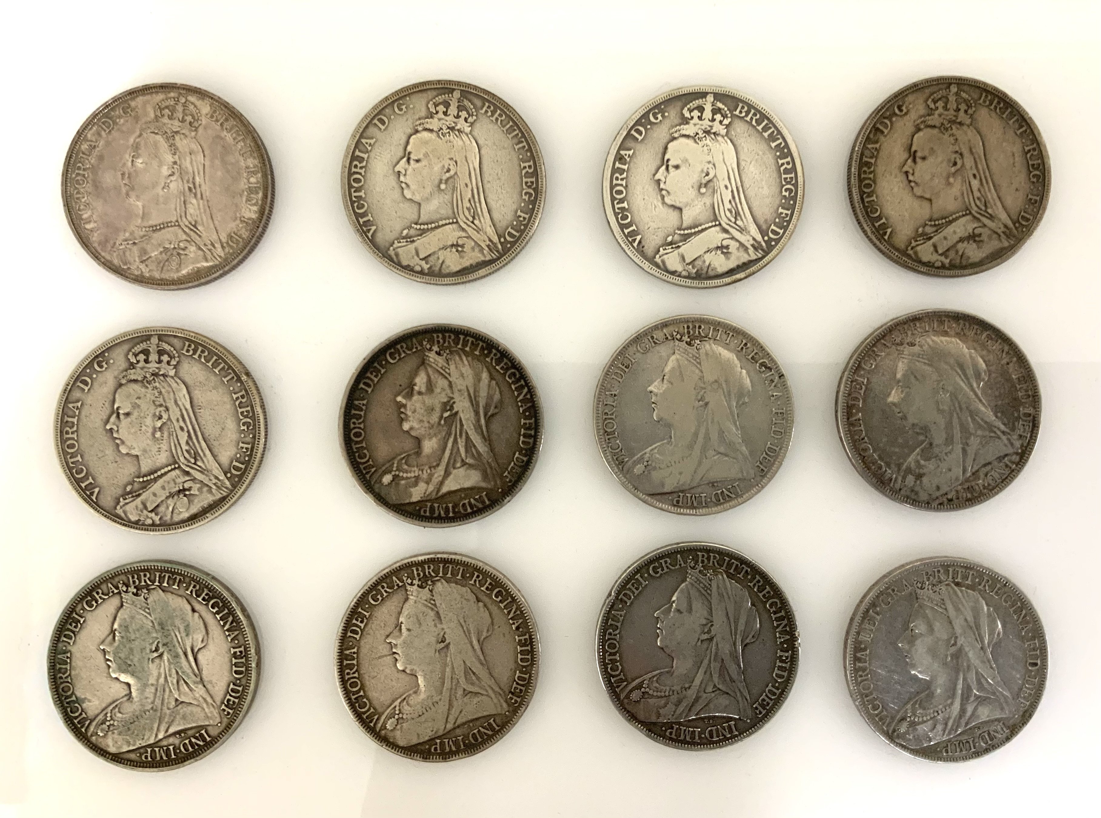 A good collection of 12 Victoria crowns. Dates include. 1887, 1889, 1890, 1891, 1892, 1893, 1894, 1896, 1897, 1898, 1899, 1900. (A)