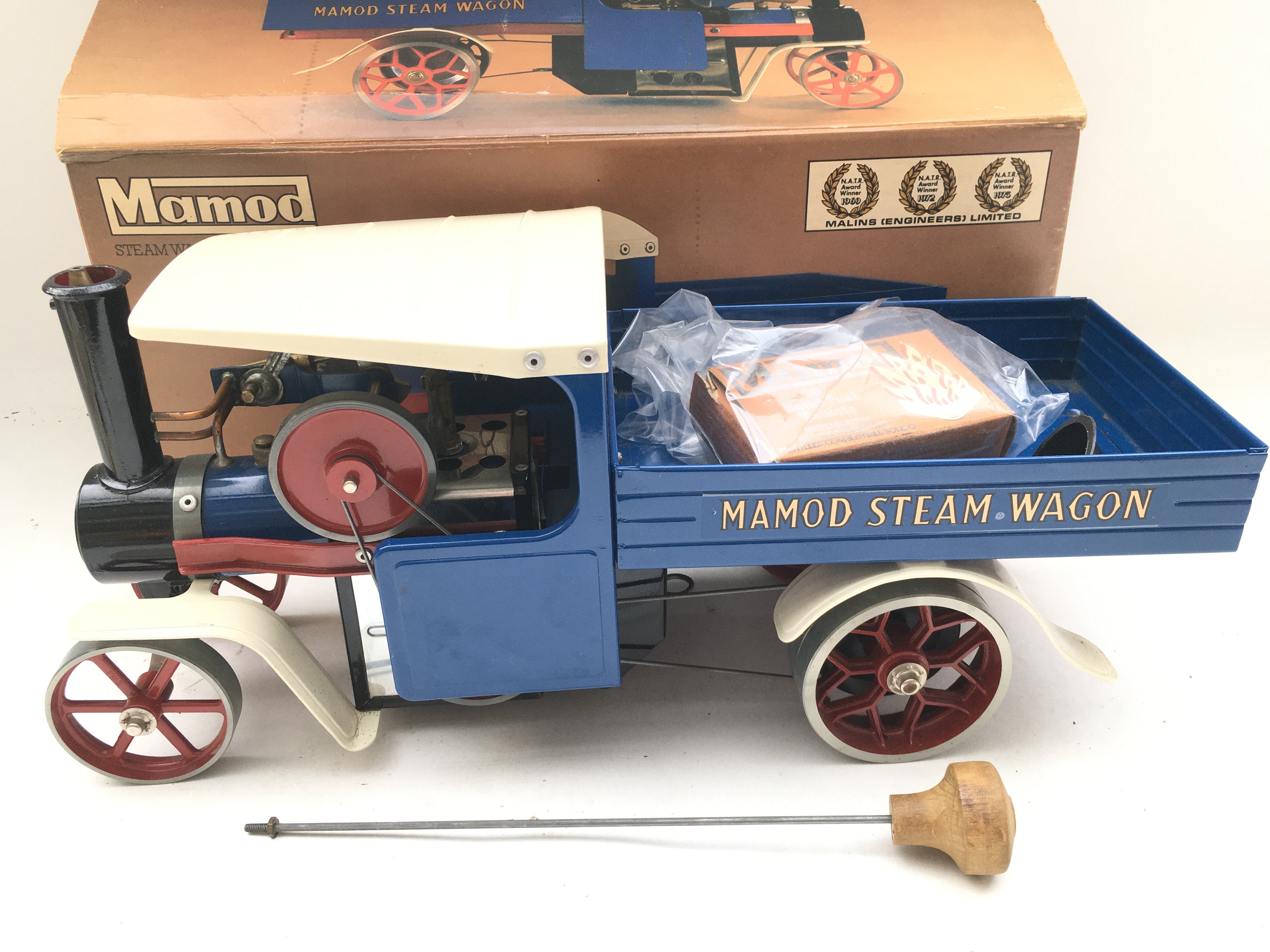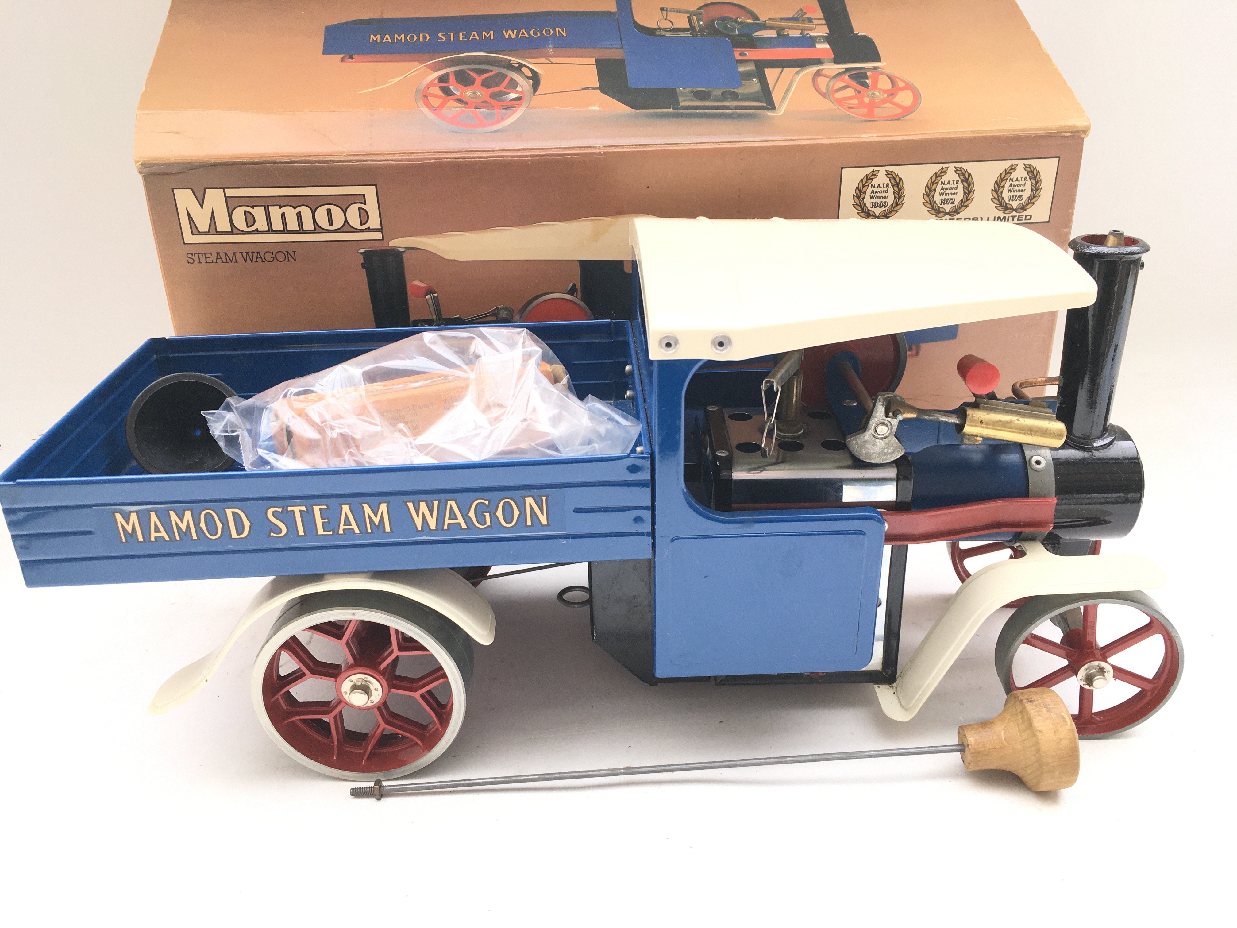A Boxed Mamod Blue Steam Wagon #SW1 in Very Good Condition. With Original Accessories And Packaging. Has Been Fired.