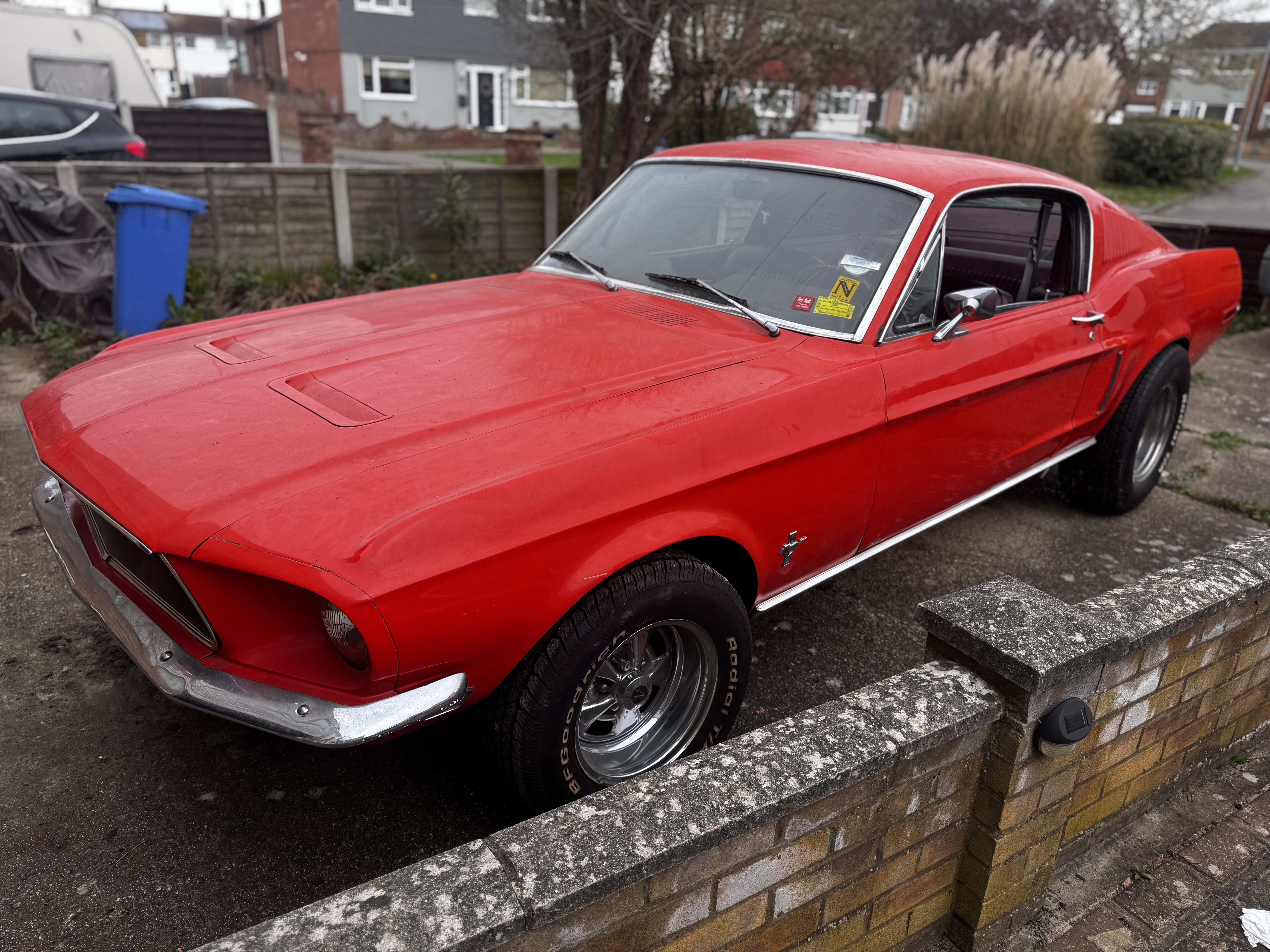 1968 Ford Mustang Fastback, V8 390 CID 4V Big Block, LHD, In need of some restoration, signs of impact and repair on rear quarter. Remnants of a Nitros setup in boot space. Repainted from its original Royal Maroon colour to the current registered Red. Currently on to extra wide BF Goodrich tyres on rear, 2 additional wheels present, Interior has maroon leather upholstery. Full V5 present. Previously driven and shown at car meets across the country over 7 years ago. Mileage 79,500Please note this car is not on site at our websters way address, we have a dedicated viewing day on Saturday 12th April between 10am - 2pm via appointment, please contact the office for additional address information.