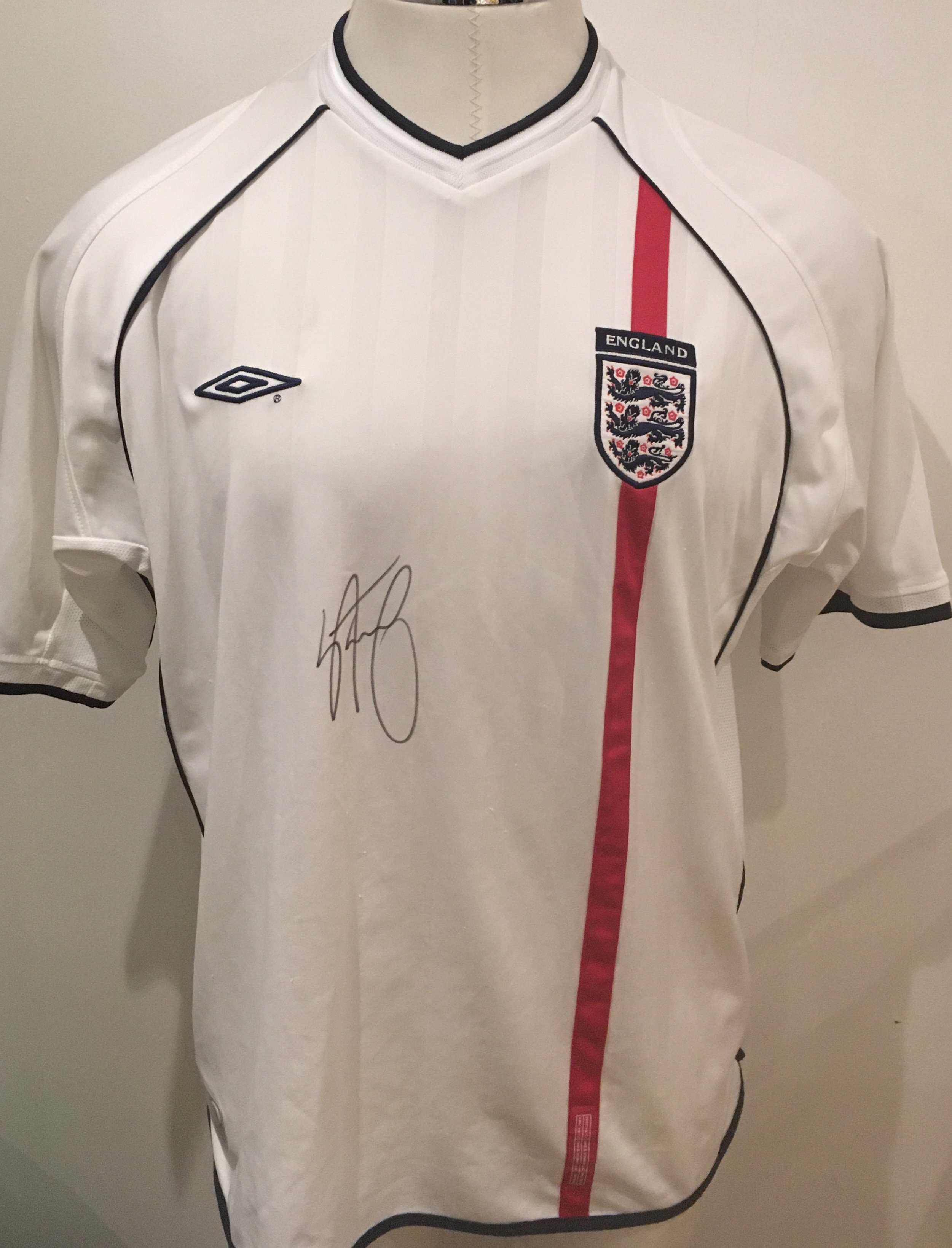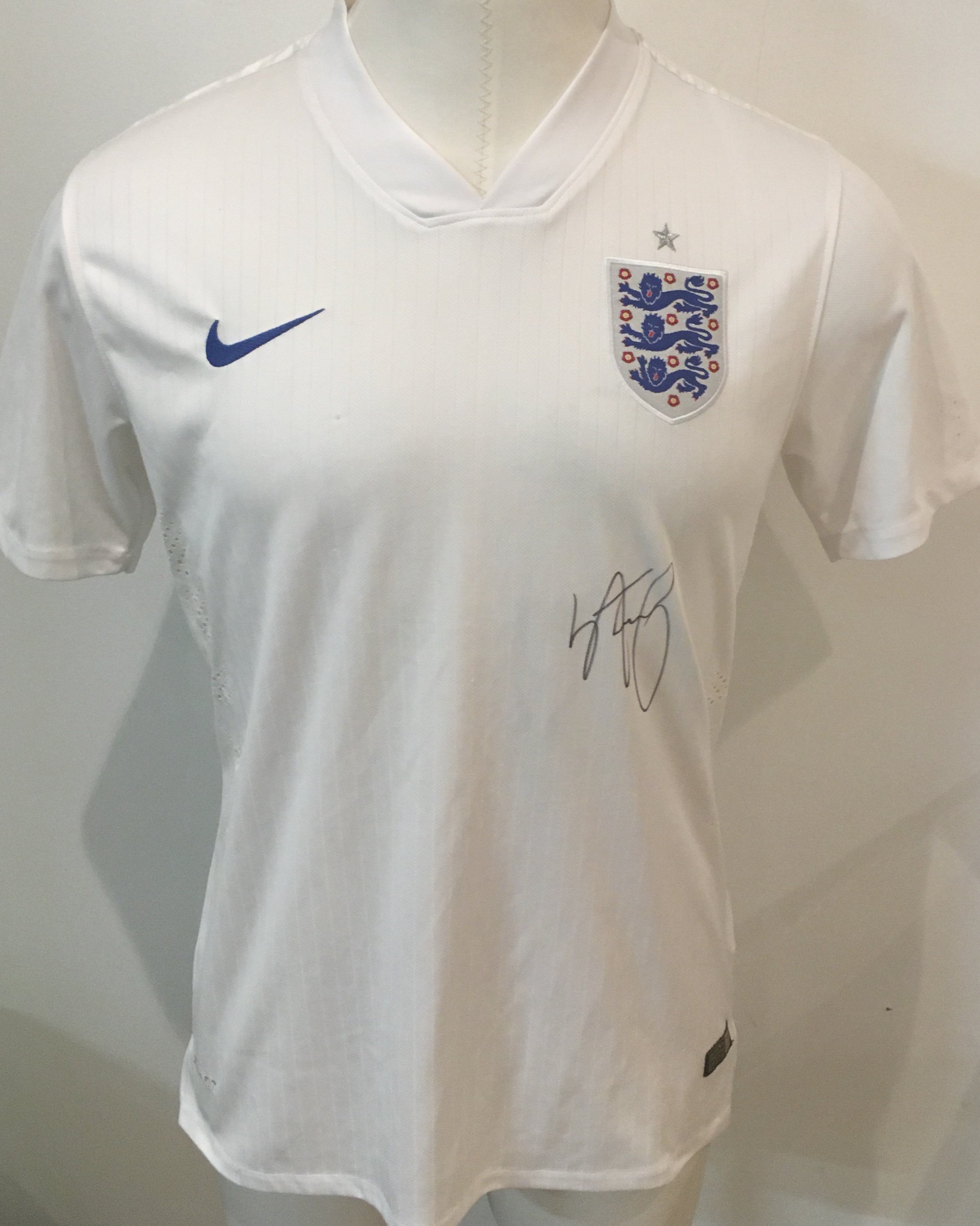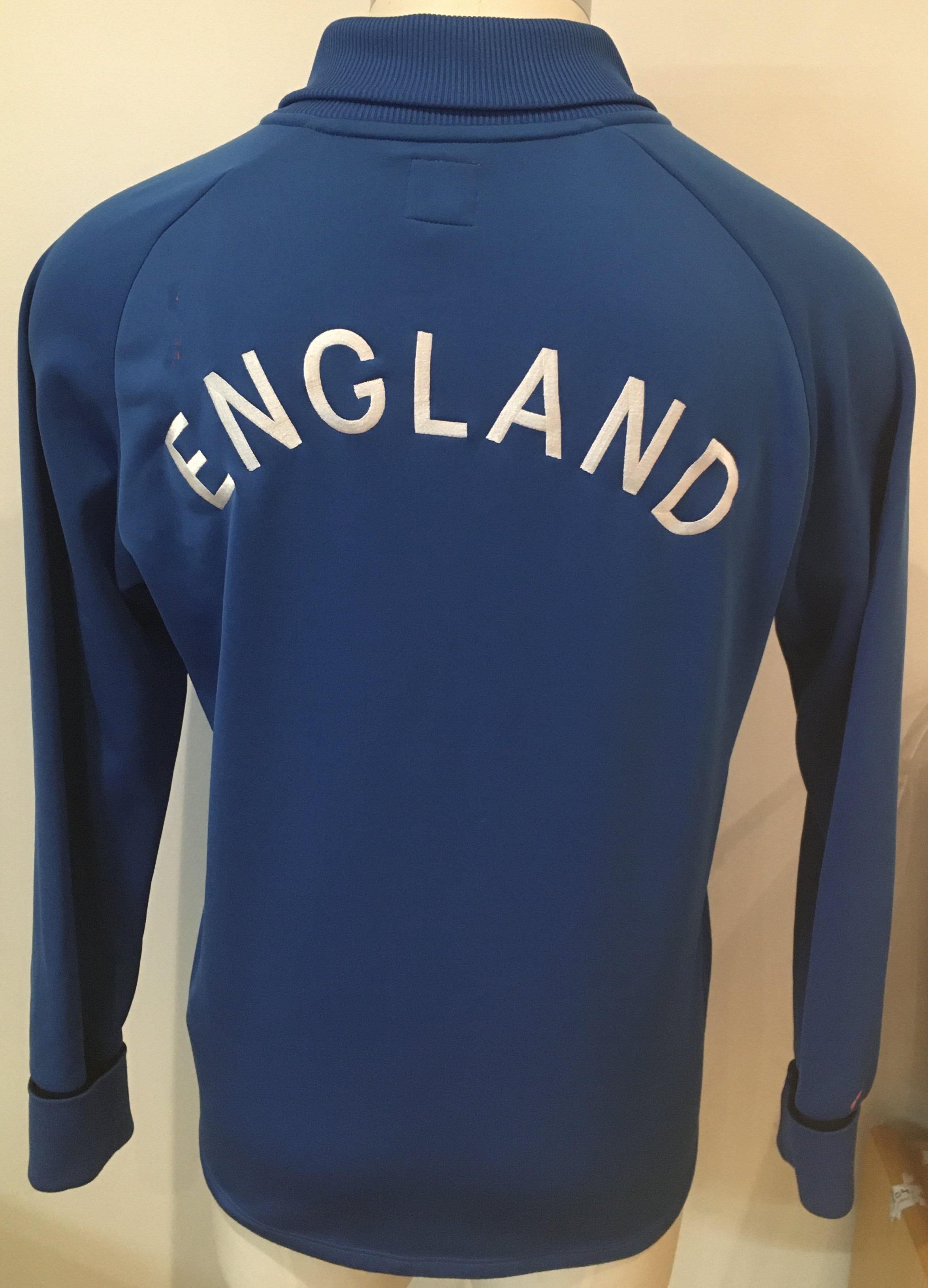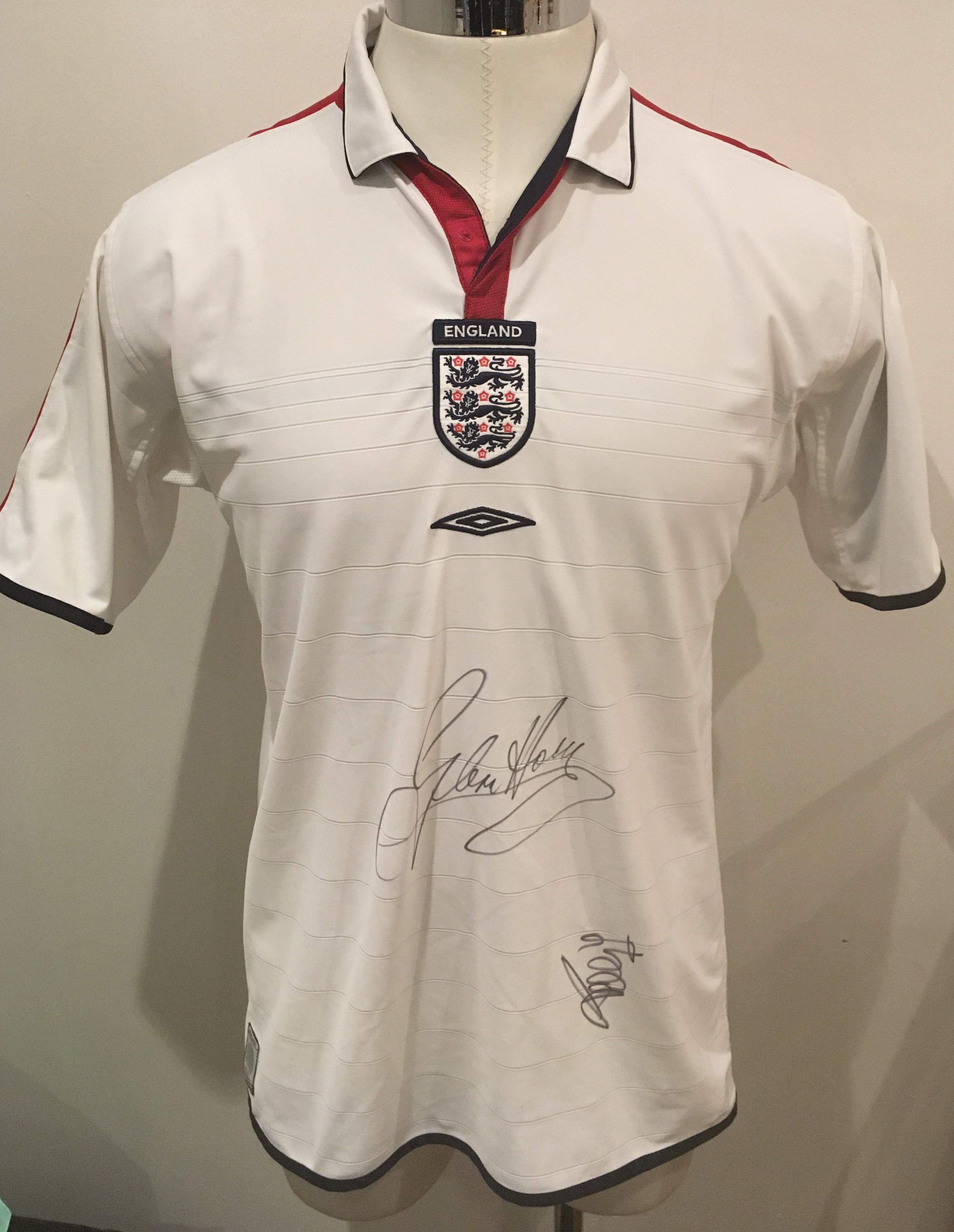 England Signed Football Shirts + Track Suit Top: 3 different era white home England shirts all signed without dedication by Tottenhams Ledley King. A further England shirt is signed by Hoddle and Peter Taylor. These were signed at a Spurs dinner. C/W a lovely blue 90s Nationwide large track suit top with mark to rear and a Score Draw replica England shirt. (6)