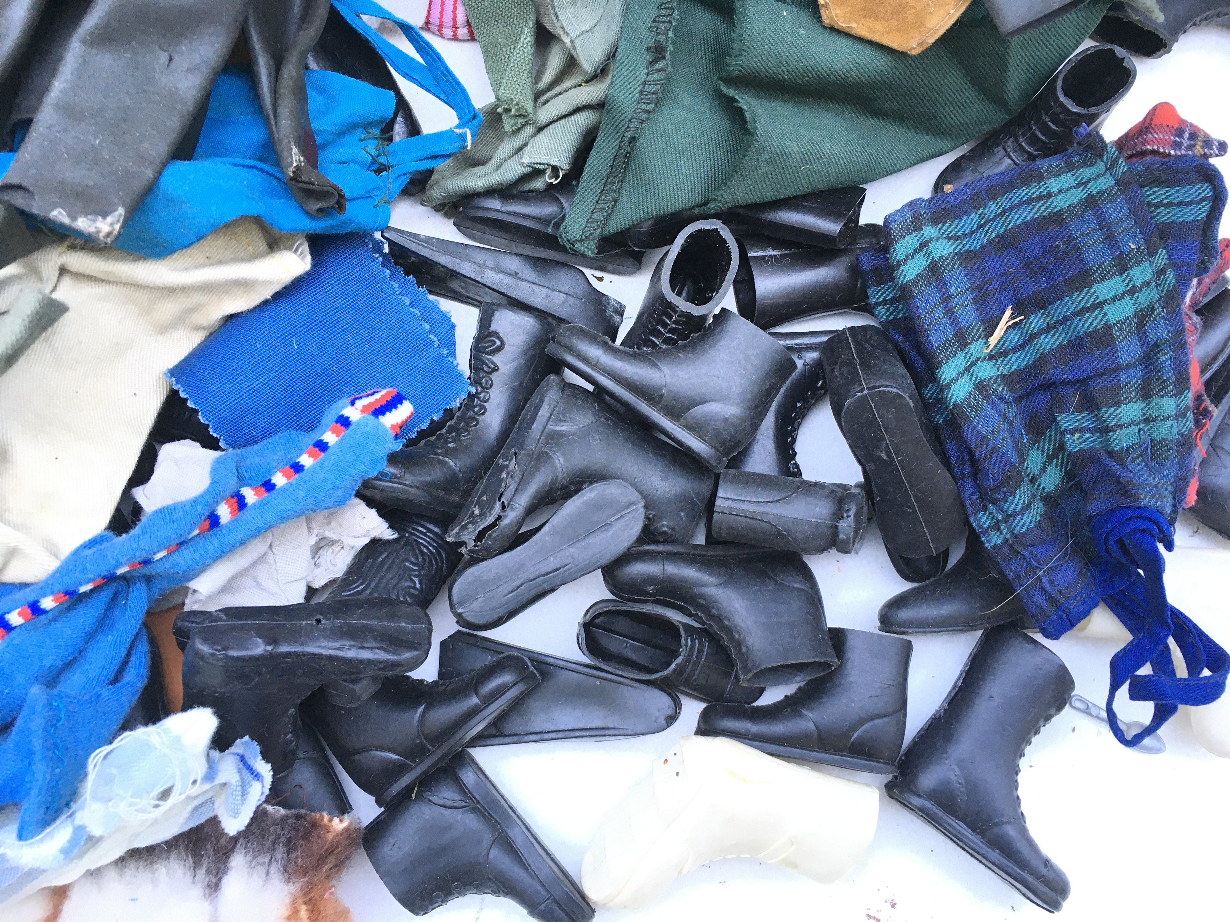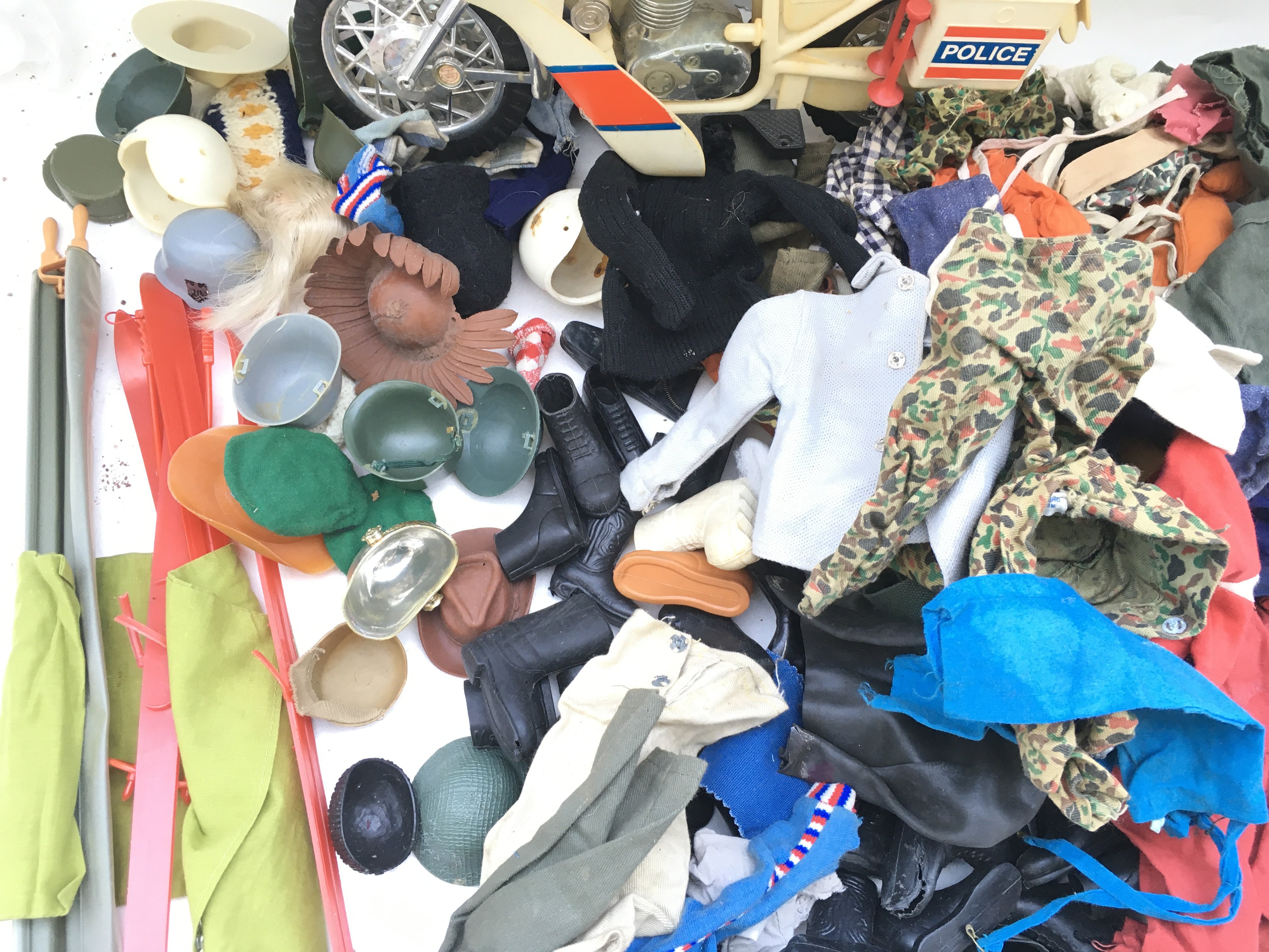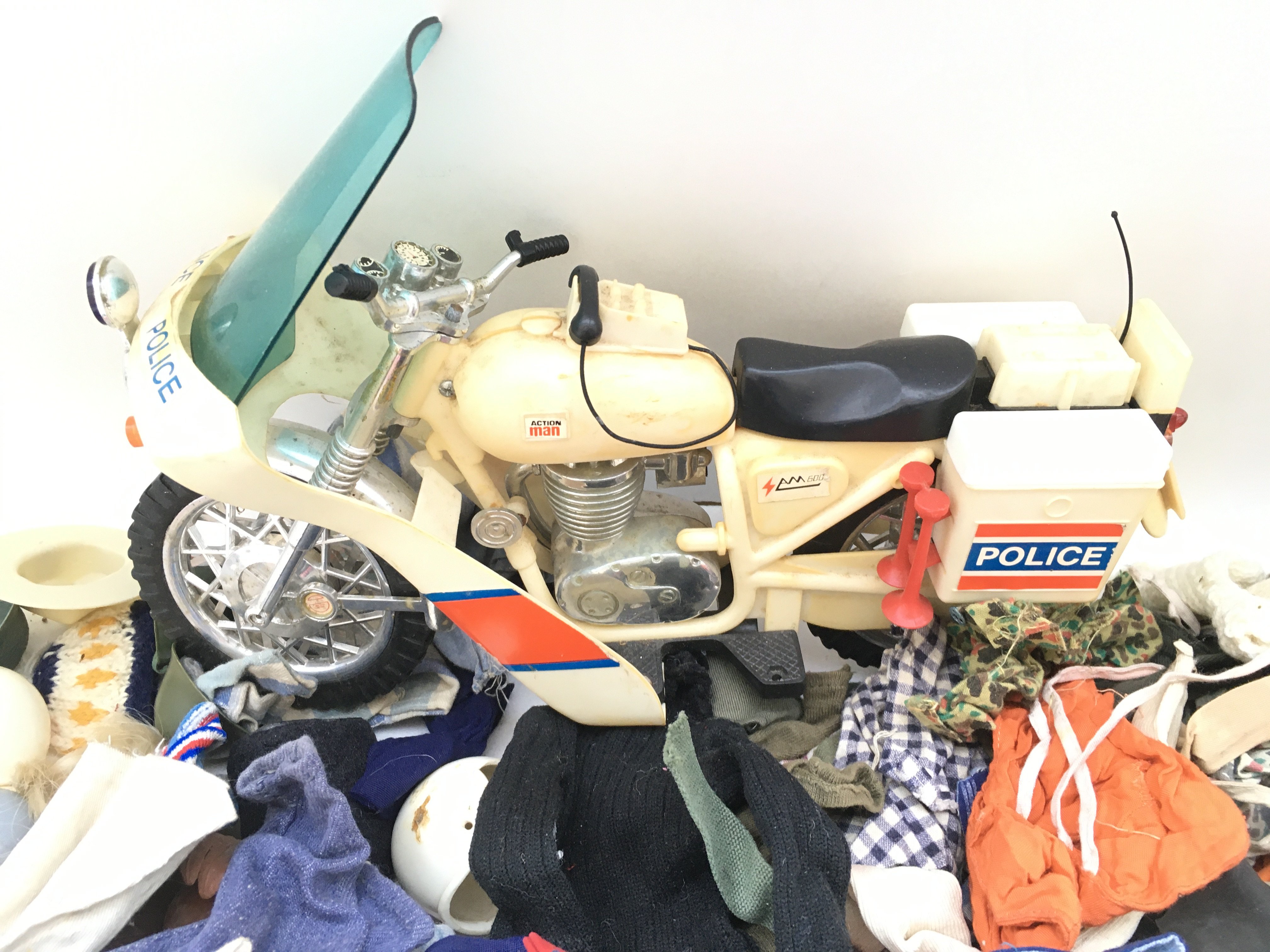 A Collection of Action Man Accessories Including police Motor Bike. Helmets. Boots.uniform.