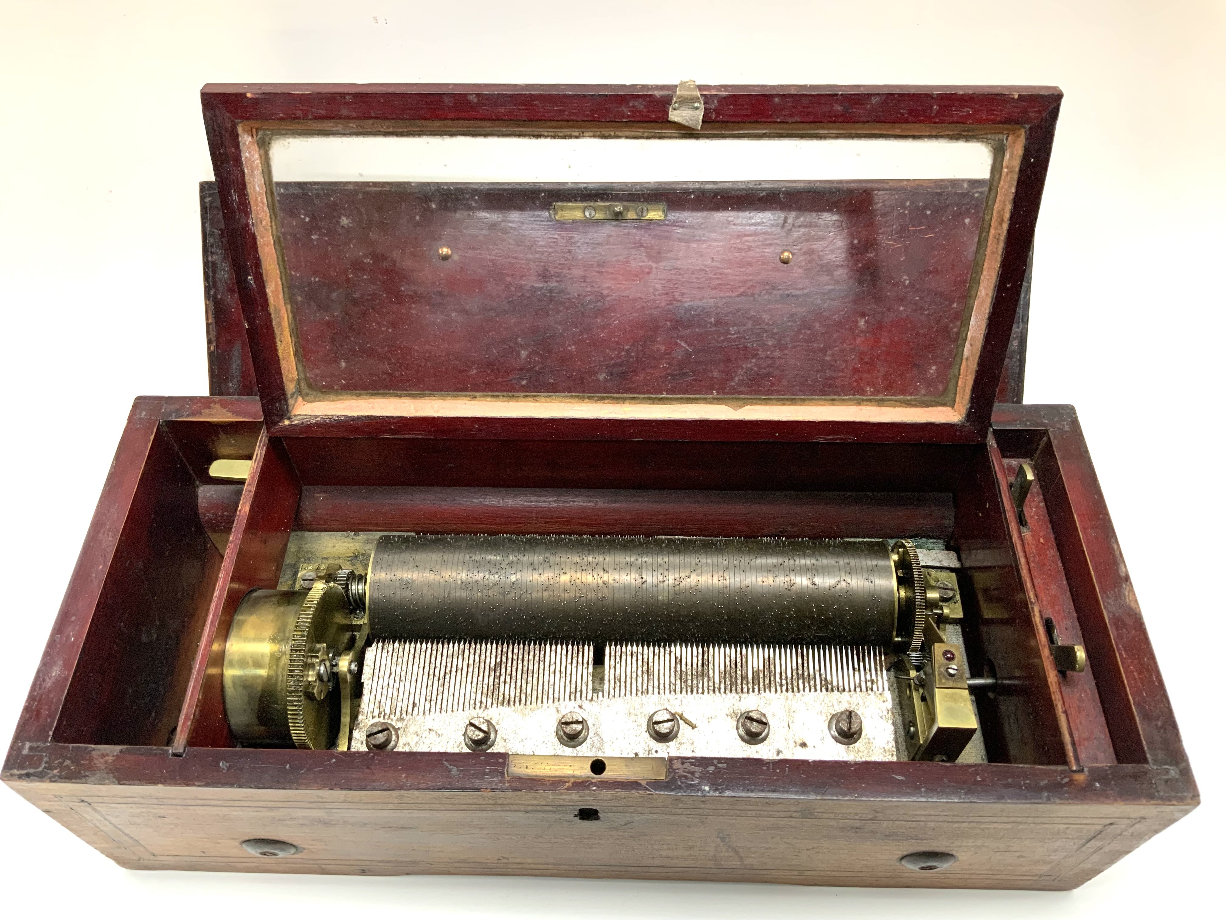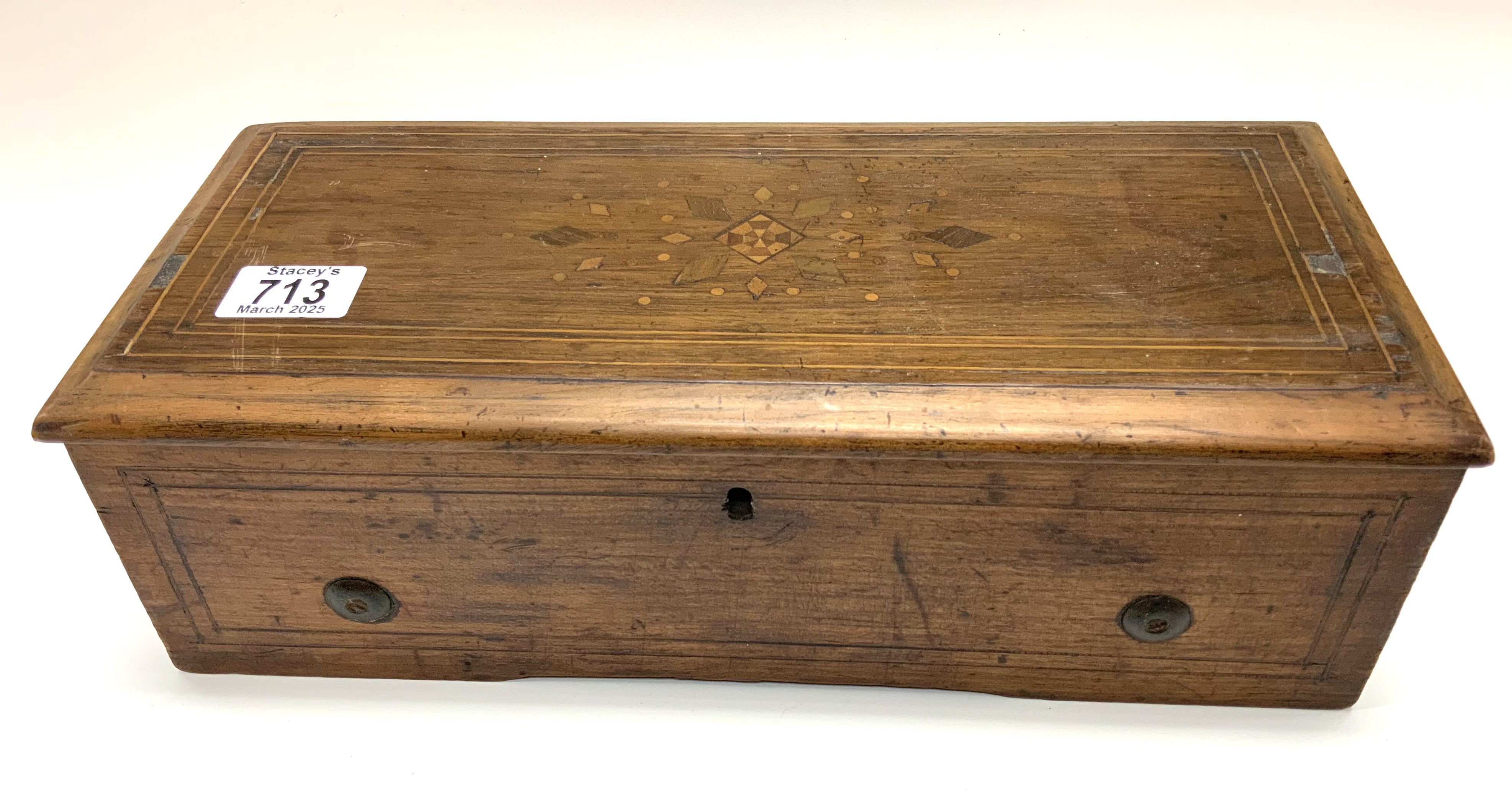 A small inlaid Victorian music box, in working condition, case in need of some restoration. 39cm x 13cm x 17cm. (D)