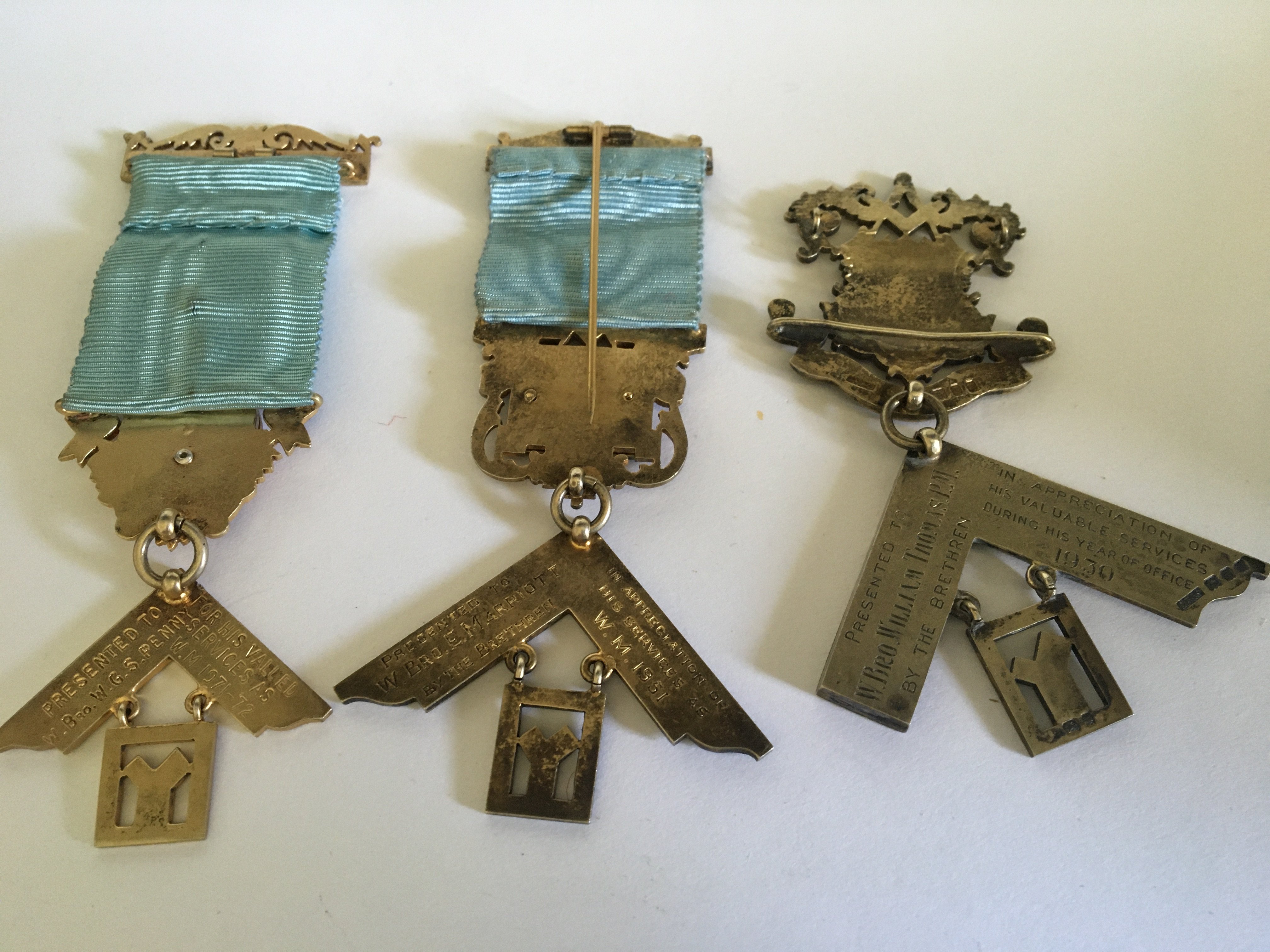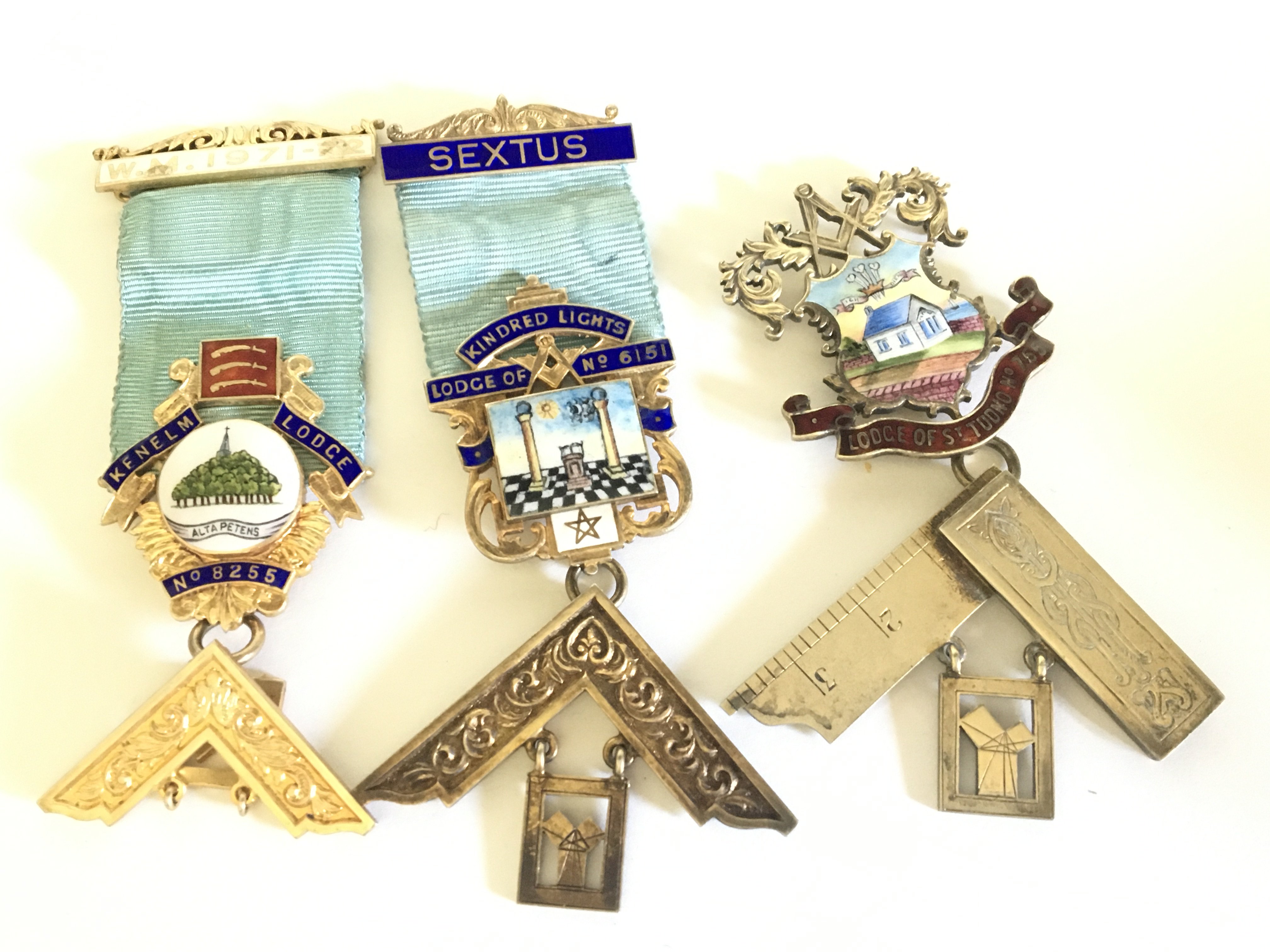 A silver gilt Masonic jewel 1930 with detailed enamel decoration St Tundo Lodge and two other gilt Jewels Kinder Lights and Kfnelm lodge (3)