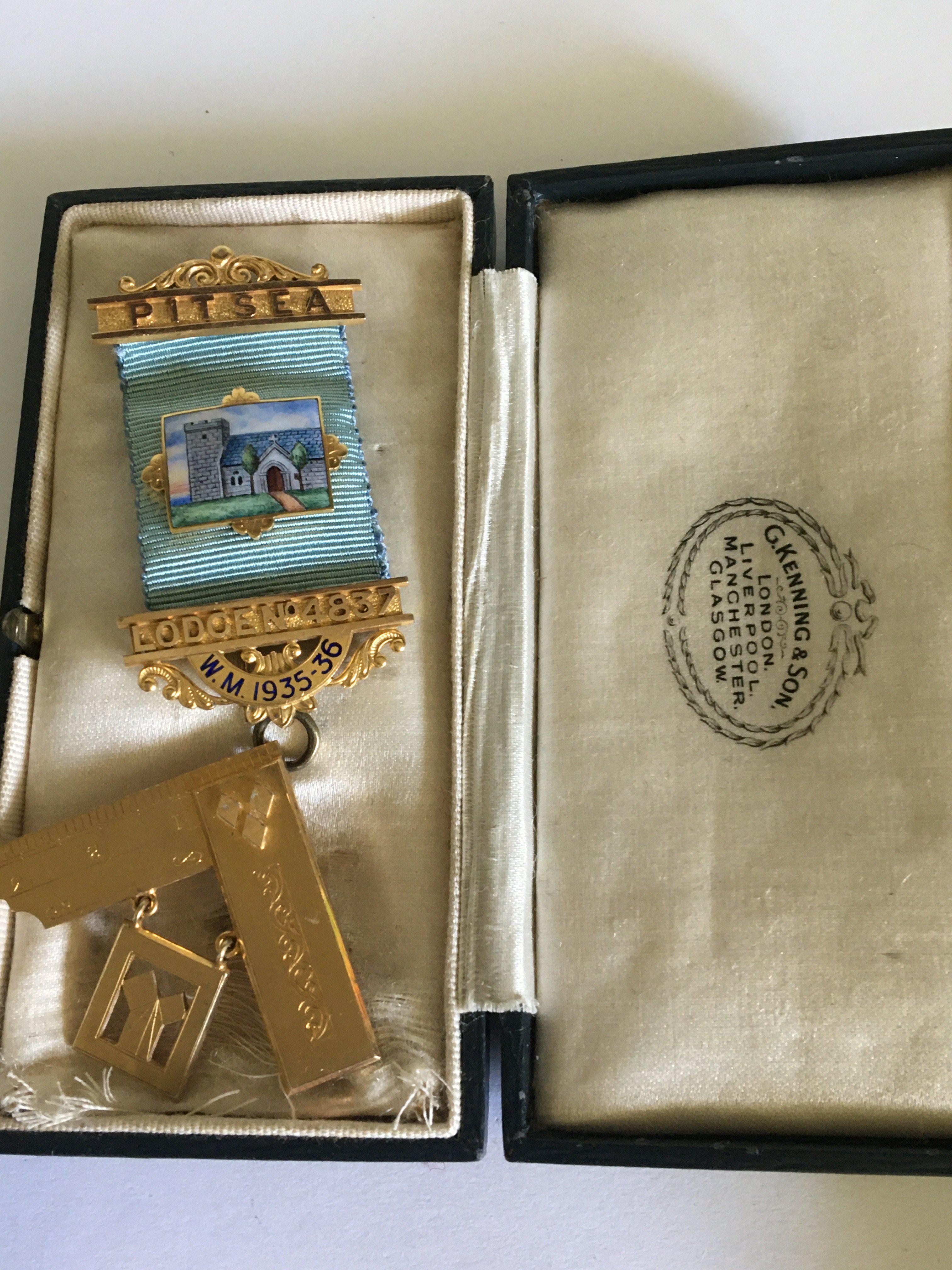 A 14carat gold 585 Masonic Jewel local Pitsea lodge with an applied silver and enamel view of the historical Pitsea Church. Total weight 35g approximately.