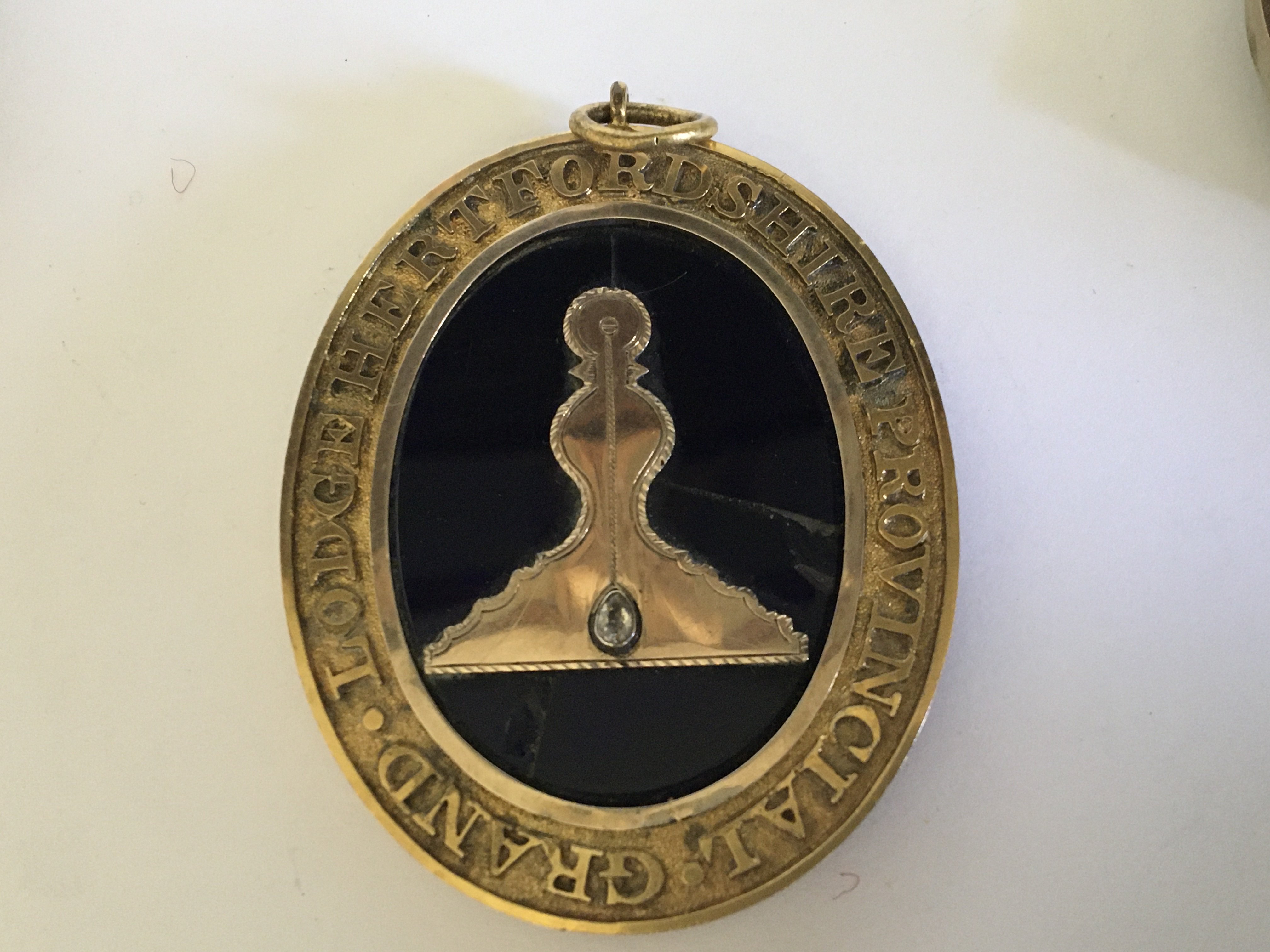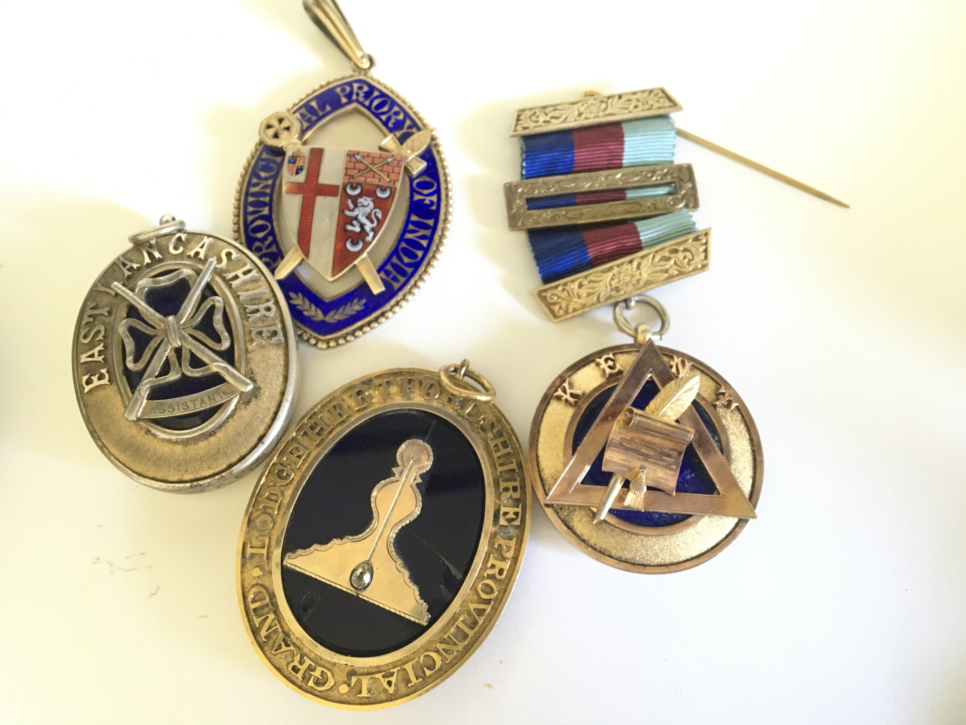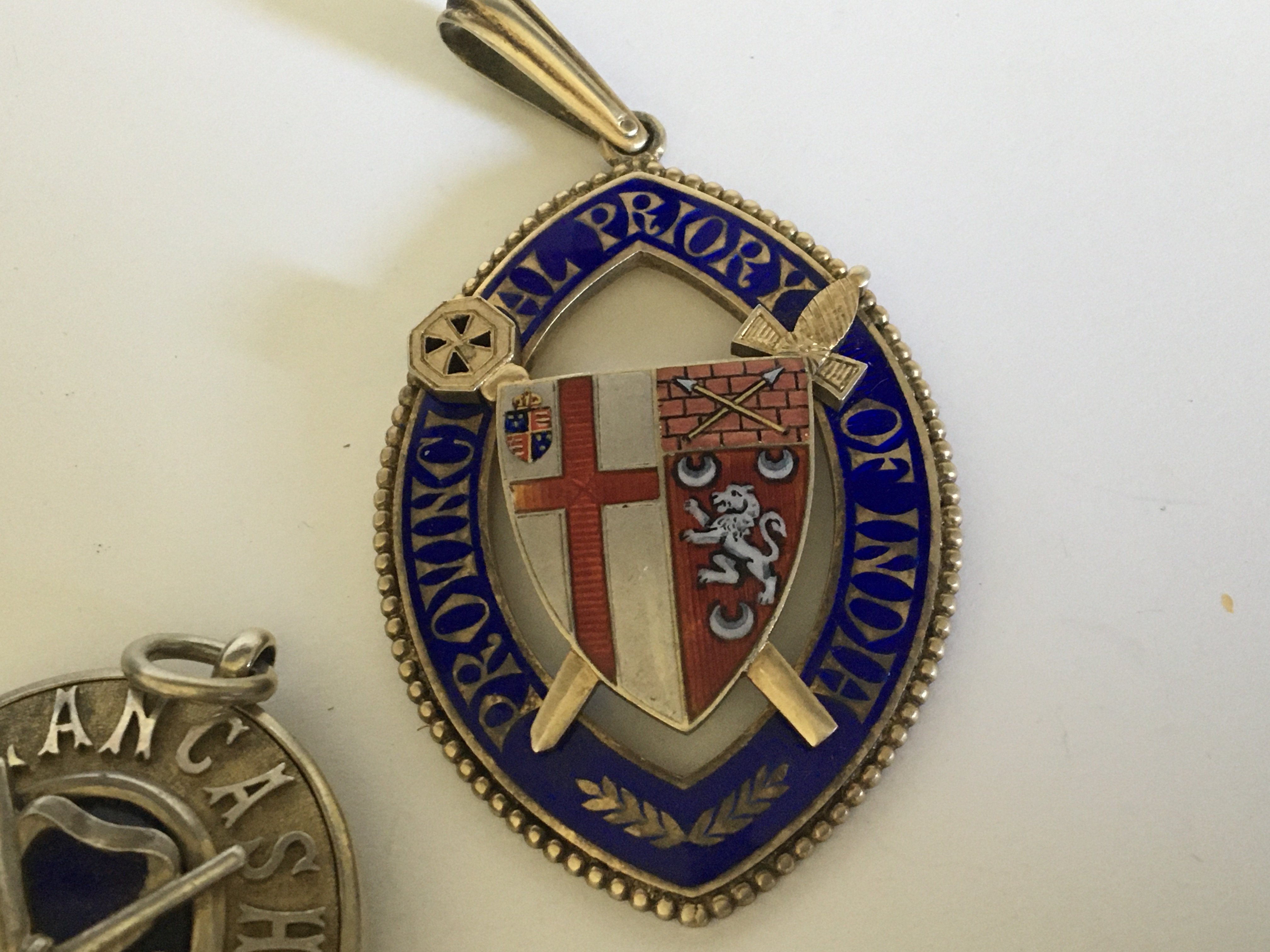 A Victorian Masonic Regalia Grand Rank collar Jewel Hertfordshire Provincial Grand Lodge the jewel set with an old cut pear shaped diamond with outer gold edge blue enamel (damaged) and three other silver gilt and elaborate enamel decorated Masonic Oval Collar Jewels The Provincial Priory of India East Lancashire and Kent (4)
