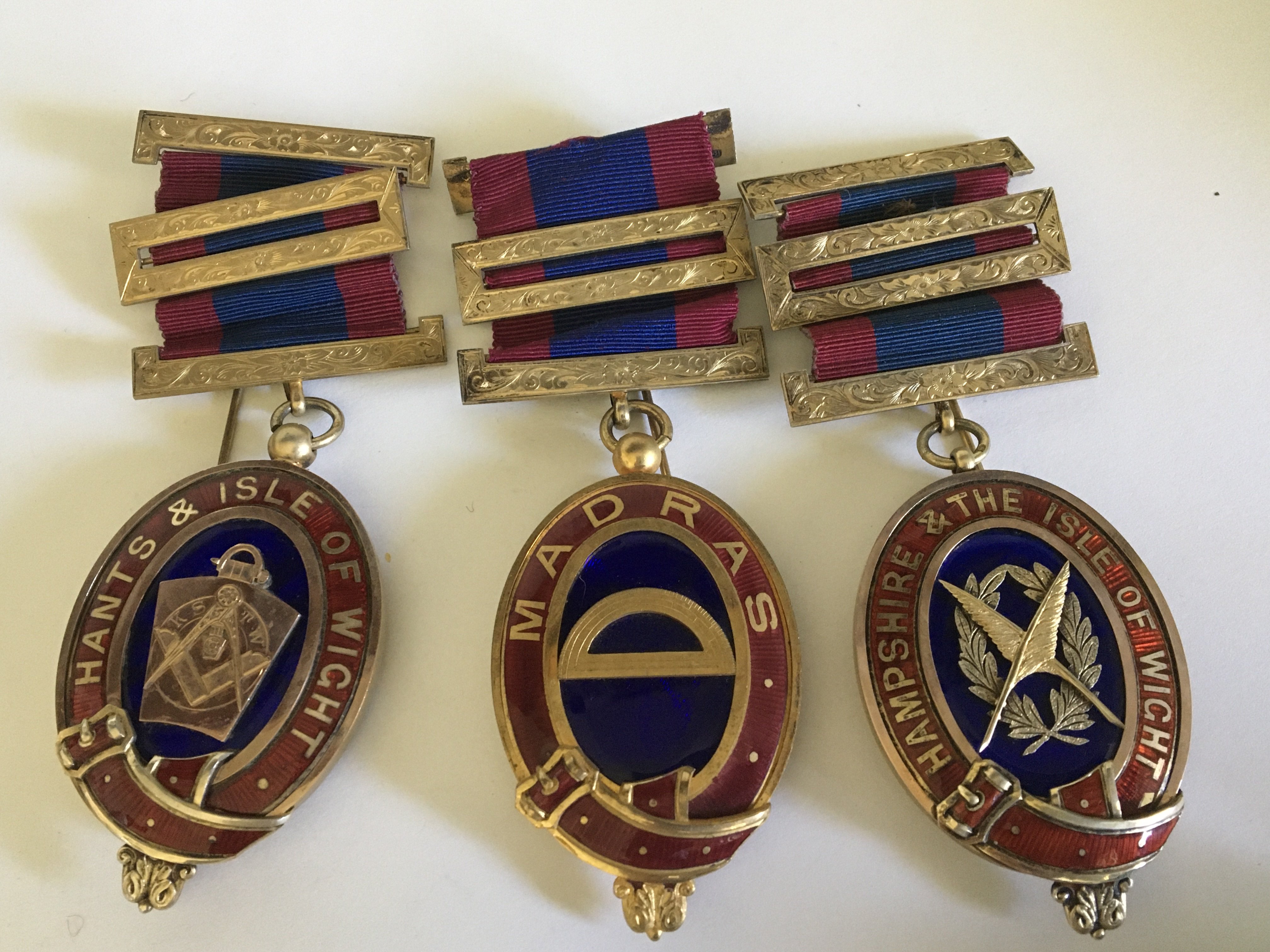 Three silver and gilt Passed Grand Masters Masonic County Jewels Hans & Isle of Wight 1914 Madras and 1918 Hampshire & The Isle of Wight (3)