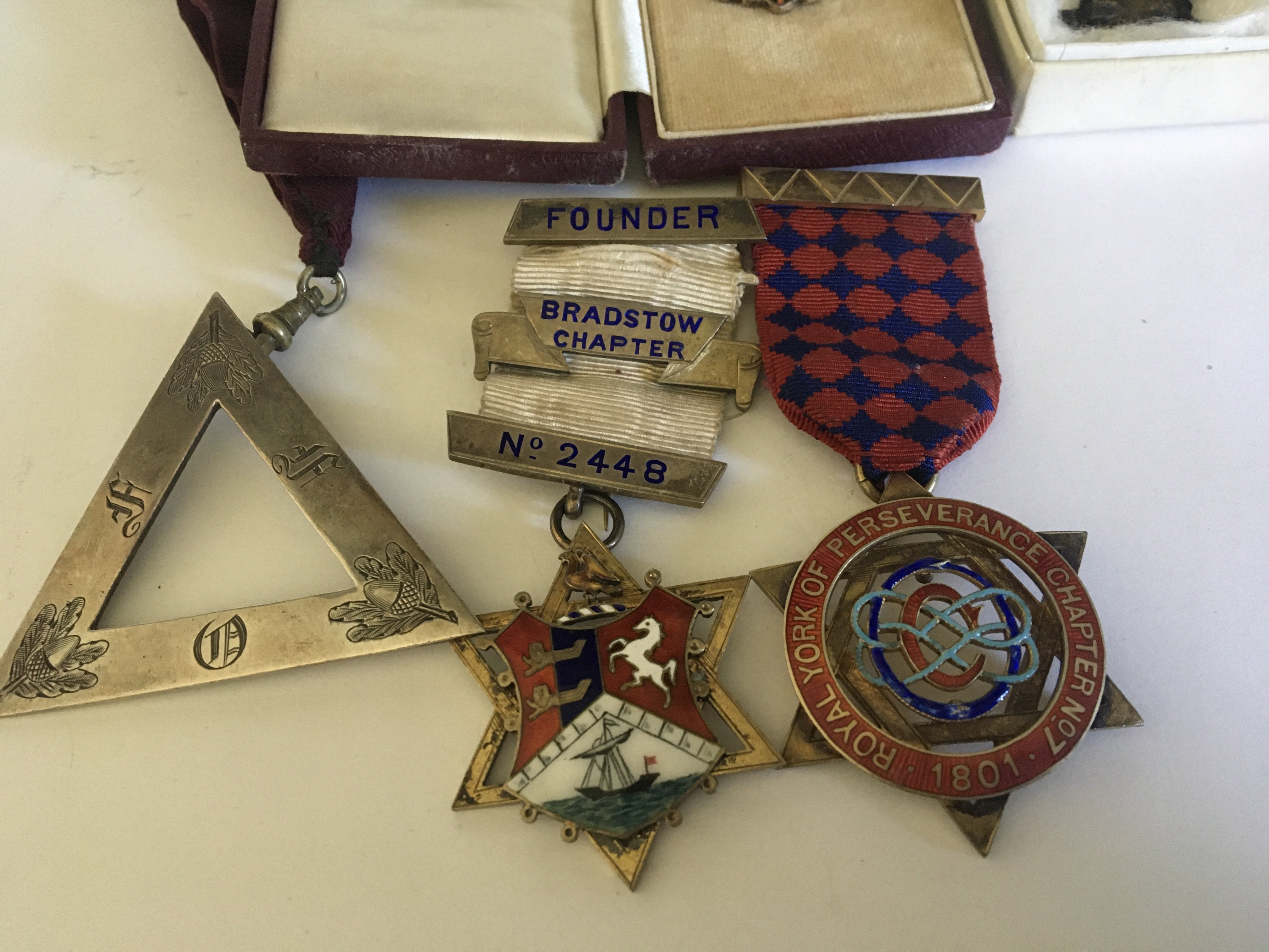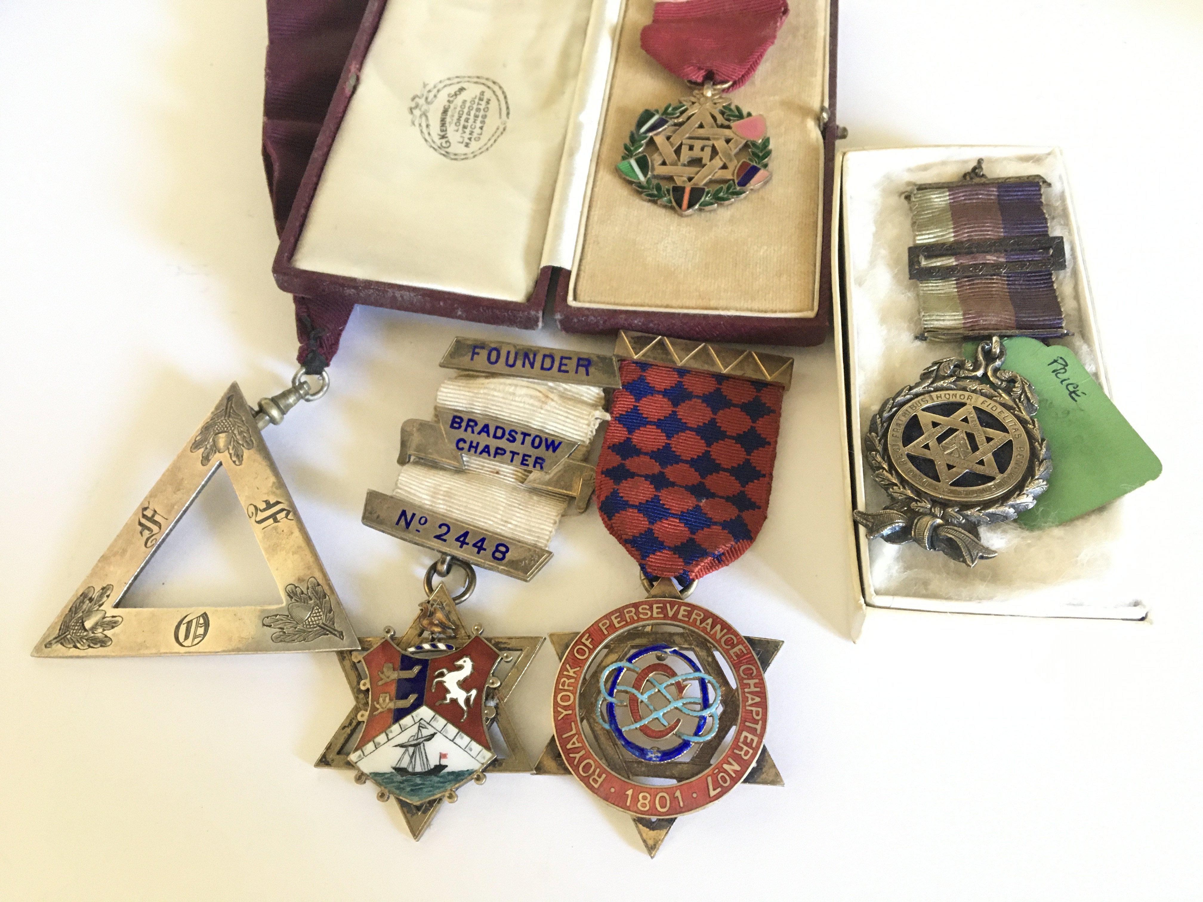 A Victorian 1865 silver Masonic jewel a silver Bradstow chapter founder jewel a 1912 silver collar jewel and others.