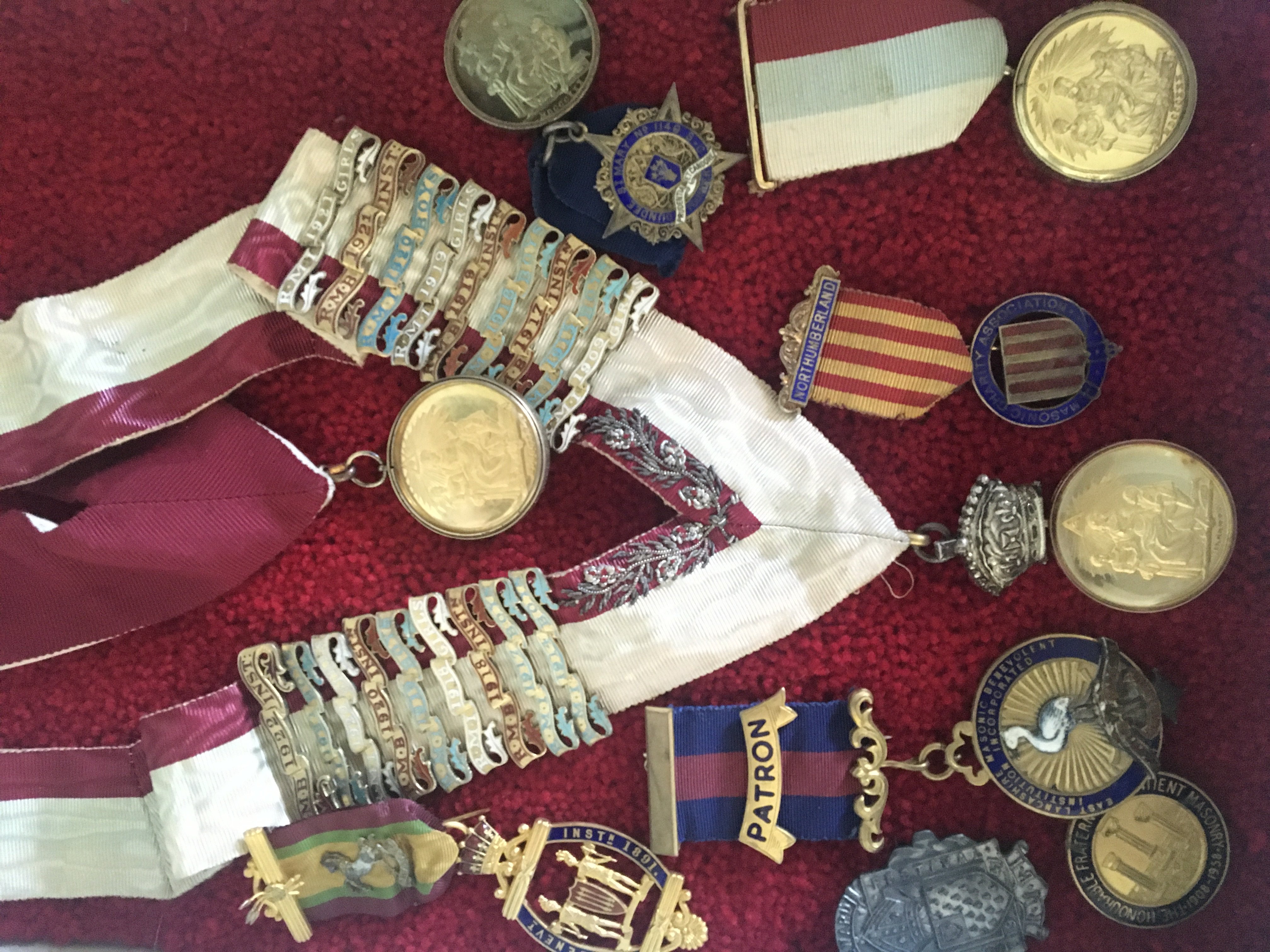 A collection of Masonic and conforming regalia including a collar with silver crown and gold edge jewel attachment badges and some silver gilt Jewels.