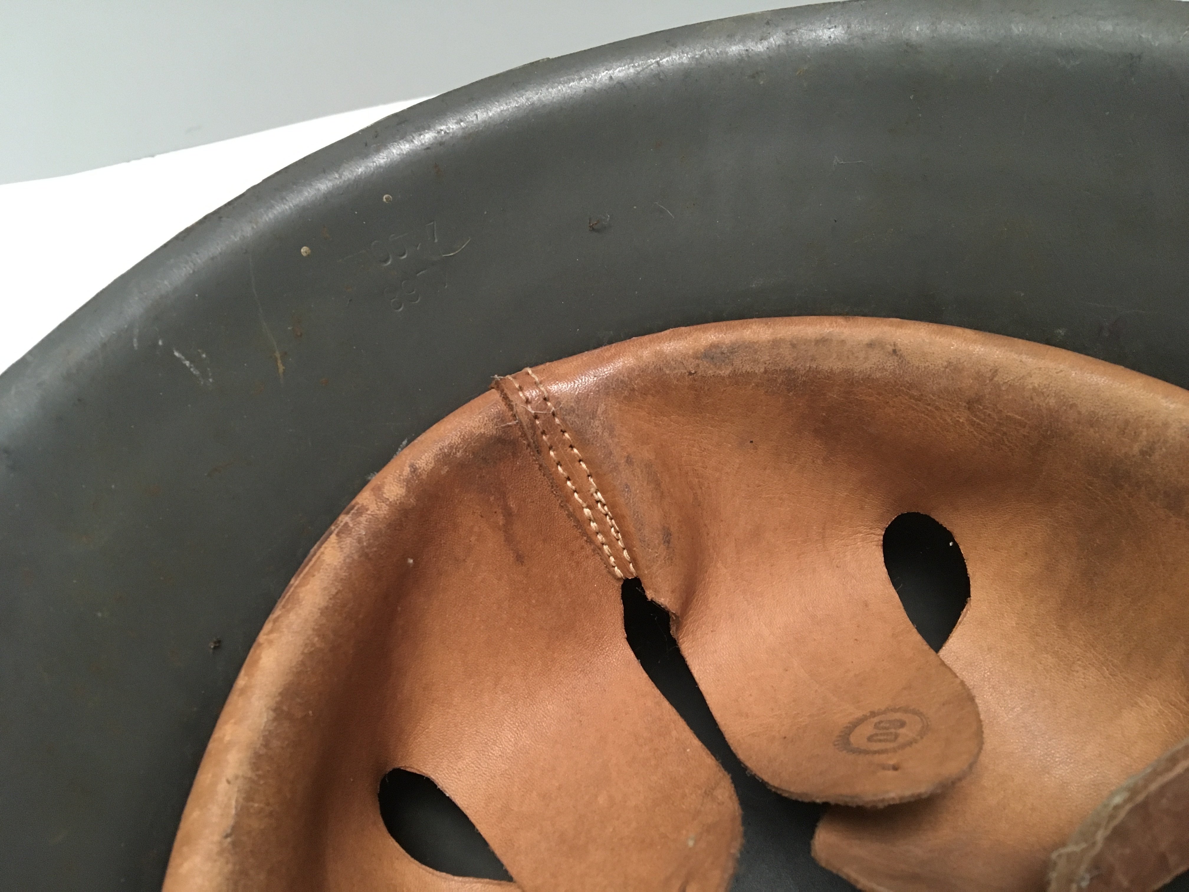 A Genuine German II world war Third Reich Military combat hemlmet M42 with original leather lining stamped number KL68 4100.