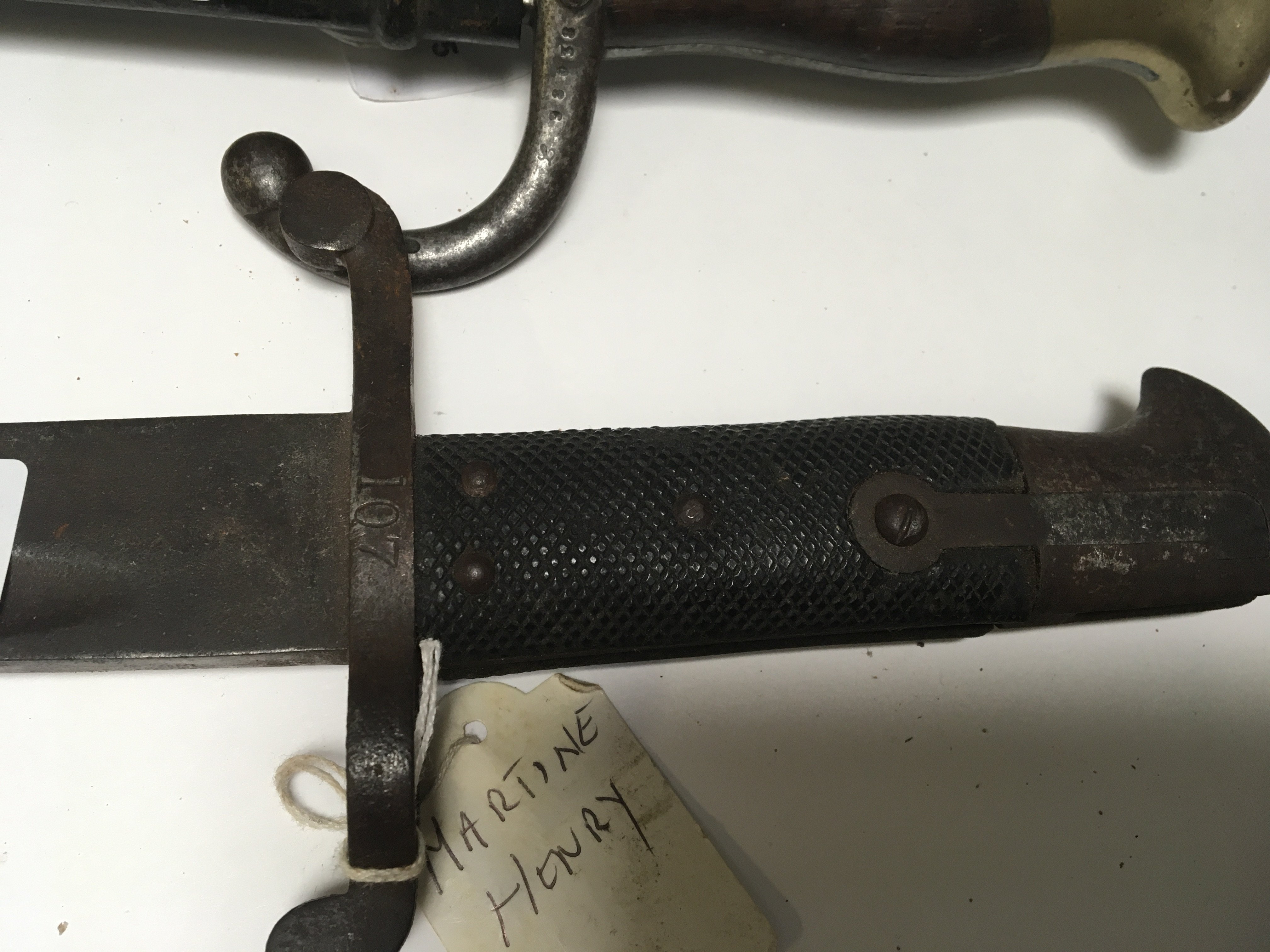 A British 1856 pattern Yataghan bayonet numbered 107 with further small stamp marks on the blade no scabbard a French 1866 pattern bayonet and an 1877 pattern bayonet with scabbard (3)