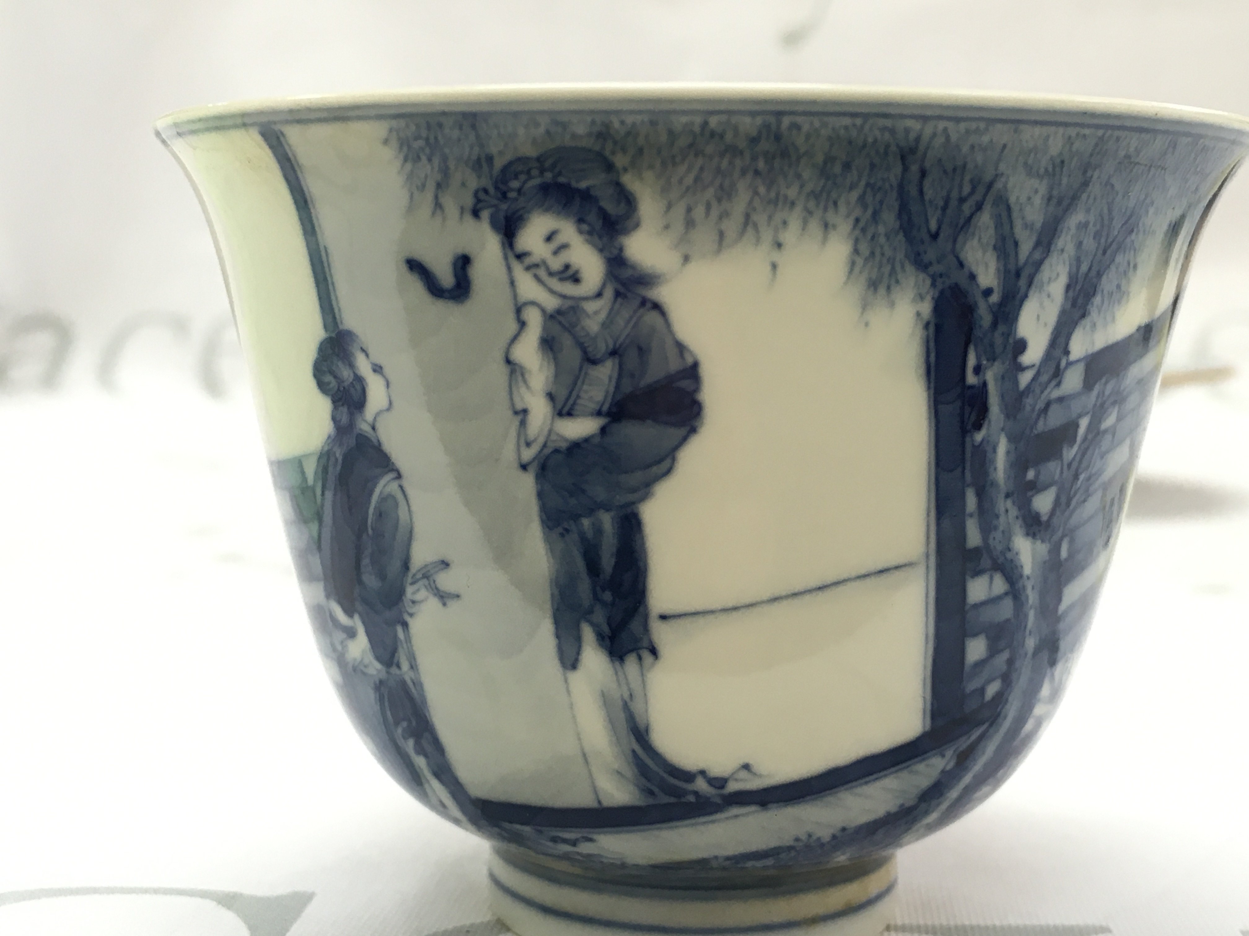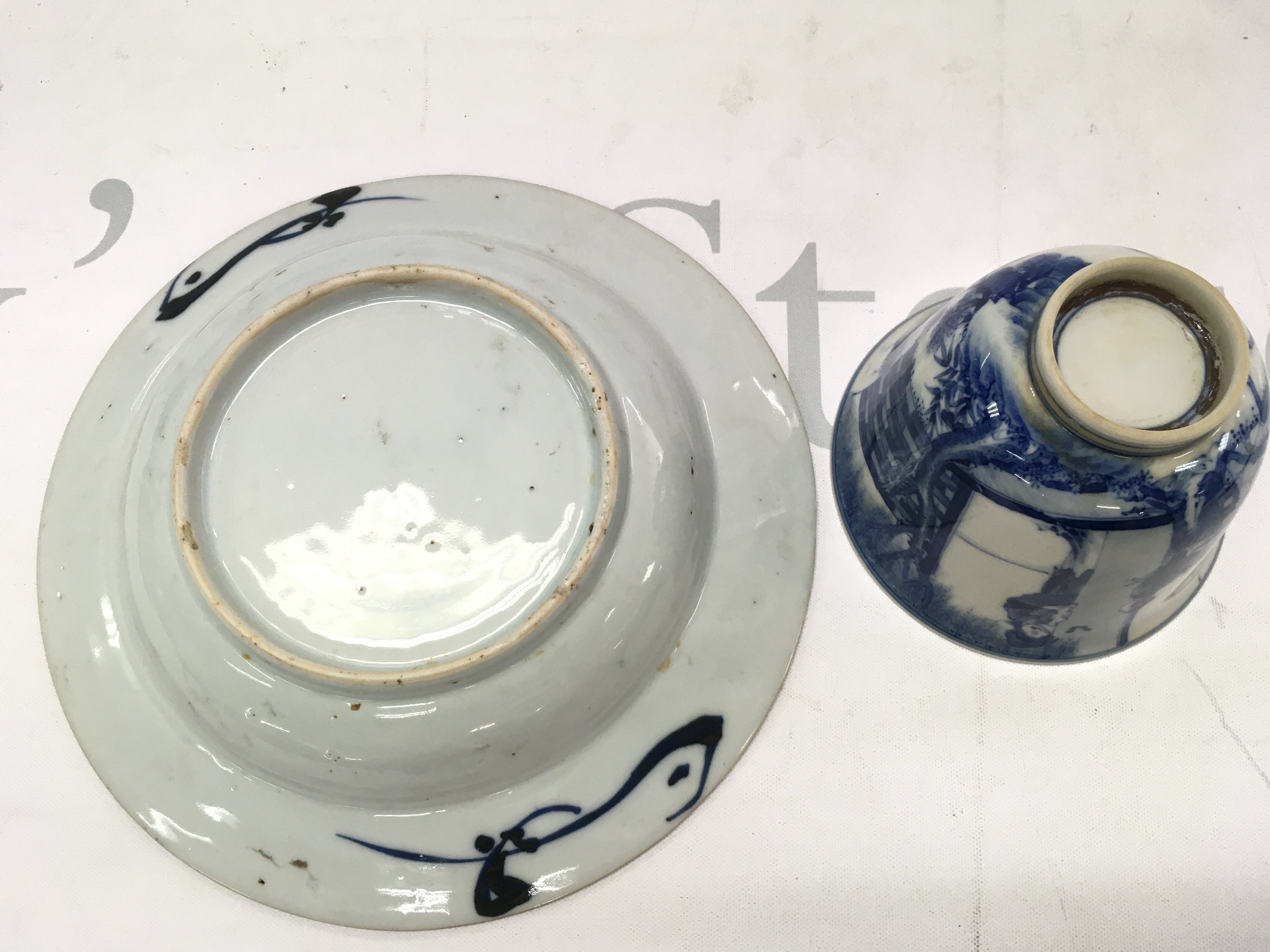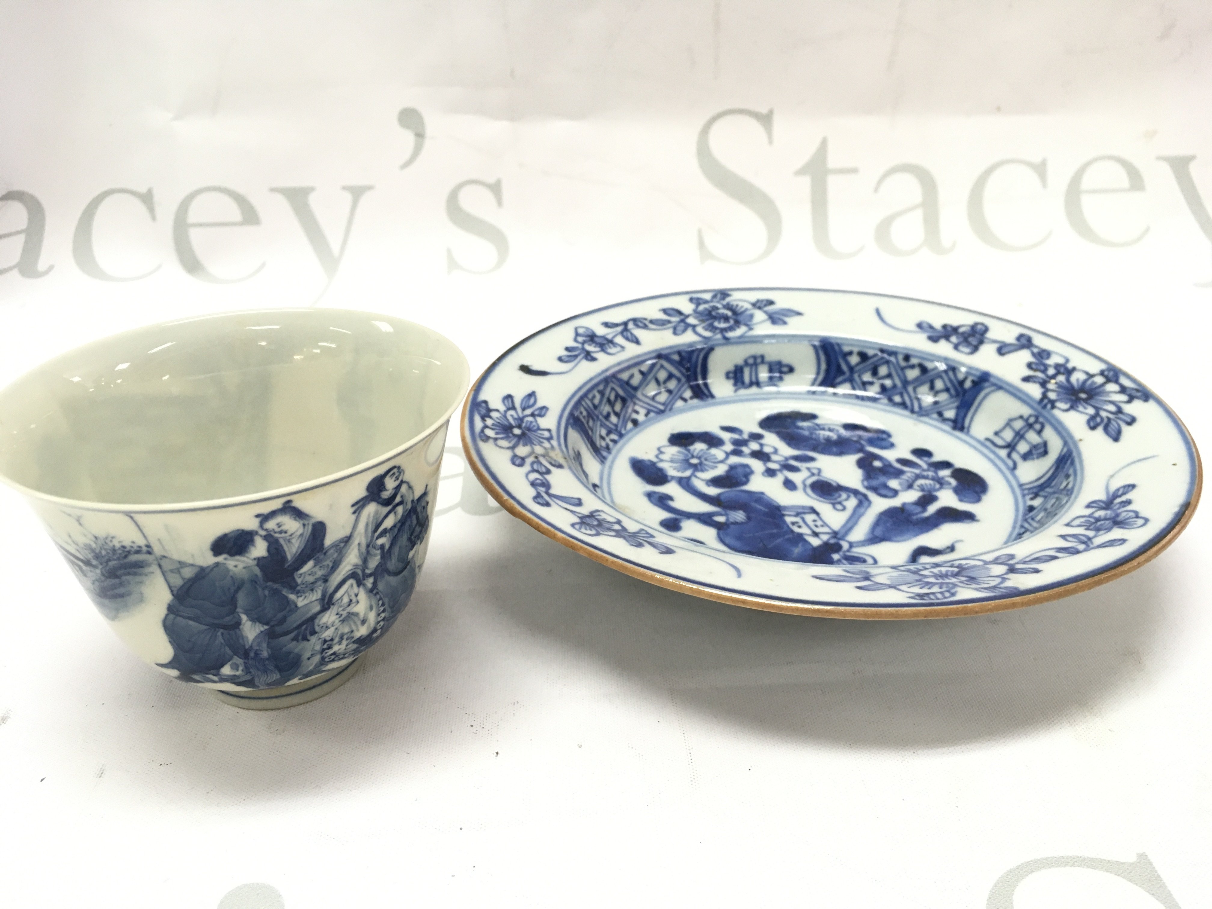 A Chinese blue and white tea bowl decorated with figures (6.5cm tall) and a floral plate 16.5cm wide (flaws in the glaze) . This lot cannot be posted