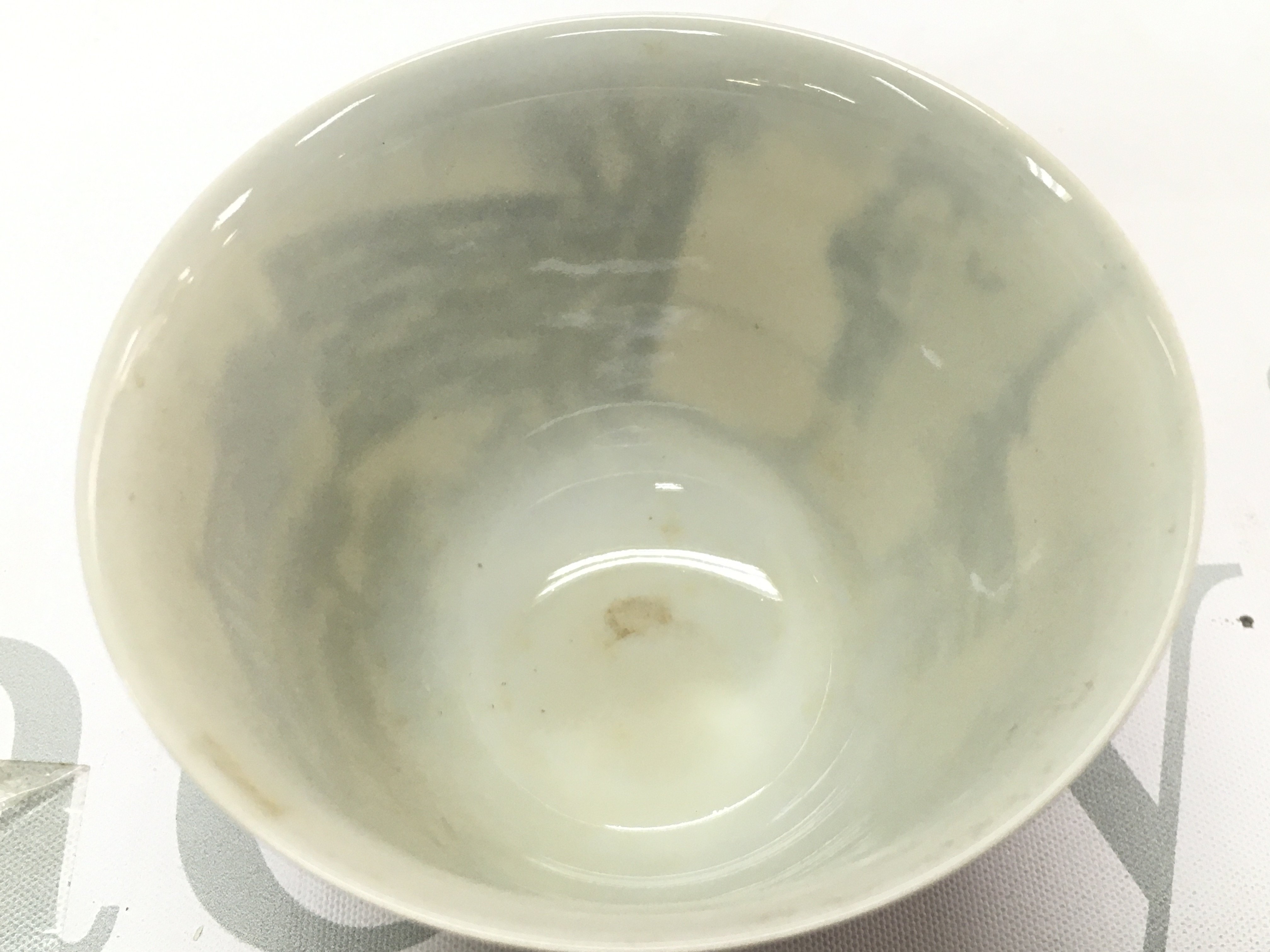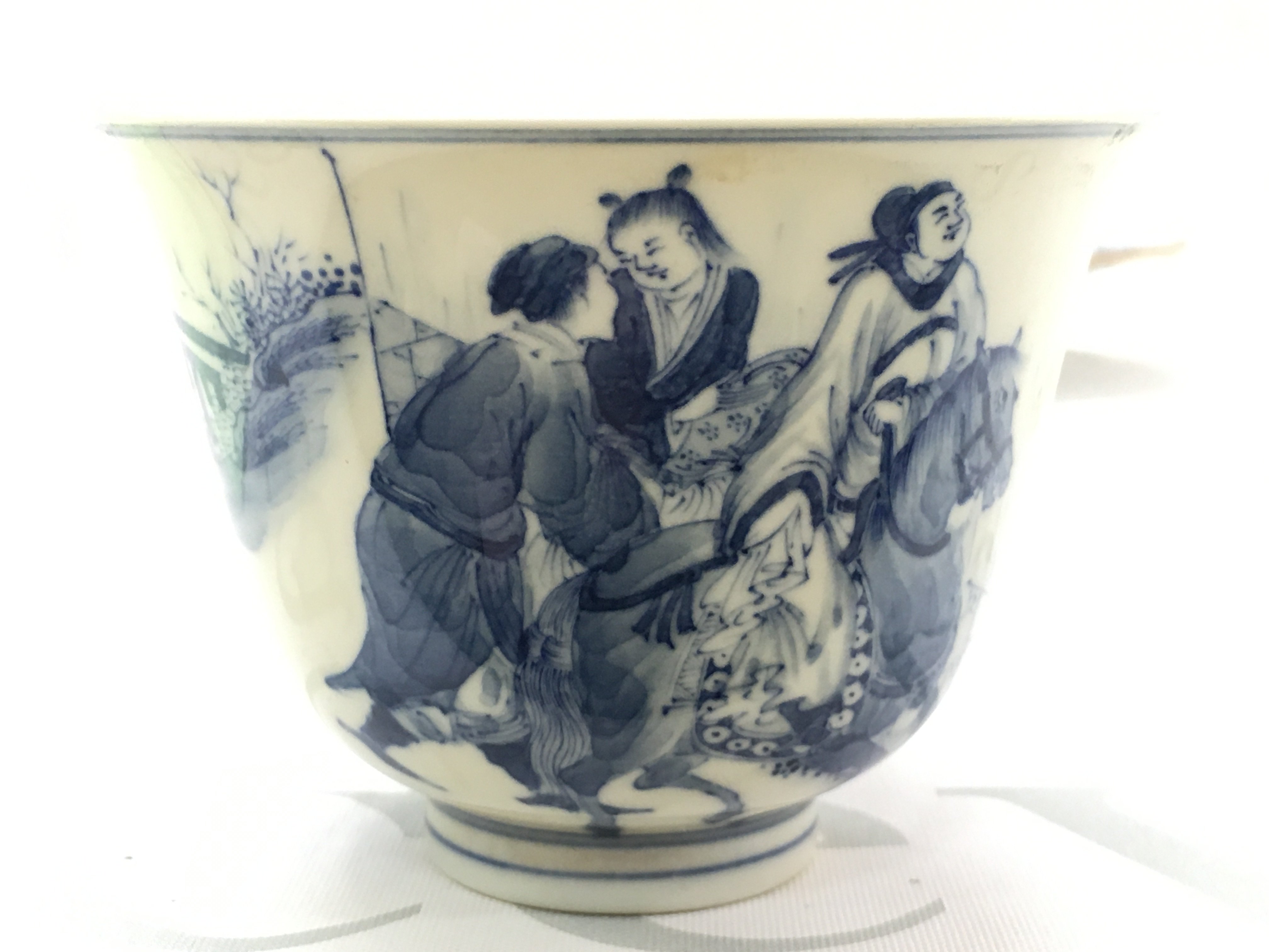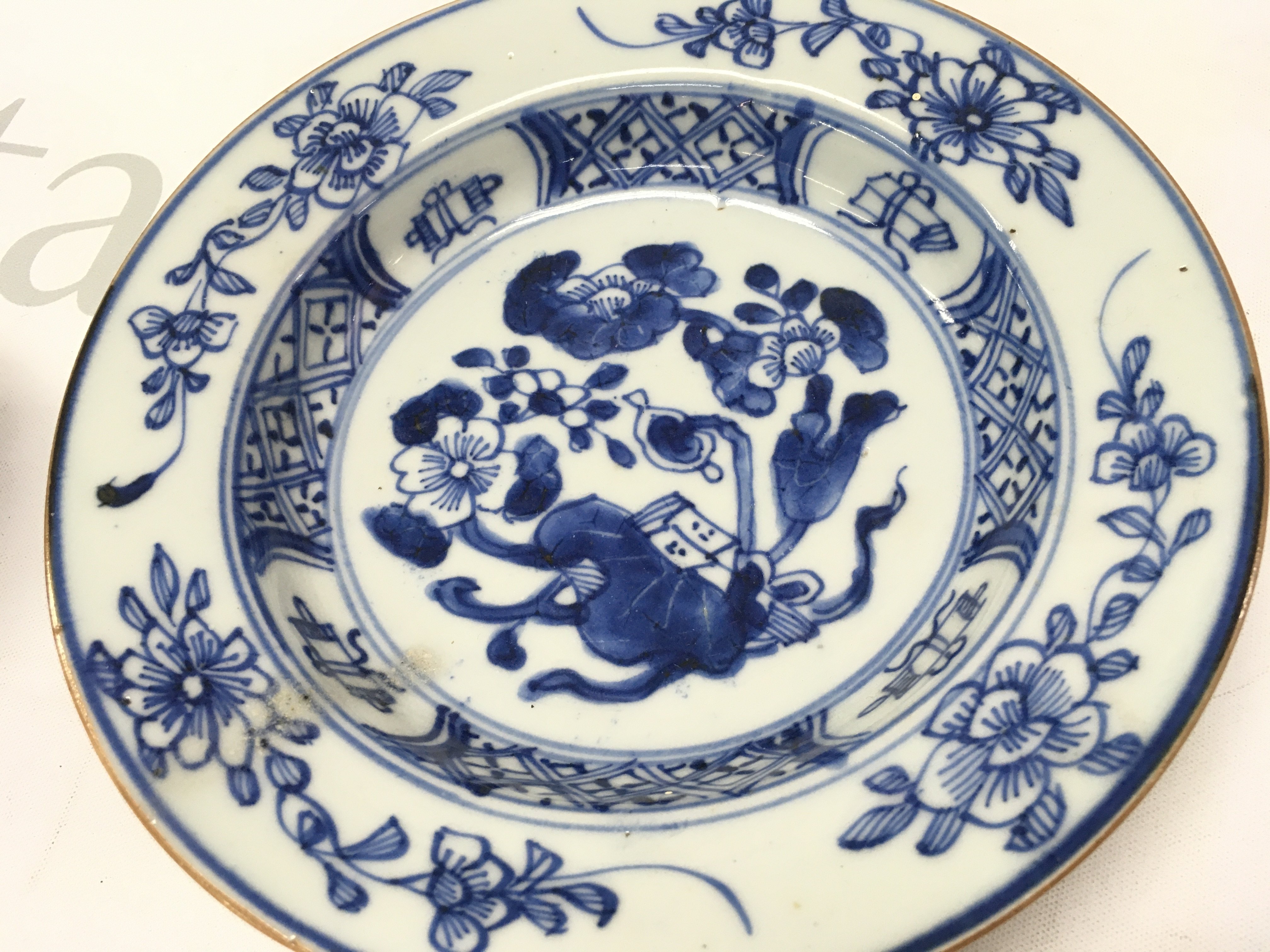 A Chinese blue and white tea bowl decorated with figures (6.5cm tall) and a floral plate 16.5cm wide (flaws in the glaze) . This lot cannot be posted