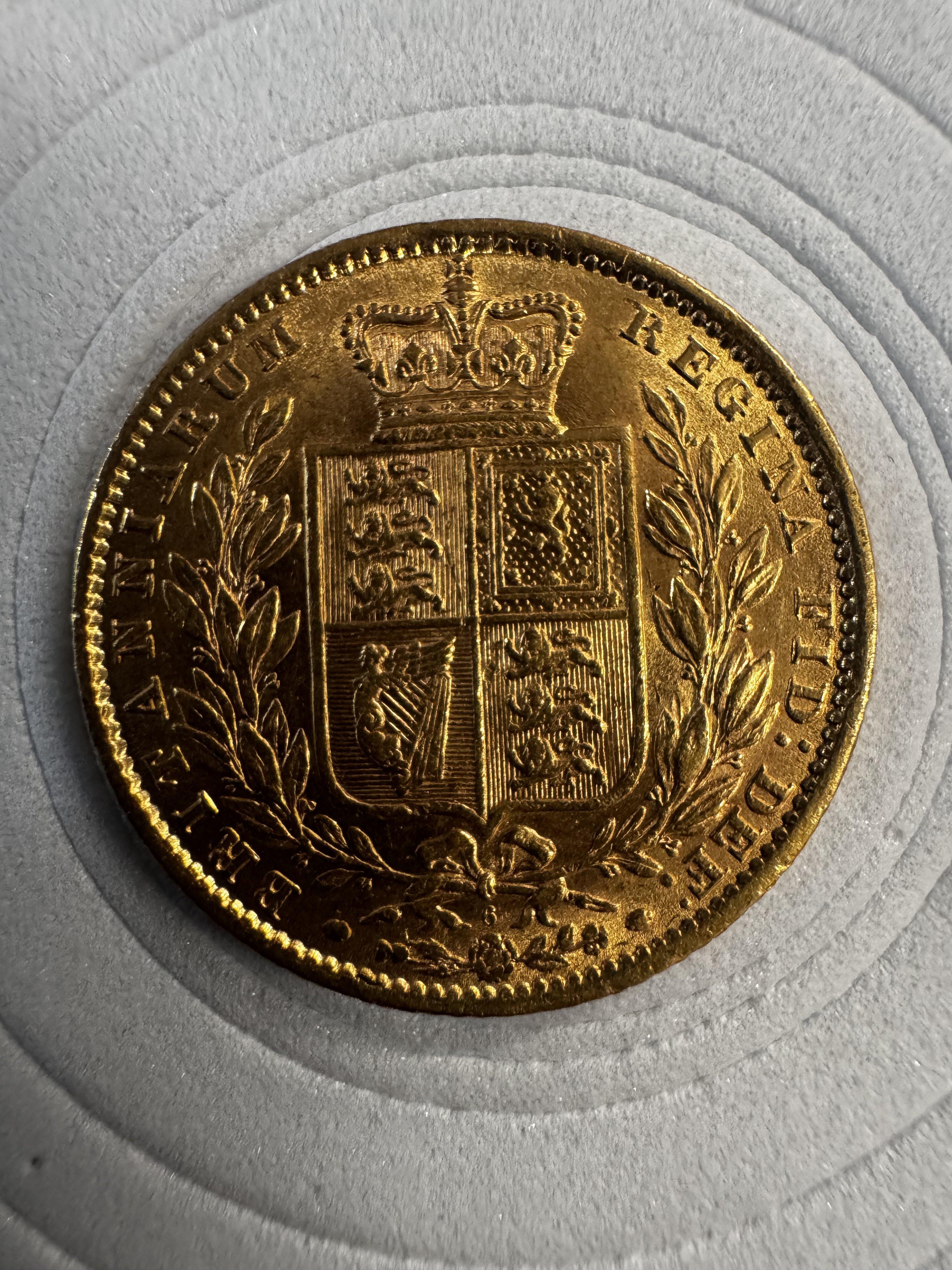 1872 Queen Victoria young head full sovereign, die number 6 . (A)
