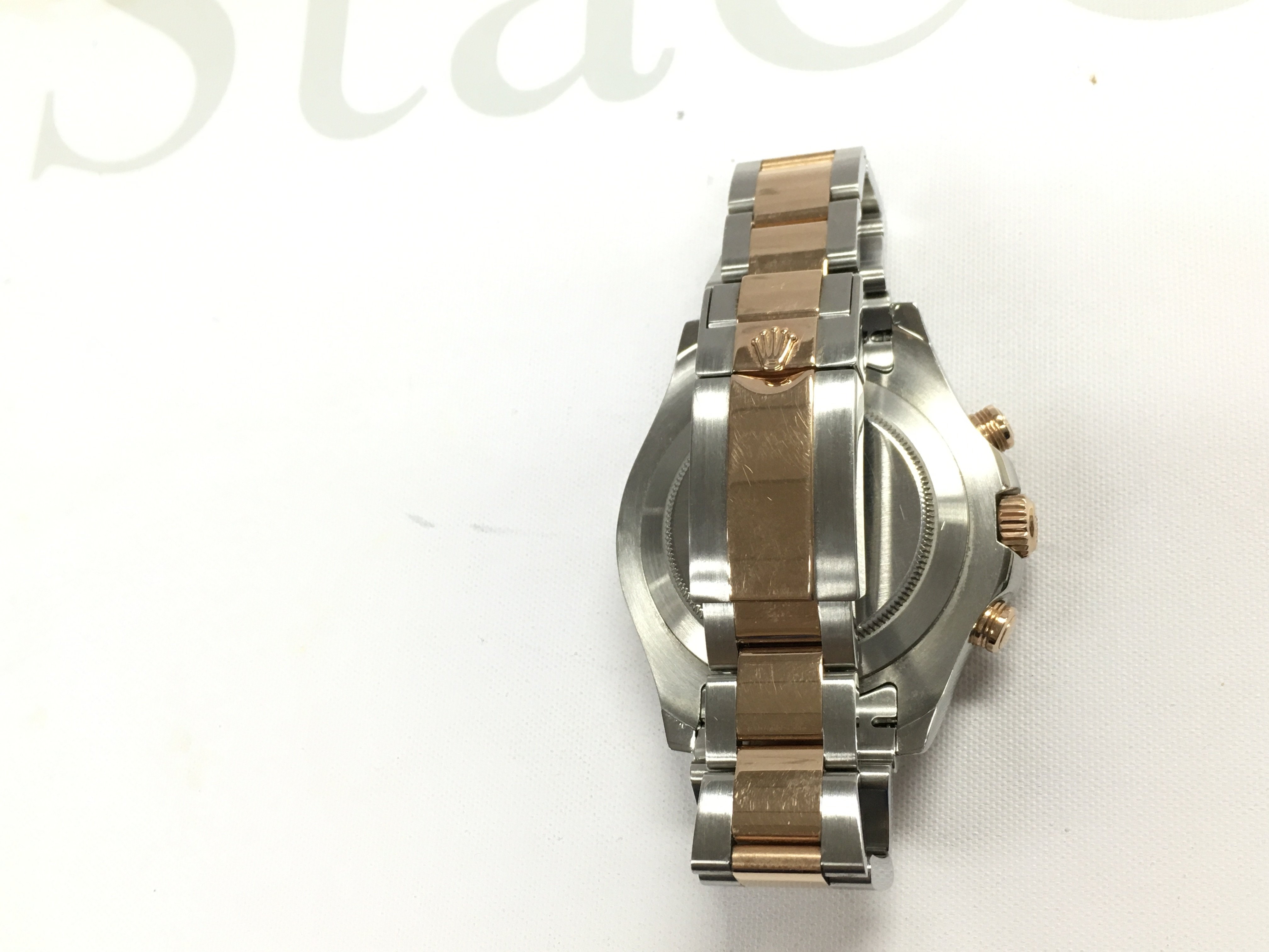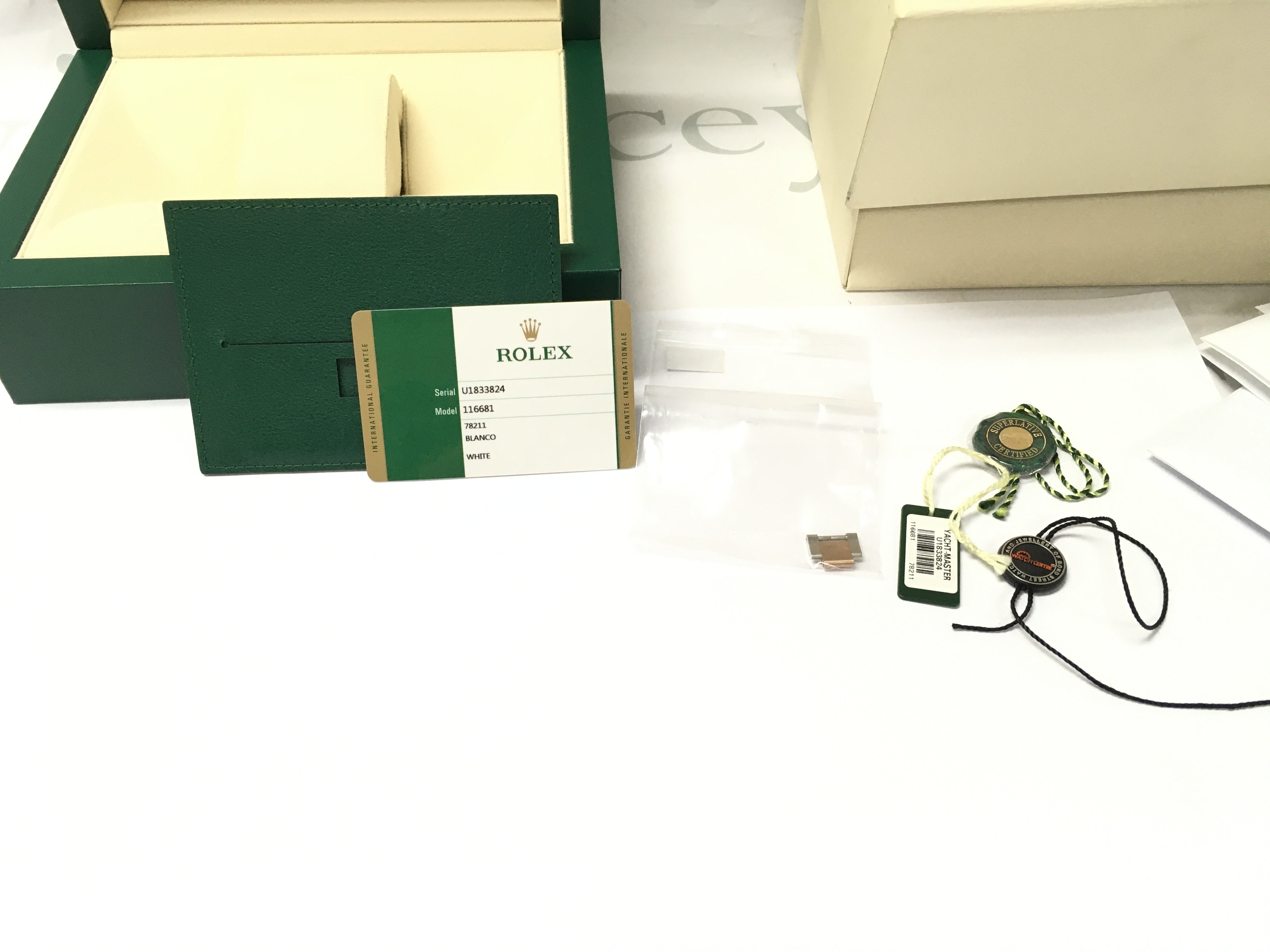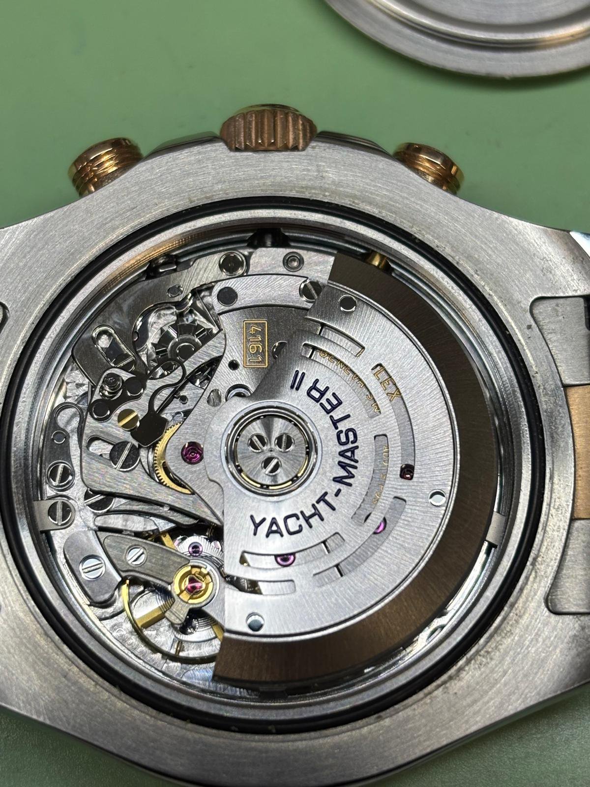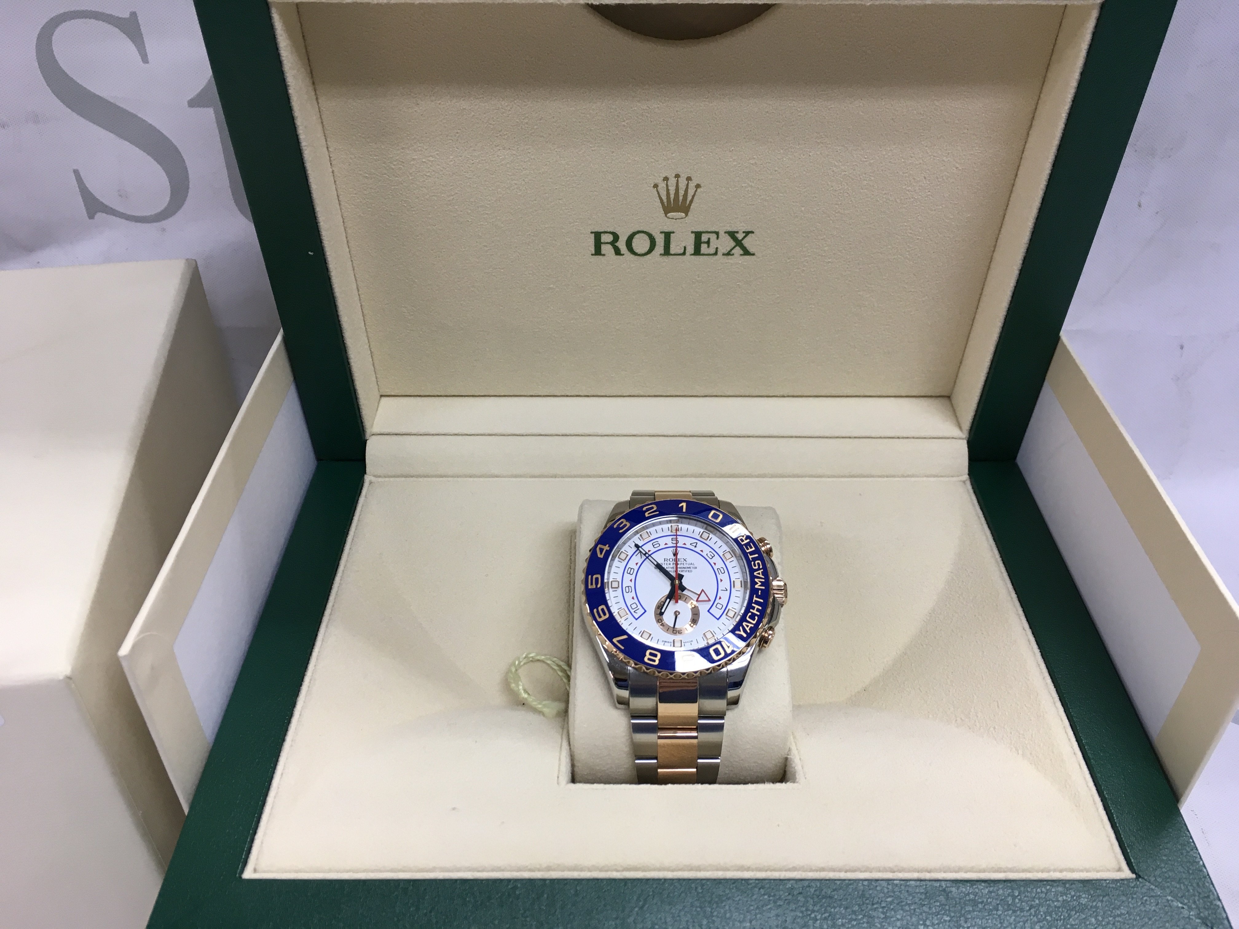 A Rolex yacht master II 2015 comes with box papers and swing tags. 44mm case with steel and gold oyster bracelet. White dial. Seen running. Model 116681.