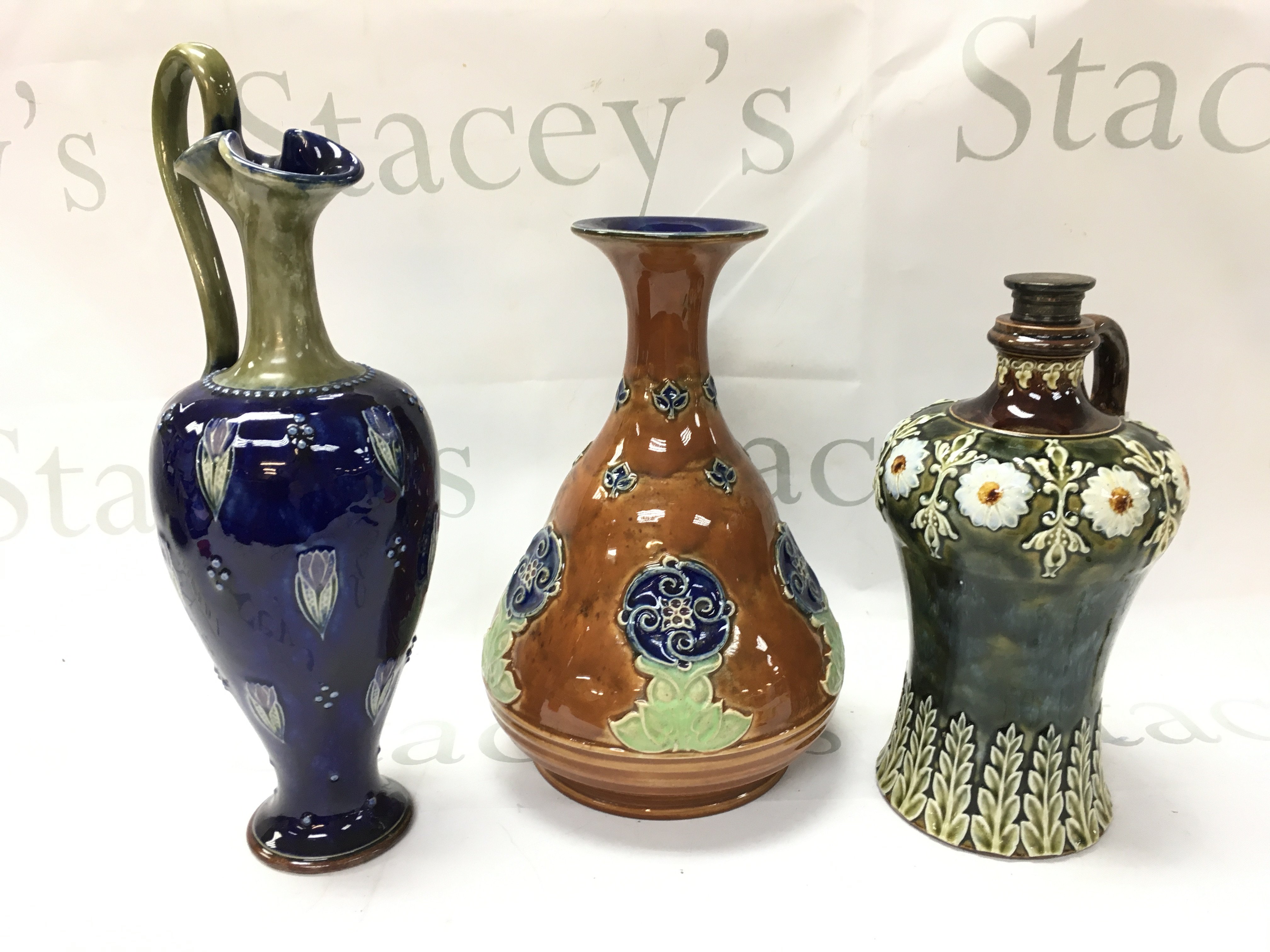 Royal Doulton Lambeth stoneware vases including a claret jug, Whiskey flagon. No obvious damage or restoration. 23 to 30cm tall approximately. This lot cannot be posted. NO RESERVE
