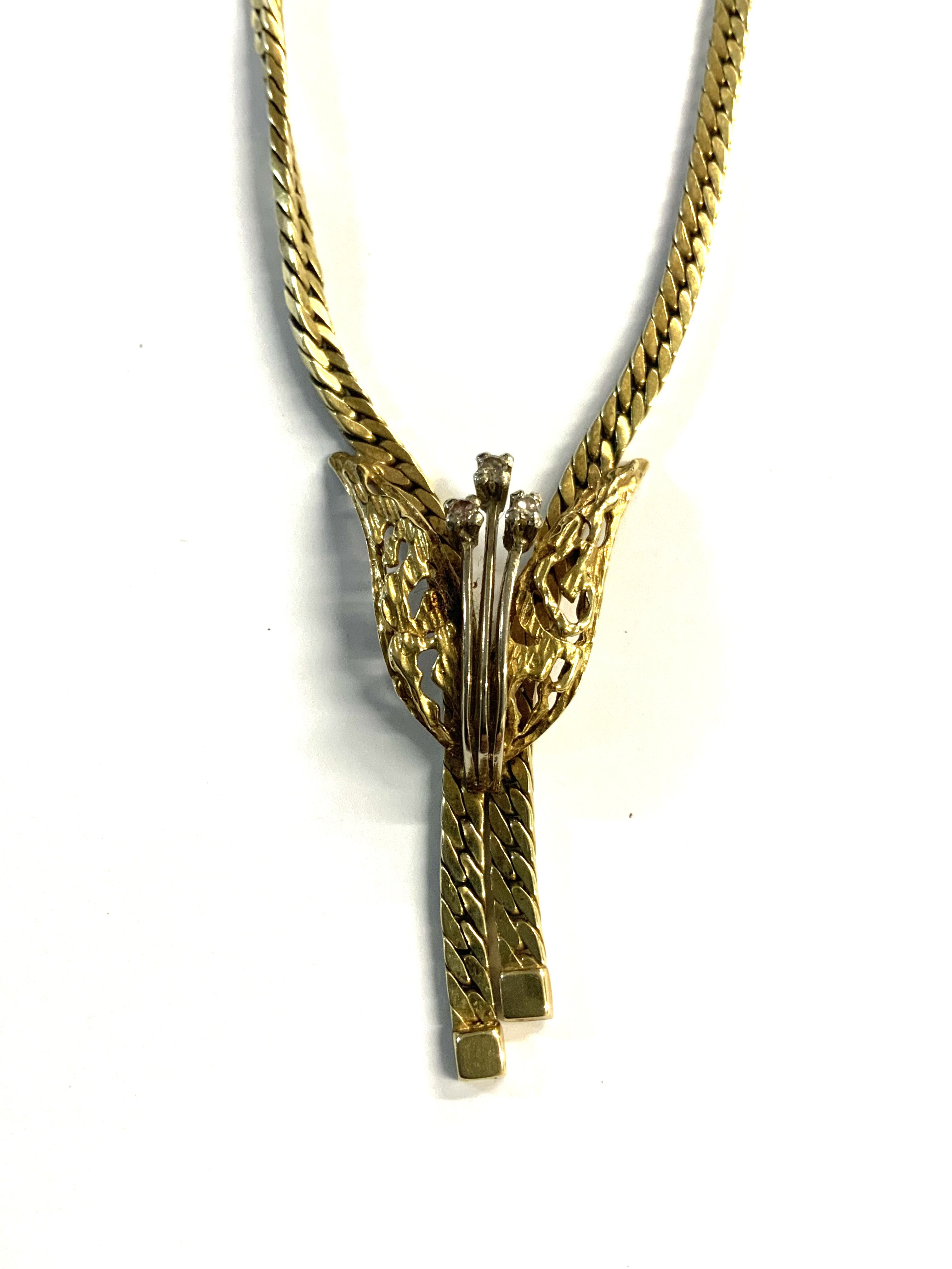 A modern design 14ct yellow gold hallmarked necklace the drop in the form of a flower with set with 3 small diamonds. 22.4g.