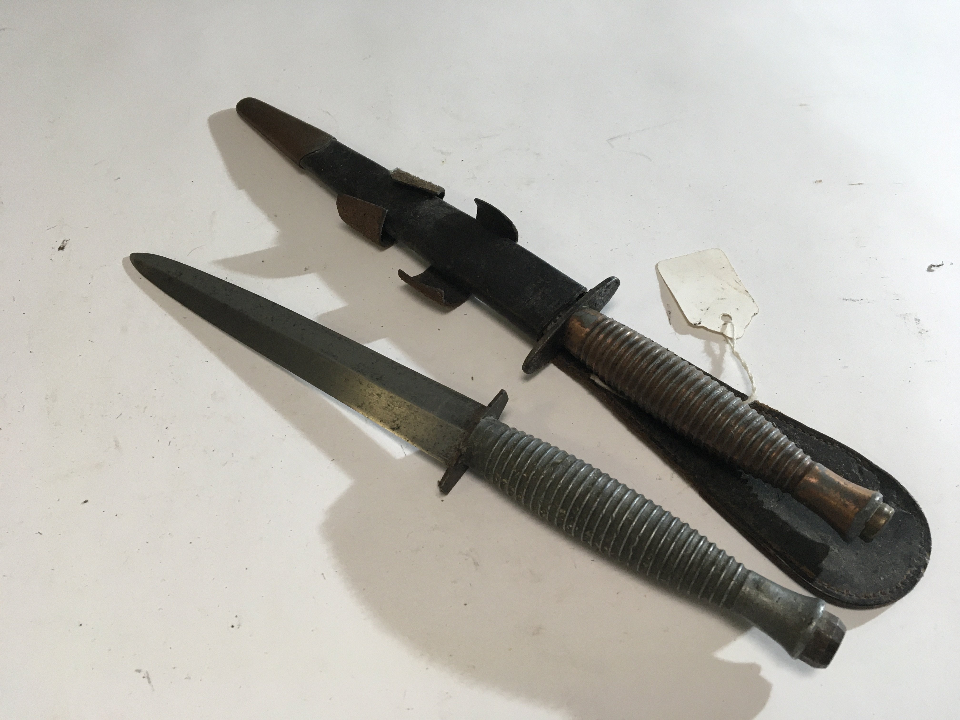A Fairbrain Sykes Commando fighting knife and one other possible II world war issue Third pattern one with obscure marks to the cross guard. (2)
