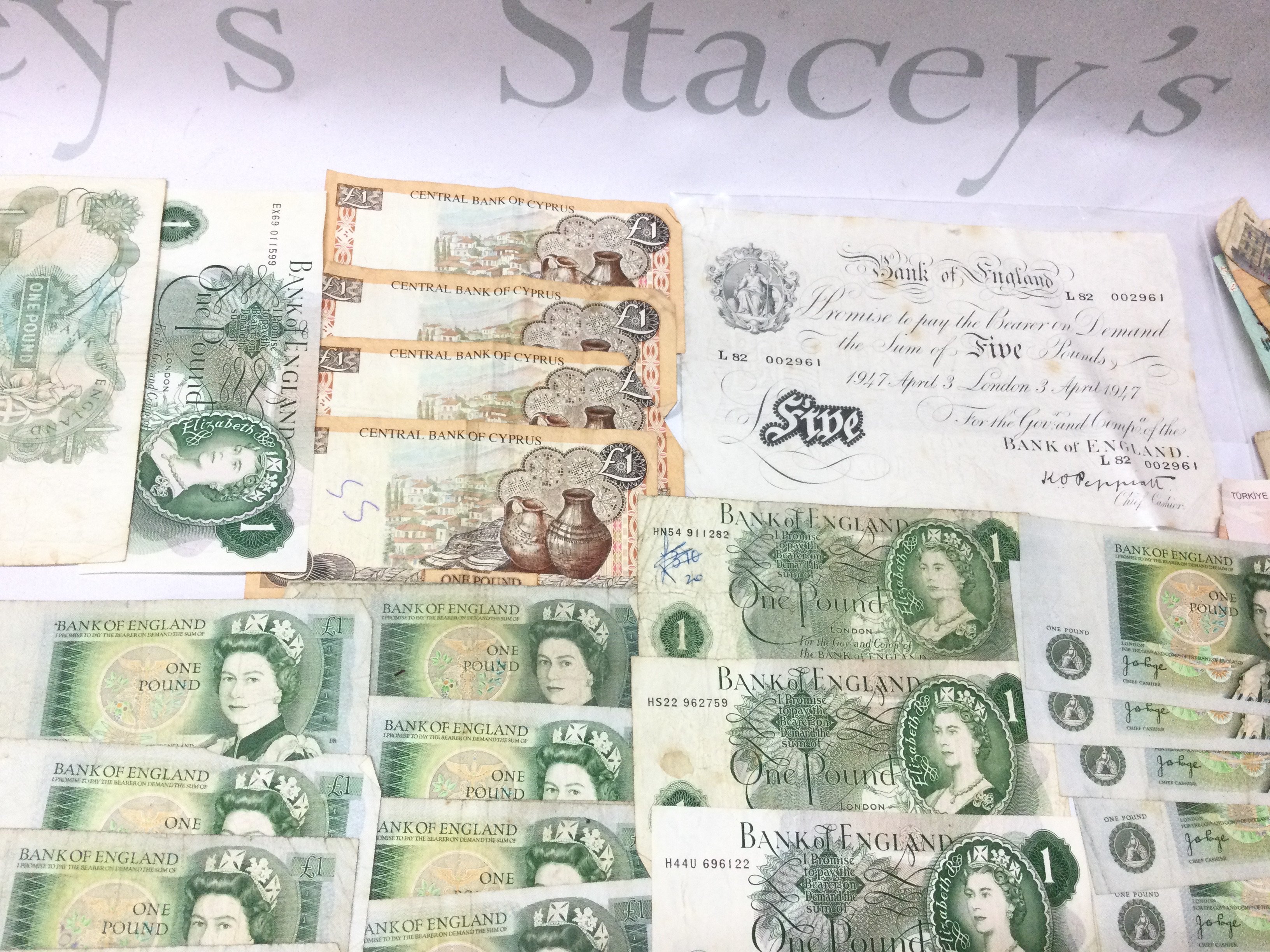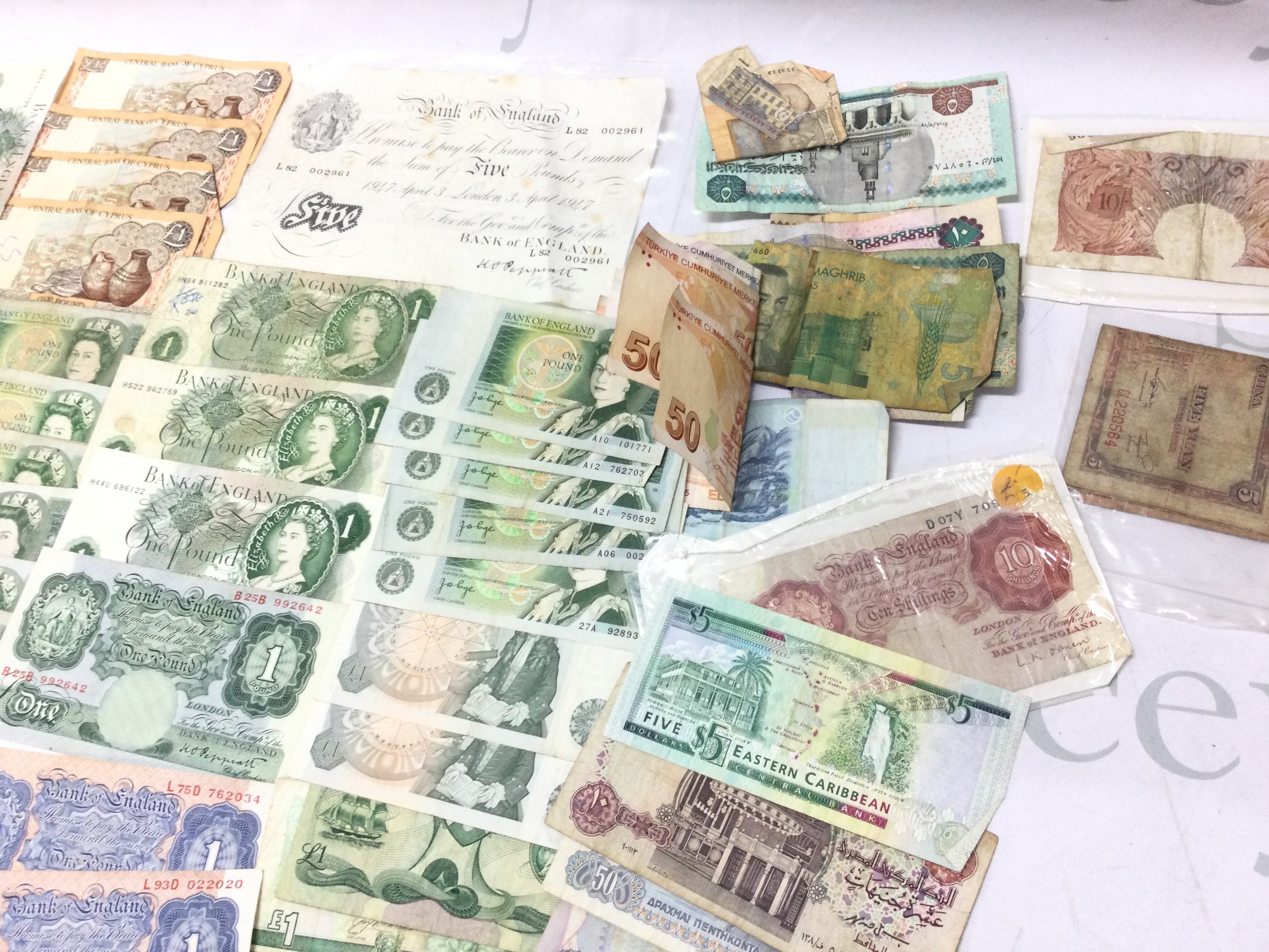 A large collection of uk and world bank notes including a white 5 note Postage A