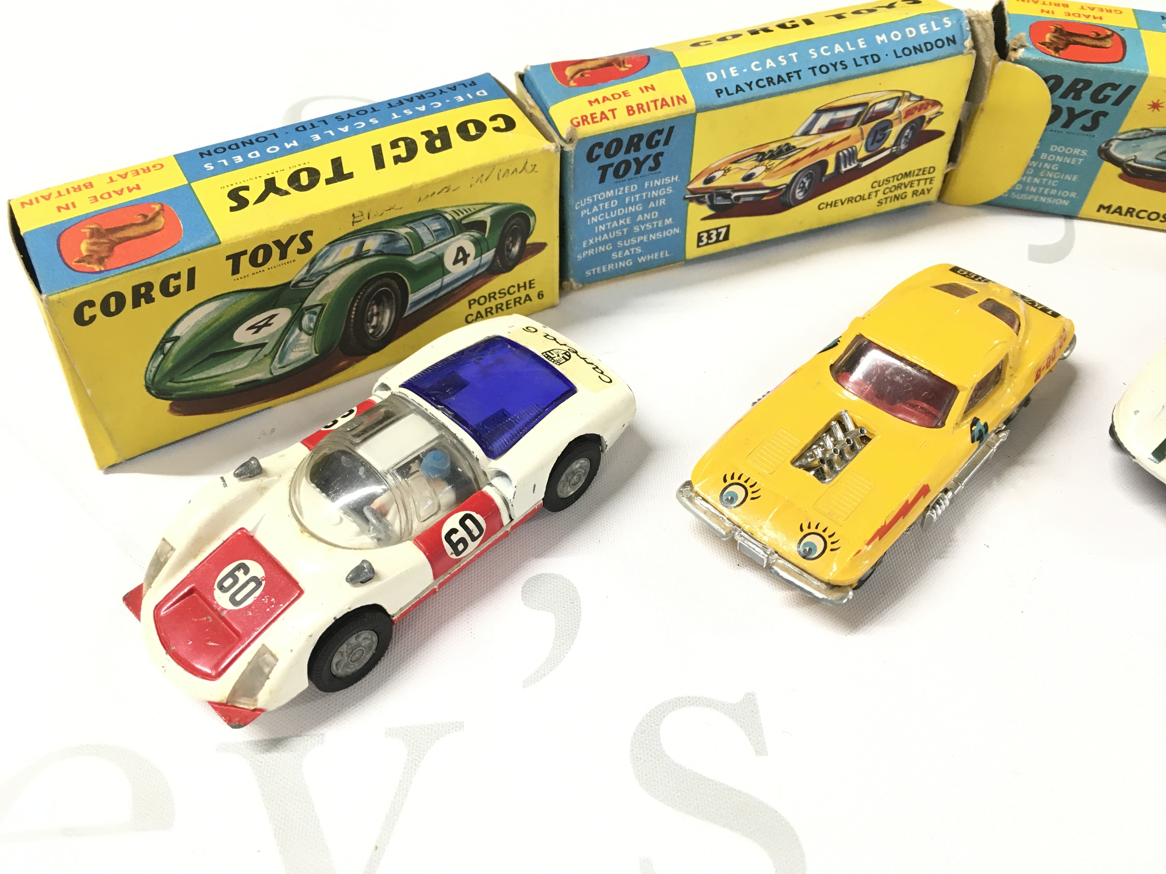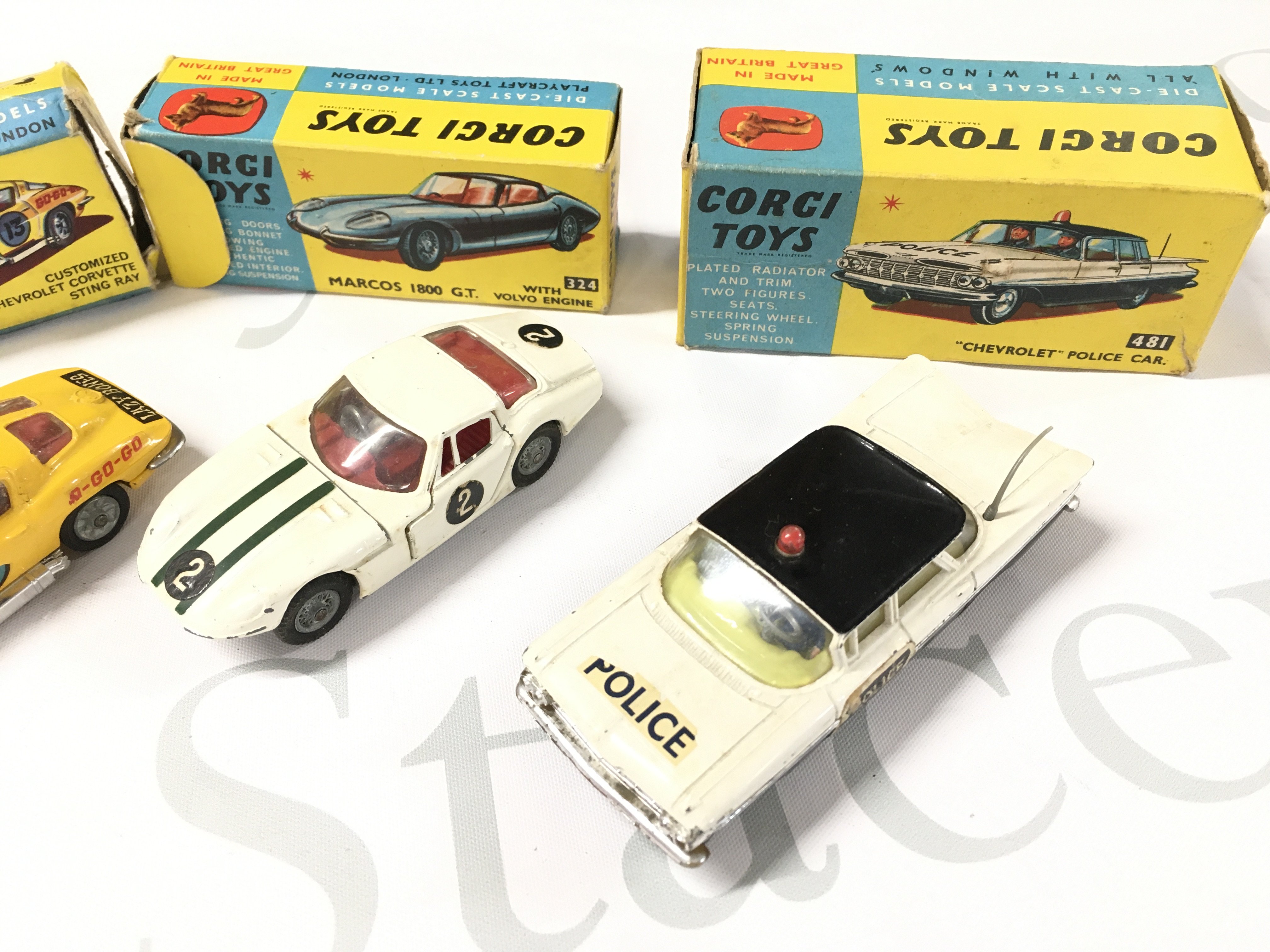 4 X Boxed Corgi Vehicles. A Porsche Carrera #330. A Customized Chevrolet Chevrolet Corvette Sting Ray #337. A Marcos 1800 G.T #324 And A Chevrolet Police Car #481.