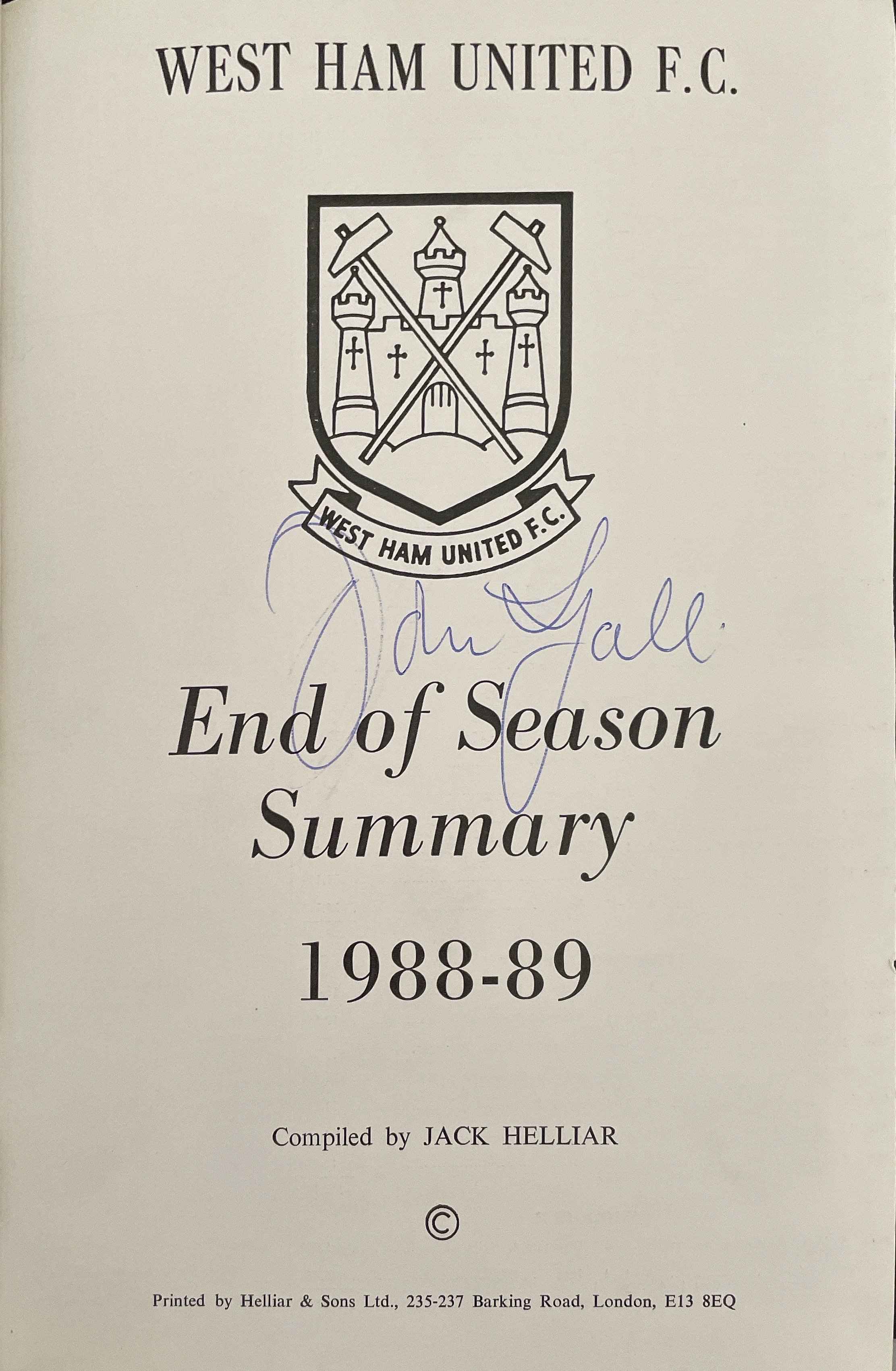 John Lyalls 88-89 West Ham Bound Volume Of Football Programmes: Official bound volume with around 50 programmes covering all home matches in the numbered set. Consists of all League FA Cup, League Cup, Reserves and Simod Cup. Front is embossed J Lyall and is signed by him inside on the summary of the season.