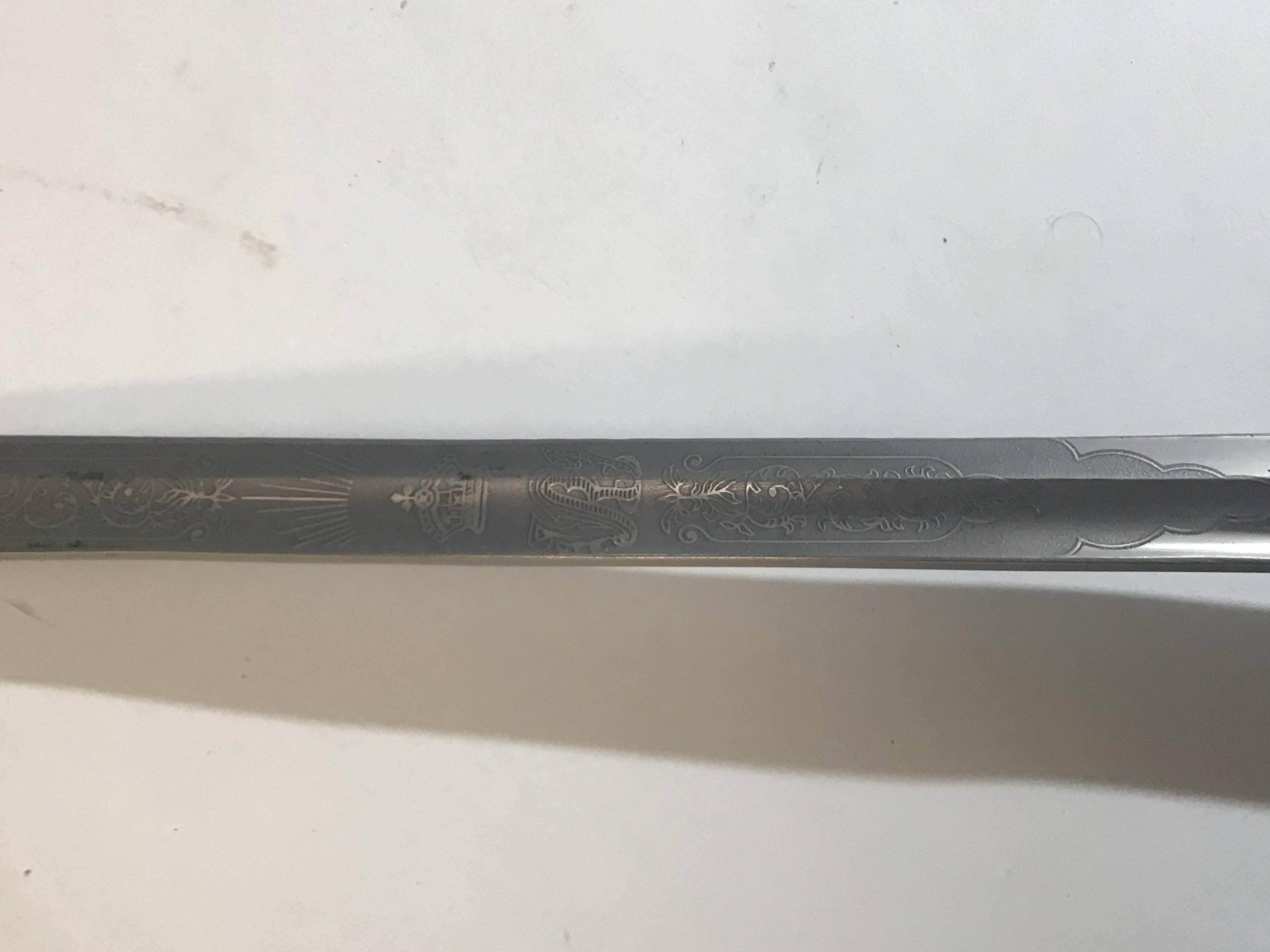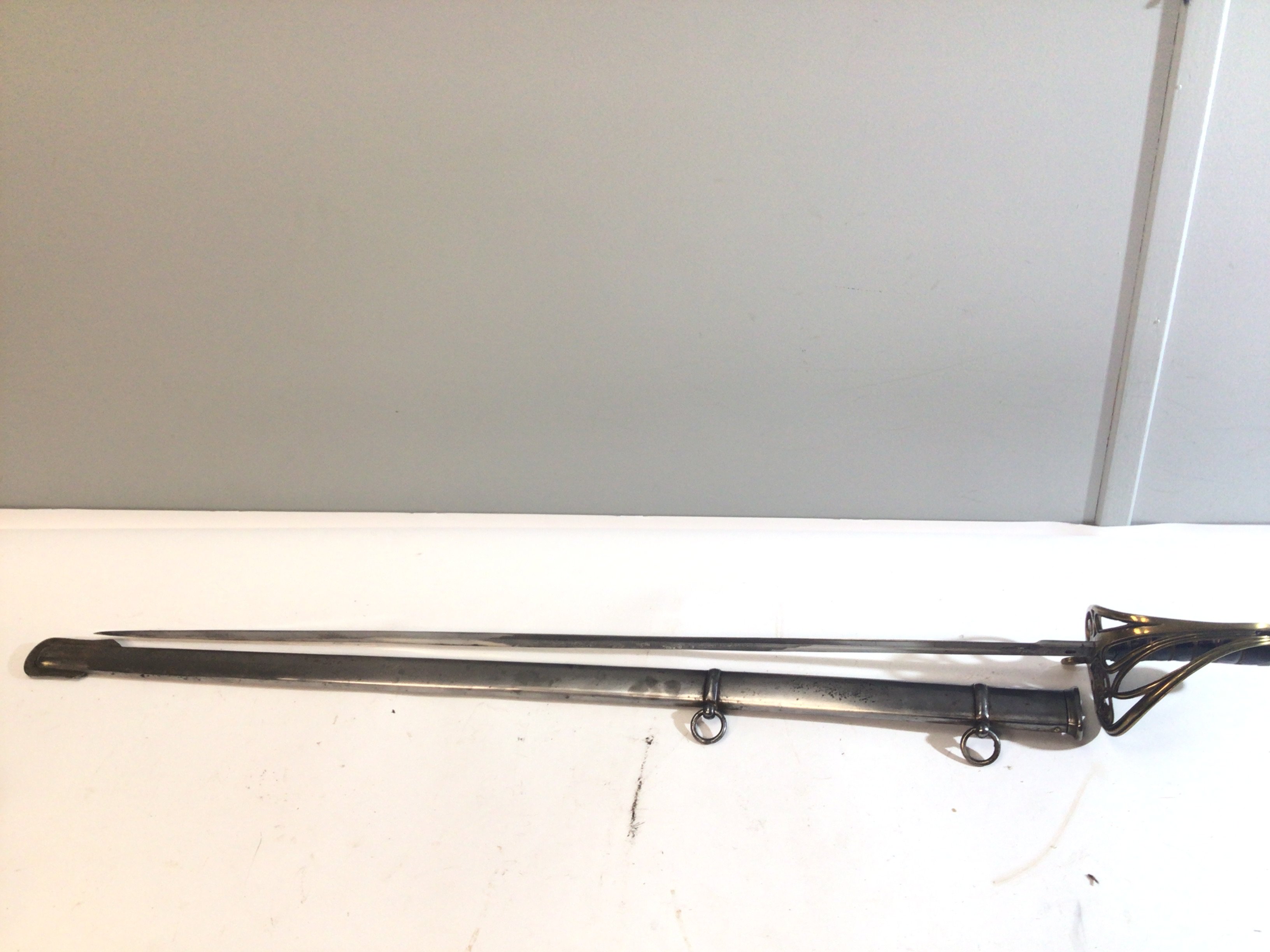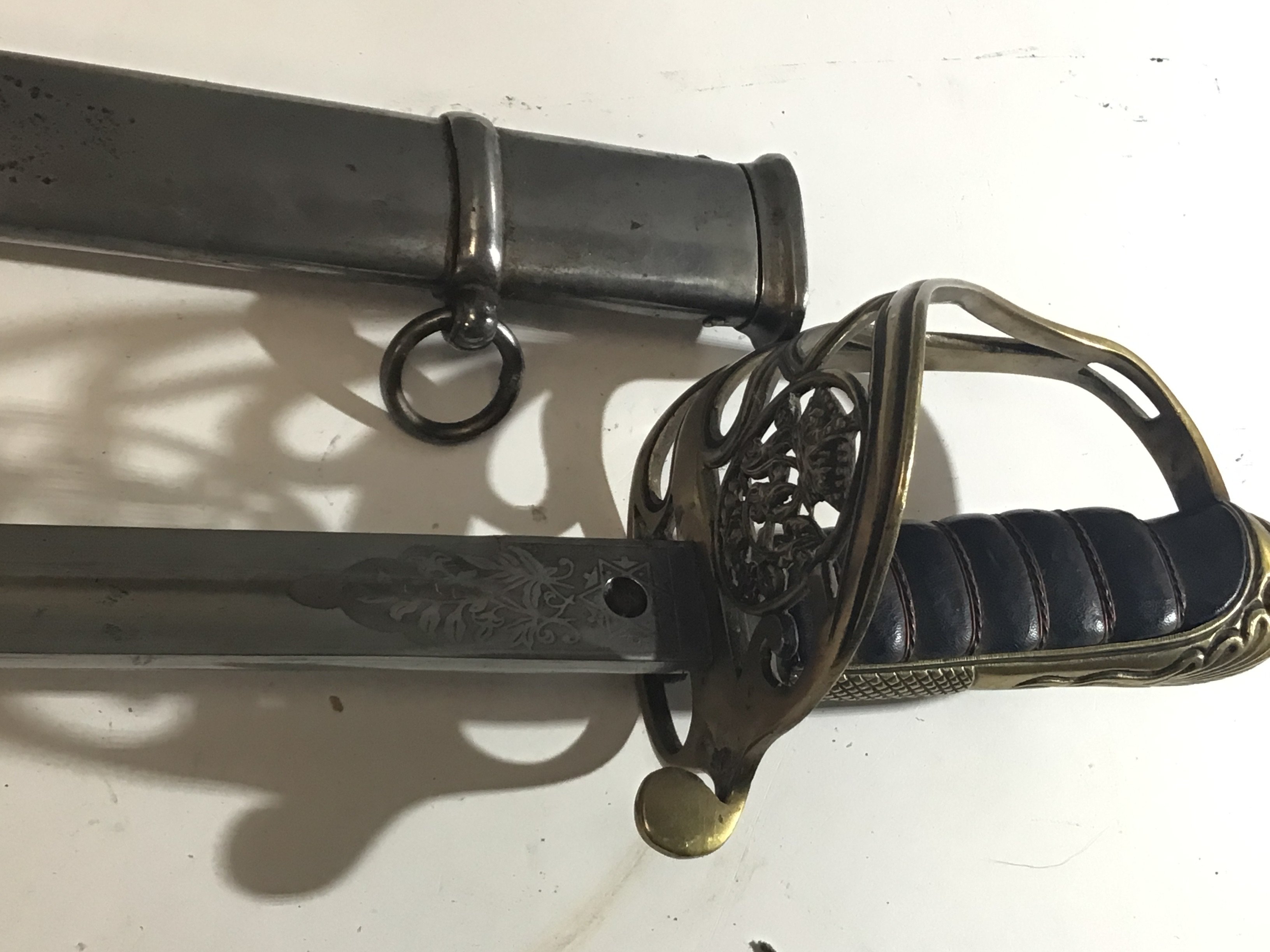 A Victorian officers sword with a brass hilt with Royal Cypher wired grip the steel blade with conforming Queen Victoria Cypher. With steel scabbed good condition in keeping with age.